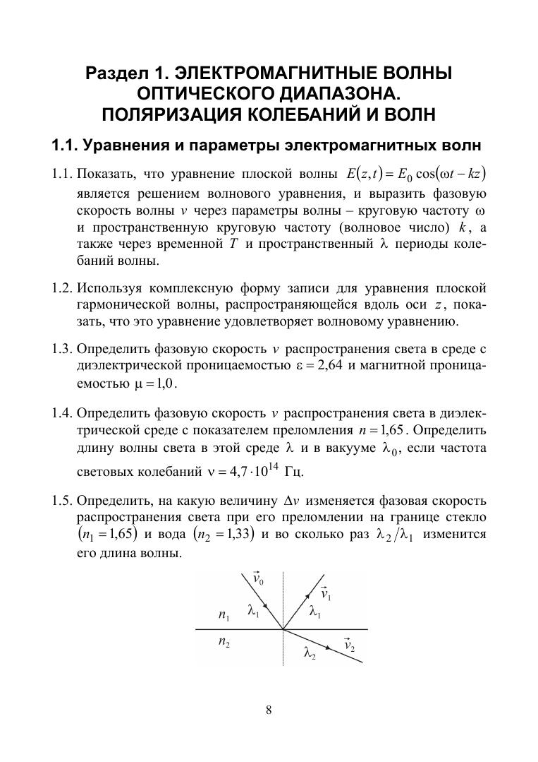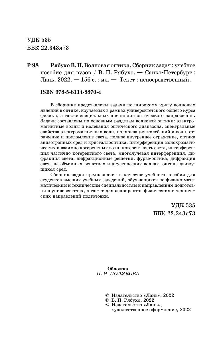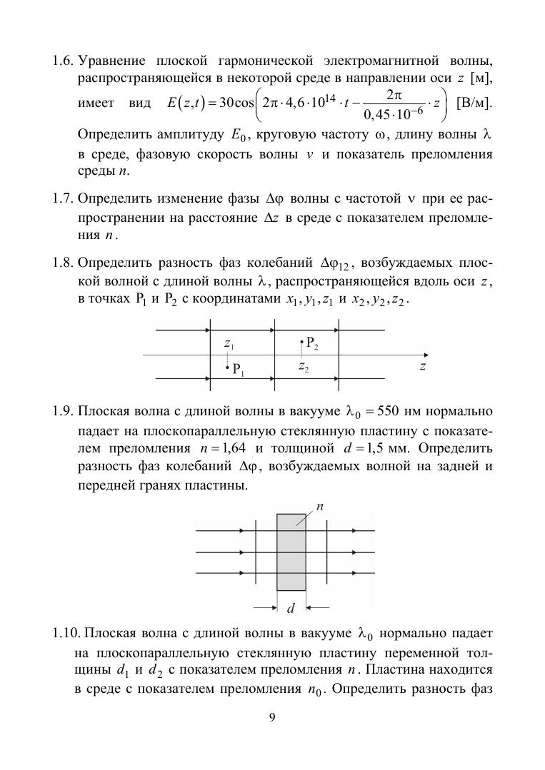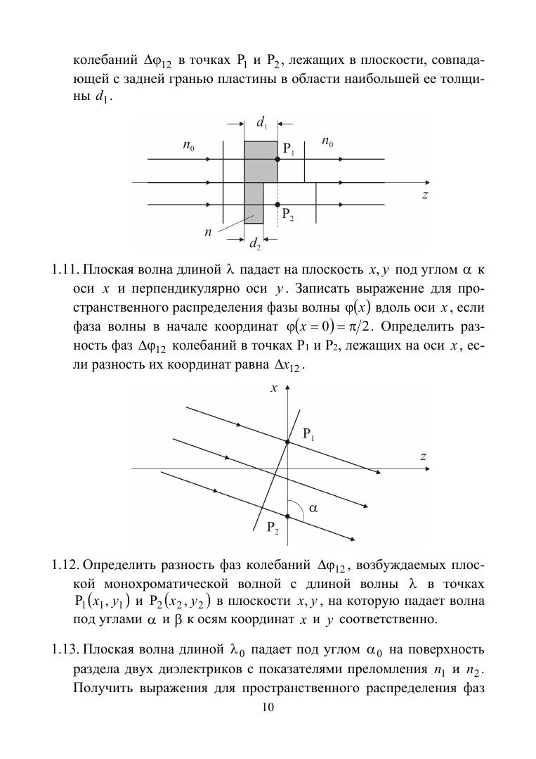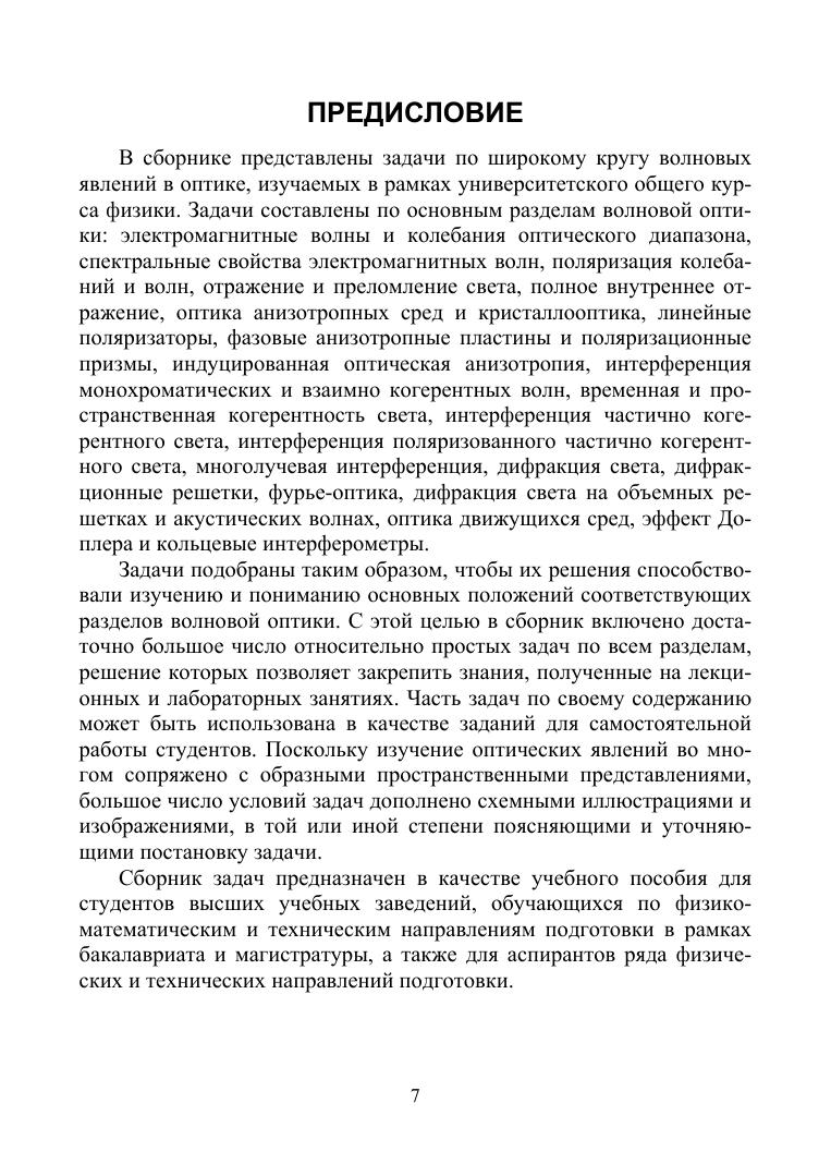 В сборнике представлены задачи по широкому кругу волновых явлений в оптике, изучаемых в рамках университетского общего курса физики, а также специальных дисциплин оптического направления. Задачи составлены по основным разделам волновой оптики: электро-магнитные волны и колебания оптического диапазона, спектральные свойства электромагнитных волн, поляризация колебаний и волн, отражение и преломление света, полное внутреннее отражение, оптика анизотропных сред и кристаллооптика, интерференция монохроматических и взаимно когерентных волн, когерентность света, интерференция частично когерентного света, многолучевая интерференция, дифракция света, дифракционные решетки, фурье-оптика, дифракция света на объемных решетках и акустических волнах, оптика движущихся сред.