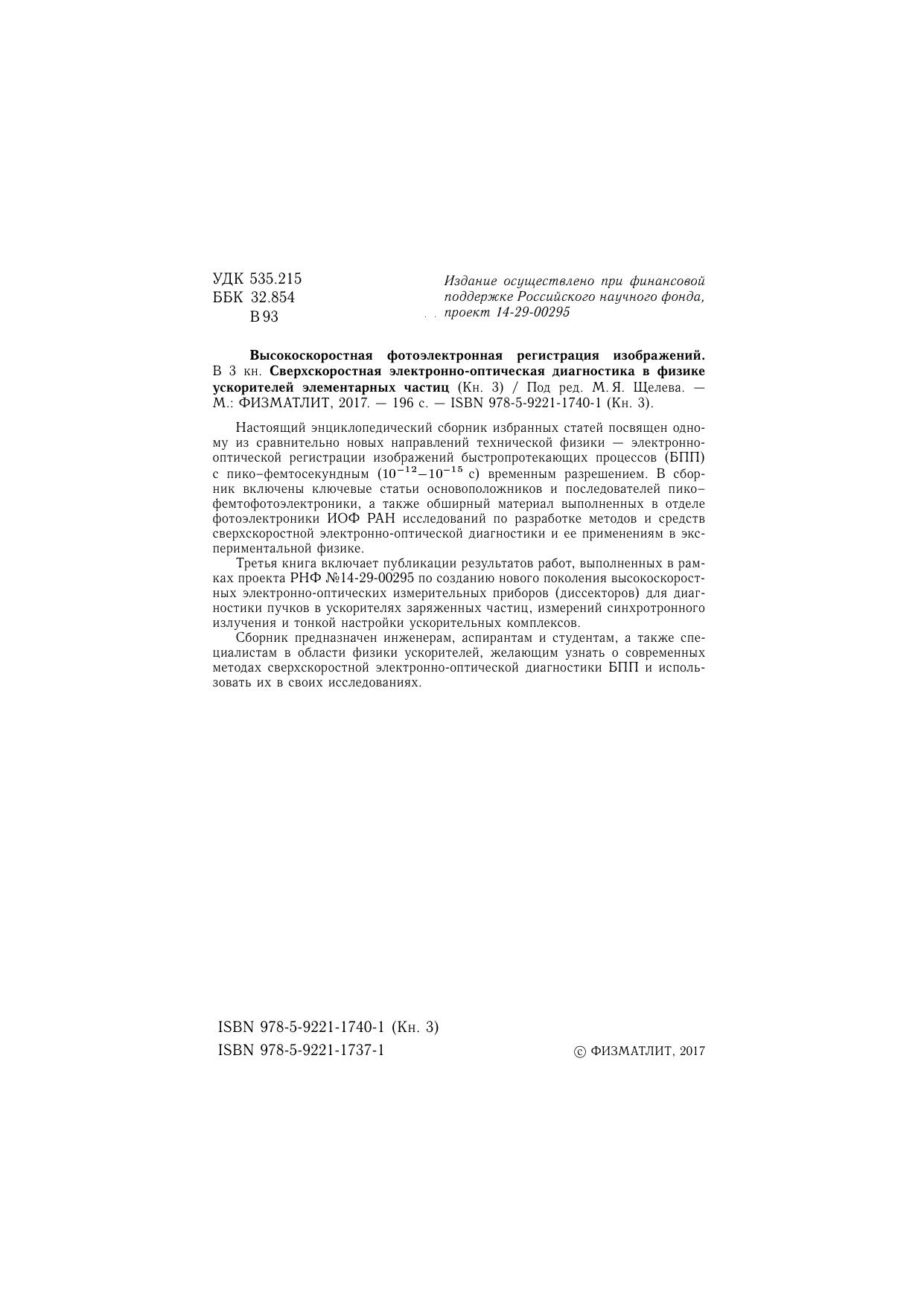 Настоящий энциклопедический сборник избранных статей посвящен одному из сравнительно новых направлений технической физики — электронно-оптической регистрации изображений быстропротекающих процессов (БПП) с пико–фемтосекундным, временным разрешением. В сборник включены ключевые статьи основоположников и последователей пико–фемтофотоэлектроники, а также обширный материал выполненных в отделе фотоэлектроники ИОФ РАН исследований по разработке методов и средств сверхскоростной электронно-оптической диагностики и ее применениям в экспериментальной физике. Третья книга включает публикации результатов работ, выполненных в рамках проекта РНФ №14-29-00295 по созданию нового поколения высокоскоростных электронно-оптических измерительных приборов (диссекторов) для диагностики пучков в ускорителях заряженных частиц, измерений синхротронного излучения и тонкой настройки ускорительных комплексов. Сборник предназначен инженерам, аспирантам и студентам, а также специалистам в области физики ускорителей, желающим узнать о современных методах сверхскоростной электронно-оптической диагностики БПП и использовать их в своих исследованиях.