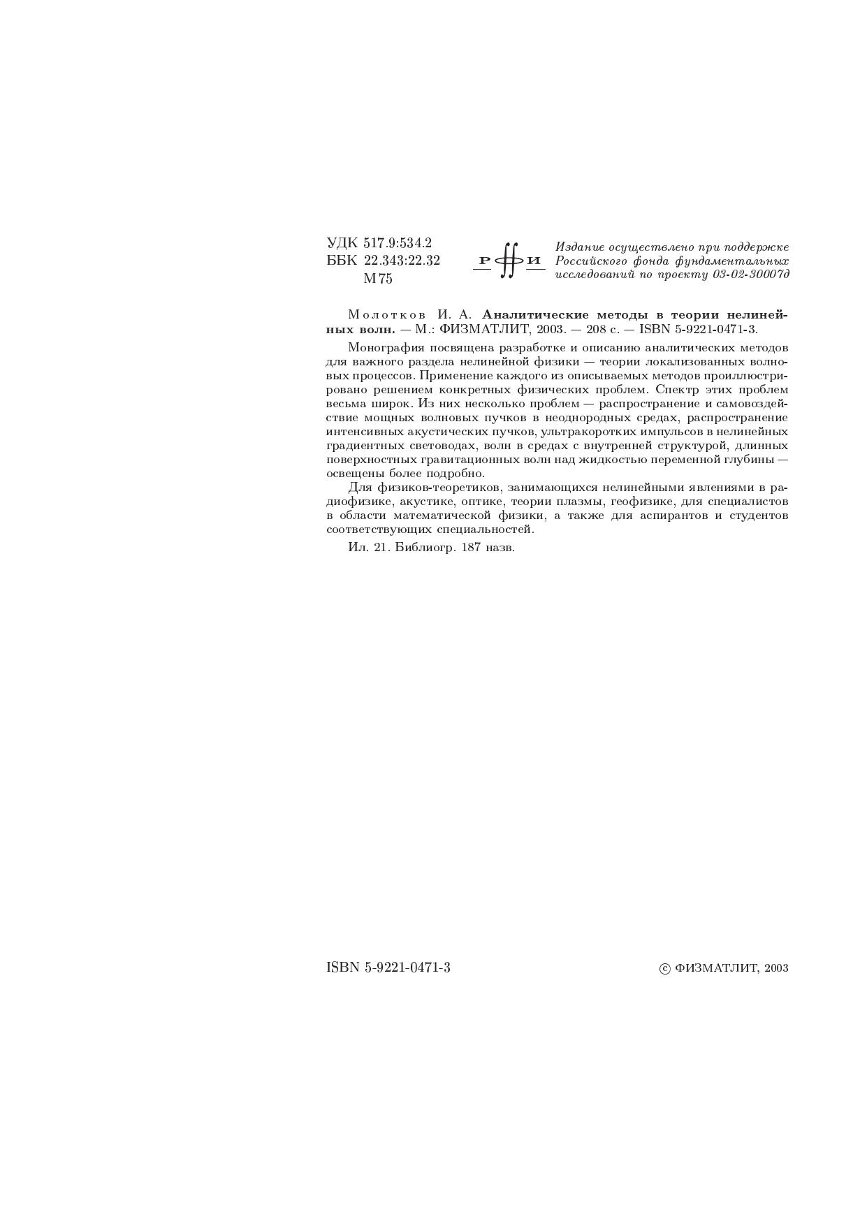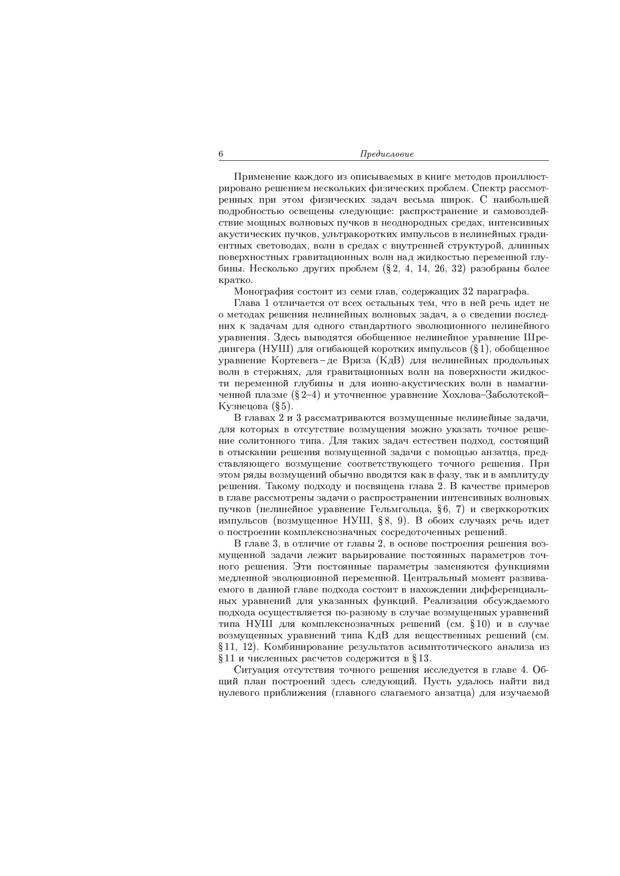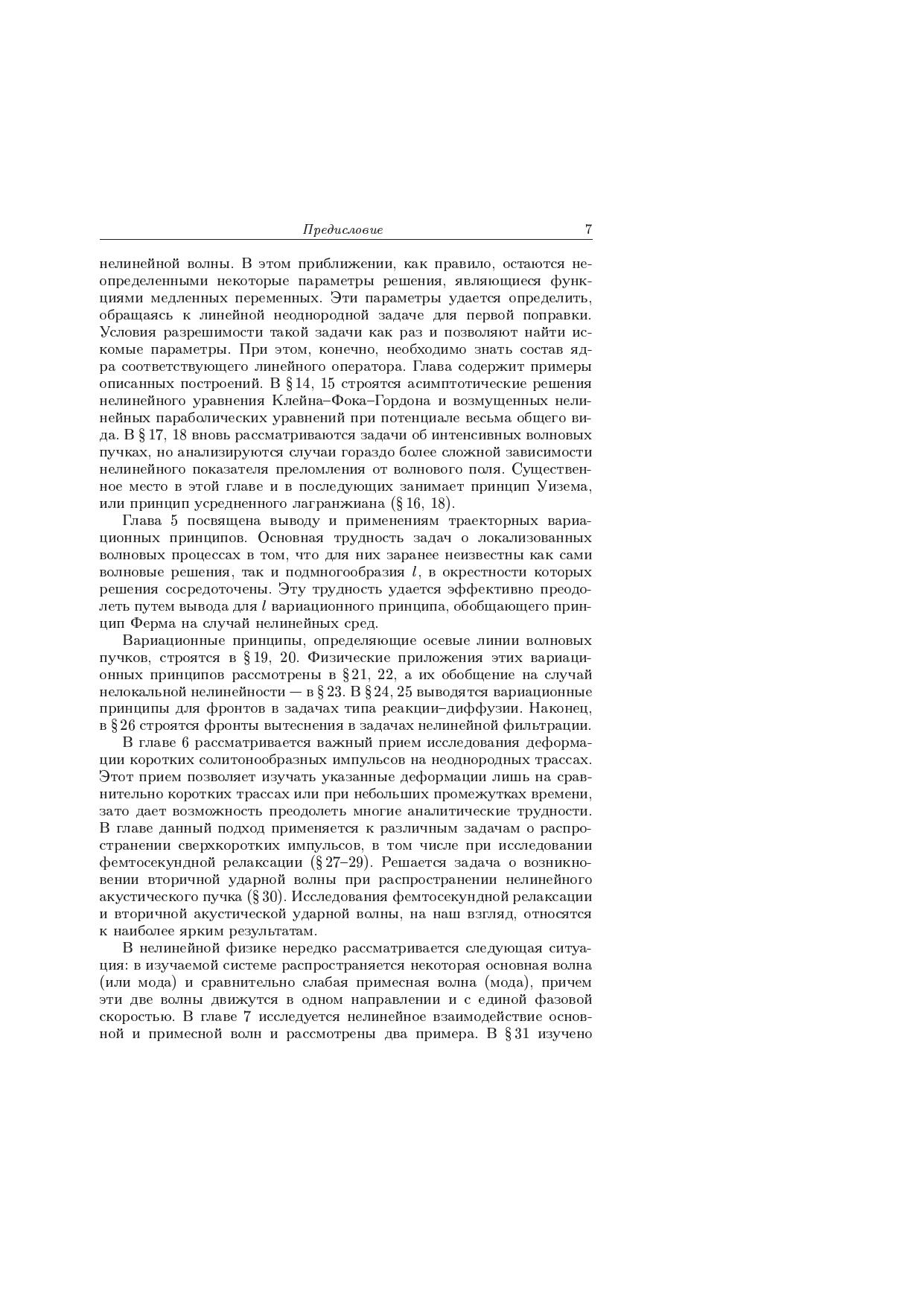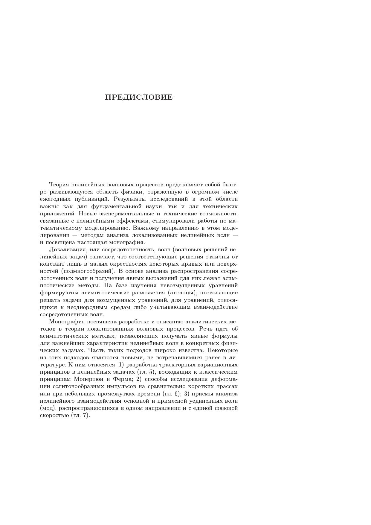 Монография посвящена разработке и описанию аналитических методов для важного раздела нелинейной физики - теории локализованных волновых процессов. Применение каждого из описываемых методов проиллюстрировано решением конкретных физических проблем. Спектр этих проблем весьма широк. Из них несколько проблем - распространение и самовоздействие мощных волновых пучков в неоднородных средах, интенсивных акустических пучков, ультракоротких импульсов в нелинейных градиентных световодах, волн в средах с внутренней структурой, длинных поверхностных гравитационных волн над жидкостью переменной глубины - освещены с наибольшей подробностью. Для физиков-теоретиков, занимающихся нелинейными явлениями в радиофизике, акустике, оптике, теории плазмы, геофизике, для специалистов в области математической физики, а также для аспирантов и студентов соответствующих специальностей