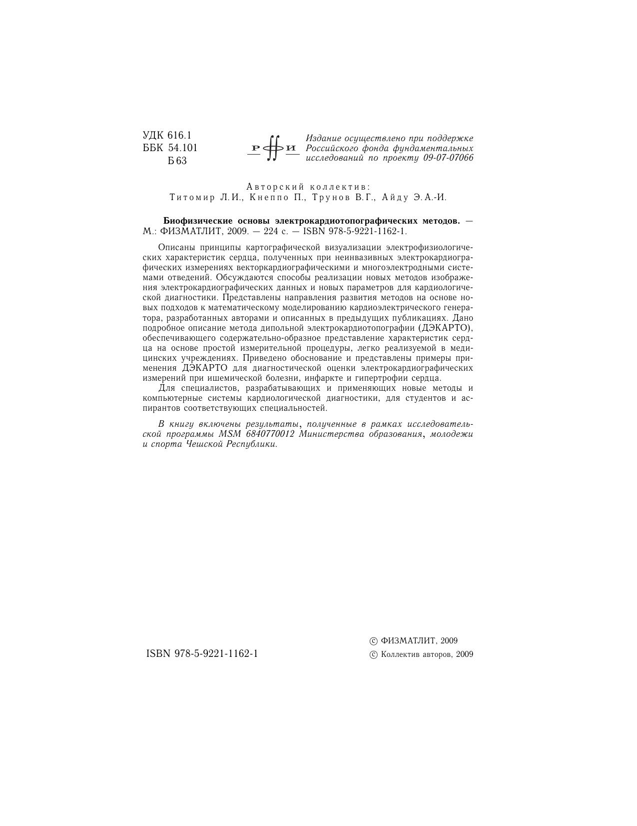 Описаны принципы картографической визуализации электрофизиологических характеристик сердца, полученных при неинвазивных электрокардиографических измерениях векторкардиографическими и многоэлектродными системами отведений. Обсуждаются способы реализации новых методов изображения электрокардиографических данных и новых параметров для кардиологической диагностики. Представлены направления развития методов на основе новых подходов к математическому моделированию кардиоэлектрического генератора, разработанных авторами и описанных в предыдущих публикациях. Дано подробное описание метода дипольной электрокардиотопографии (ДЭКАРТО), обеспечивающего содержательно-образное представление характеристик сердца на основе простой измерительной процедуры, легко реализуемой в медицинских учреждениях. Приведено обоснование и представлены примеры применения ДЭКАРТО для диагностической оценки электрокардиографических измерений при ишемической болезни, инфаркте и гипертрофии сердца. Для специалистов, разрабатывающих и применяющих новые методы и компьютерные системы кардиологической диагностики, для студентов и аспирантов соответствующих специальностей.