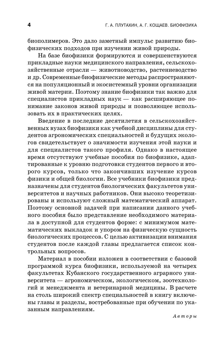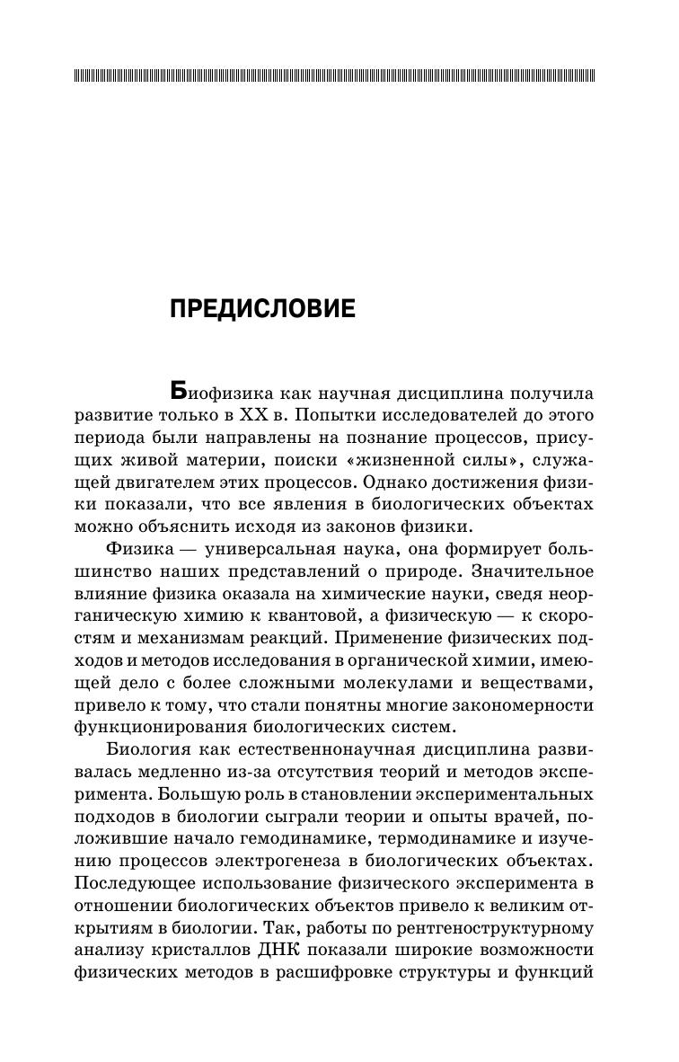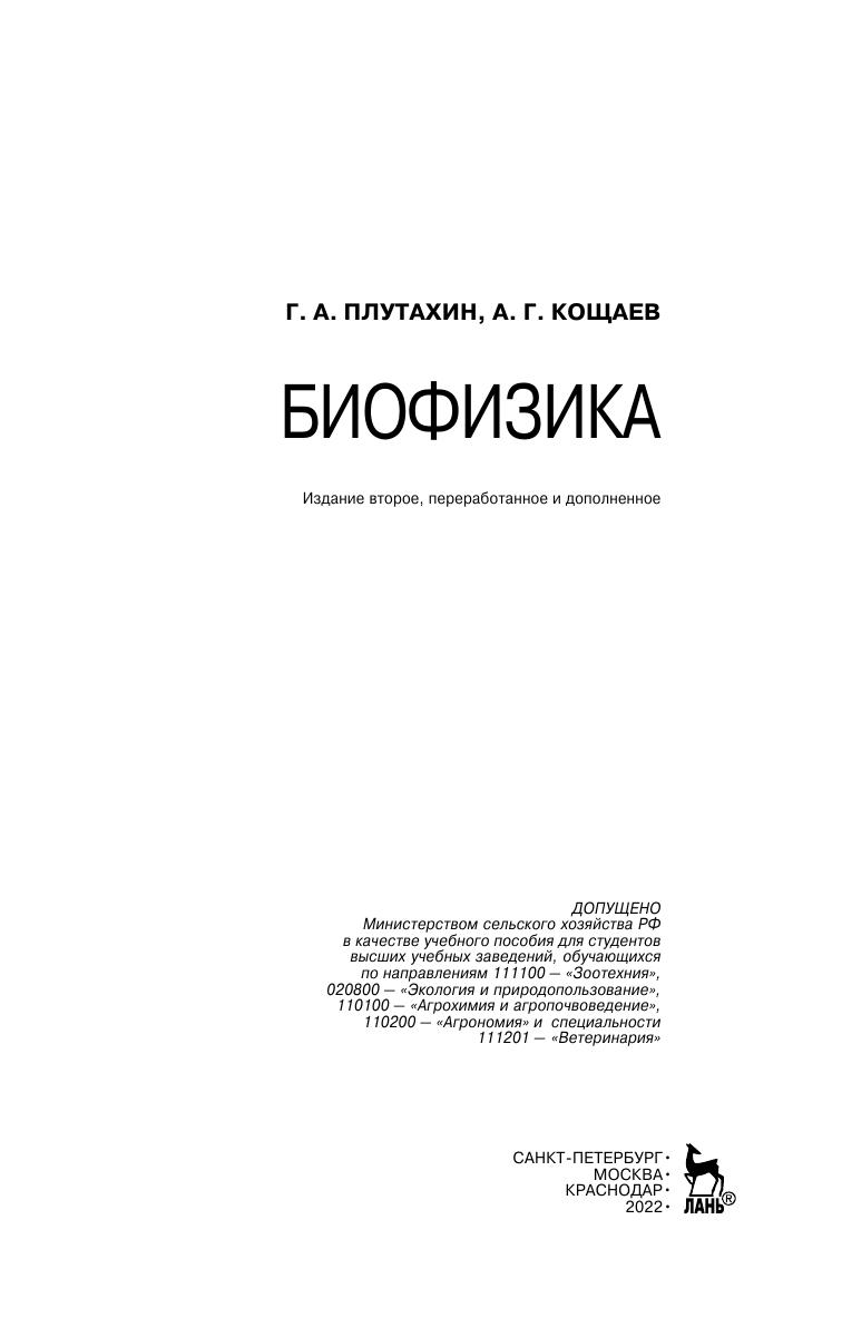 Учебное пособие cодержит основные сведения по биофизике. Отдельные главы посвящены термодинамике открытых систем, гемодинамике, математическому моделированию биологических и экологических процессов, основам теории информации. Большое внимание уделено структуре и функции биологических мембран, их биофизике. Рассмотрены фотобиологические процессы и основы биоэнергетики на примере фотосинтеза. Приведены примеры использования биофизических методов в агропромышленном комплексе и перспективы их применения. Предназначено для студентов ветеринарных, агрономических и экологических специальностей аграрных вузов.
