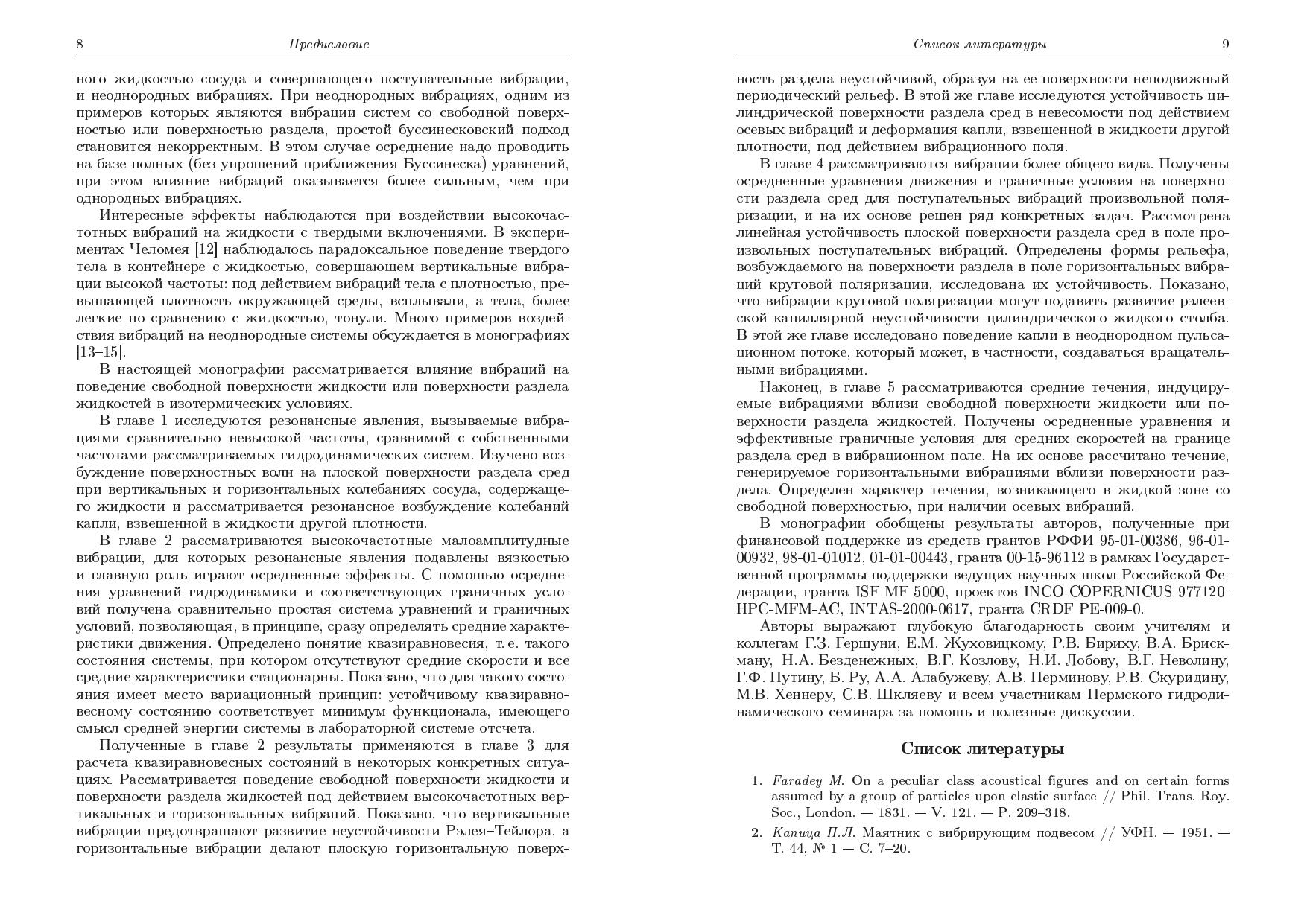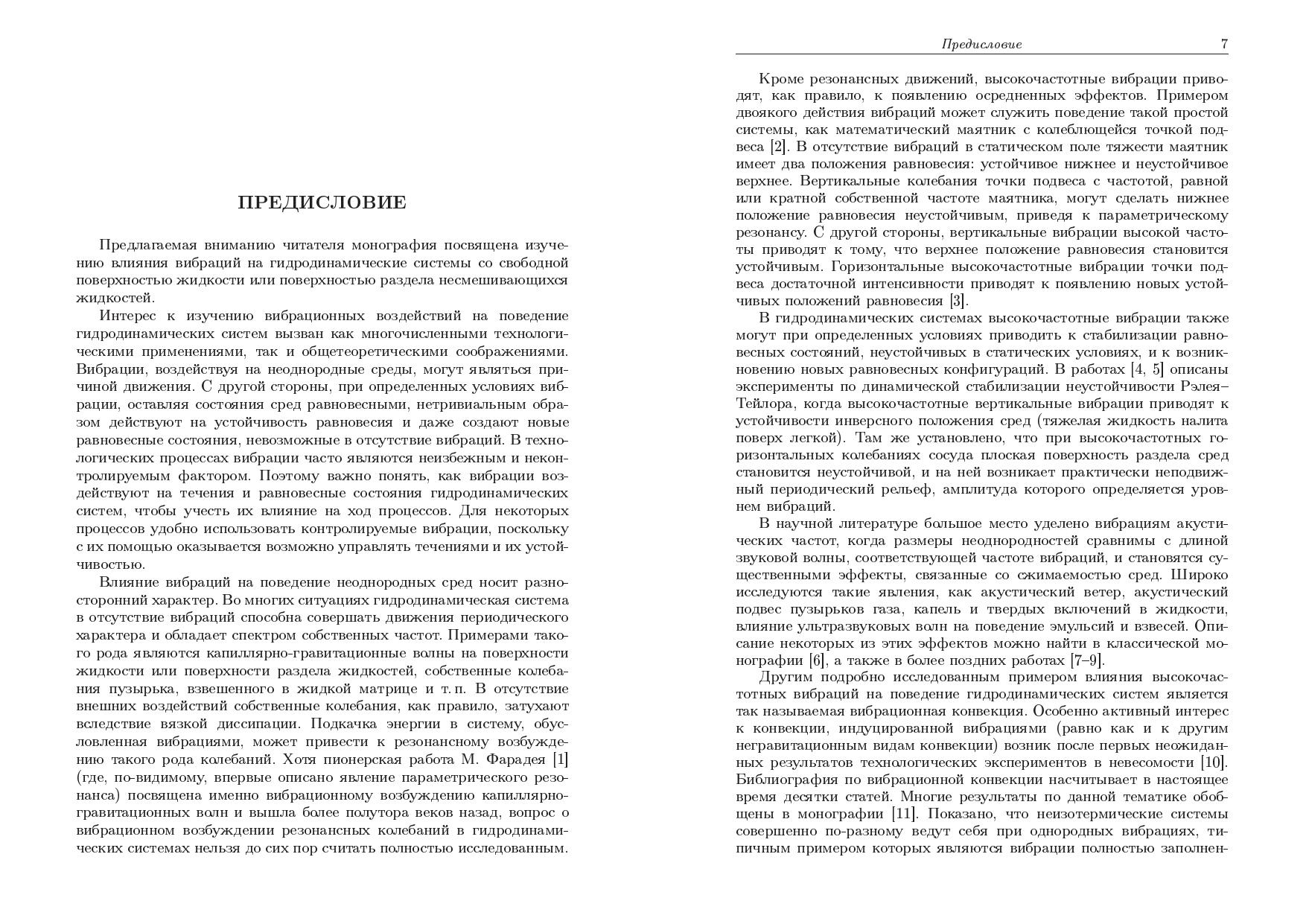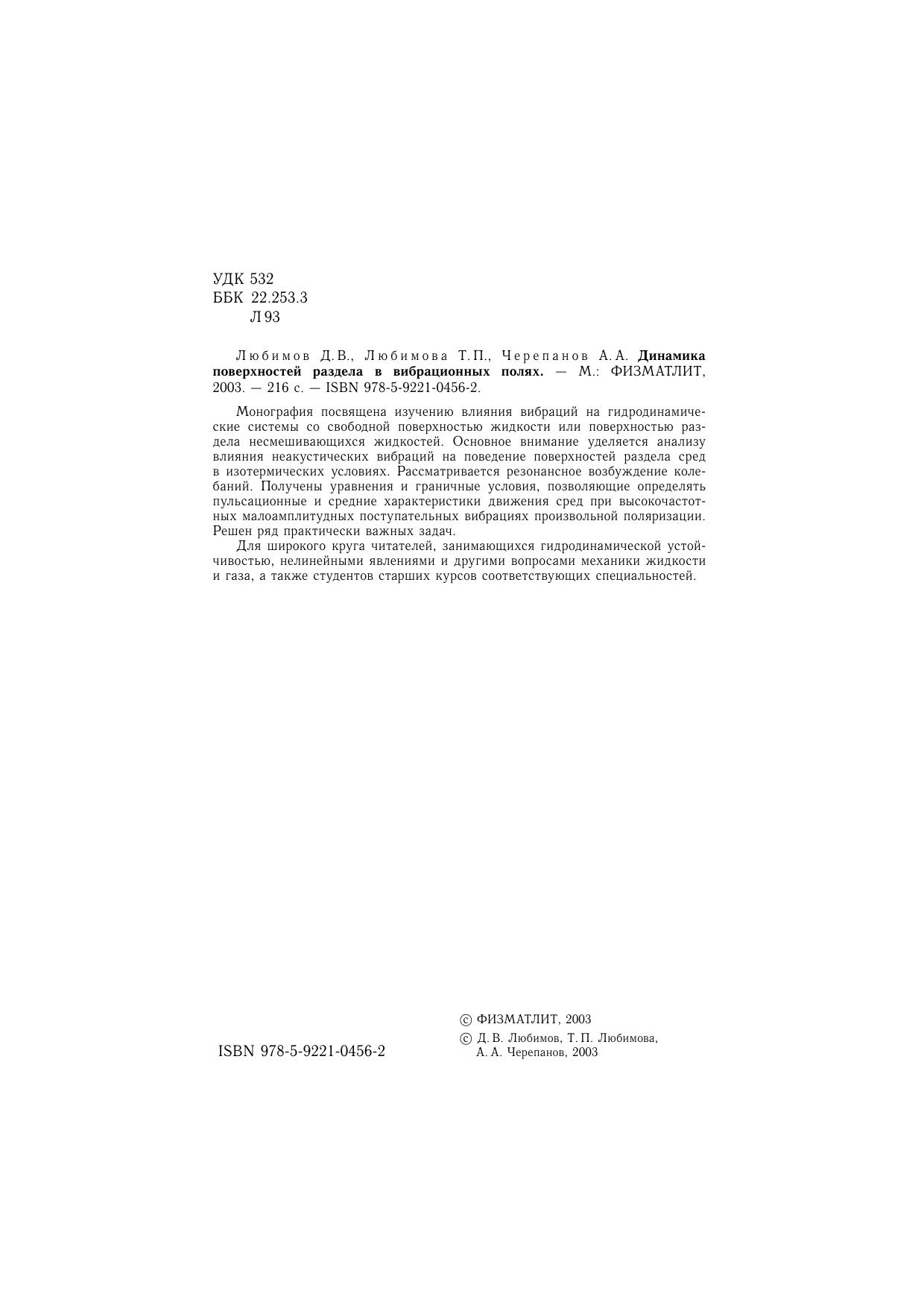 Монография посвящена изучению влияния вибраций на гидродинамические системы со свободной поверхностью жидкости или поверхностью раздела несмешивающихся жидкостей. Основное внимание уделяется анализу влияния неакустических вибраций на поведение поверхностей раздела сред в изотермических условиях. Рассматривается резонансное возбуждение колебаний. Получены уравнения и граничные условия, позволяющие определять пульсационные и средние характеристики движения сред при высокочастотных малоамплитудных поступательных вибрациях произвольной поляризации. Решен ряд практически важных задач. Для широкого круга читателей, занимающихся гидродинамической устойчивостью, нелинейными явлениями и другими вопросами механики жидкости и газа, а также студентов старших курсов соответствующих специальностей