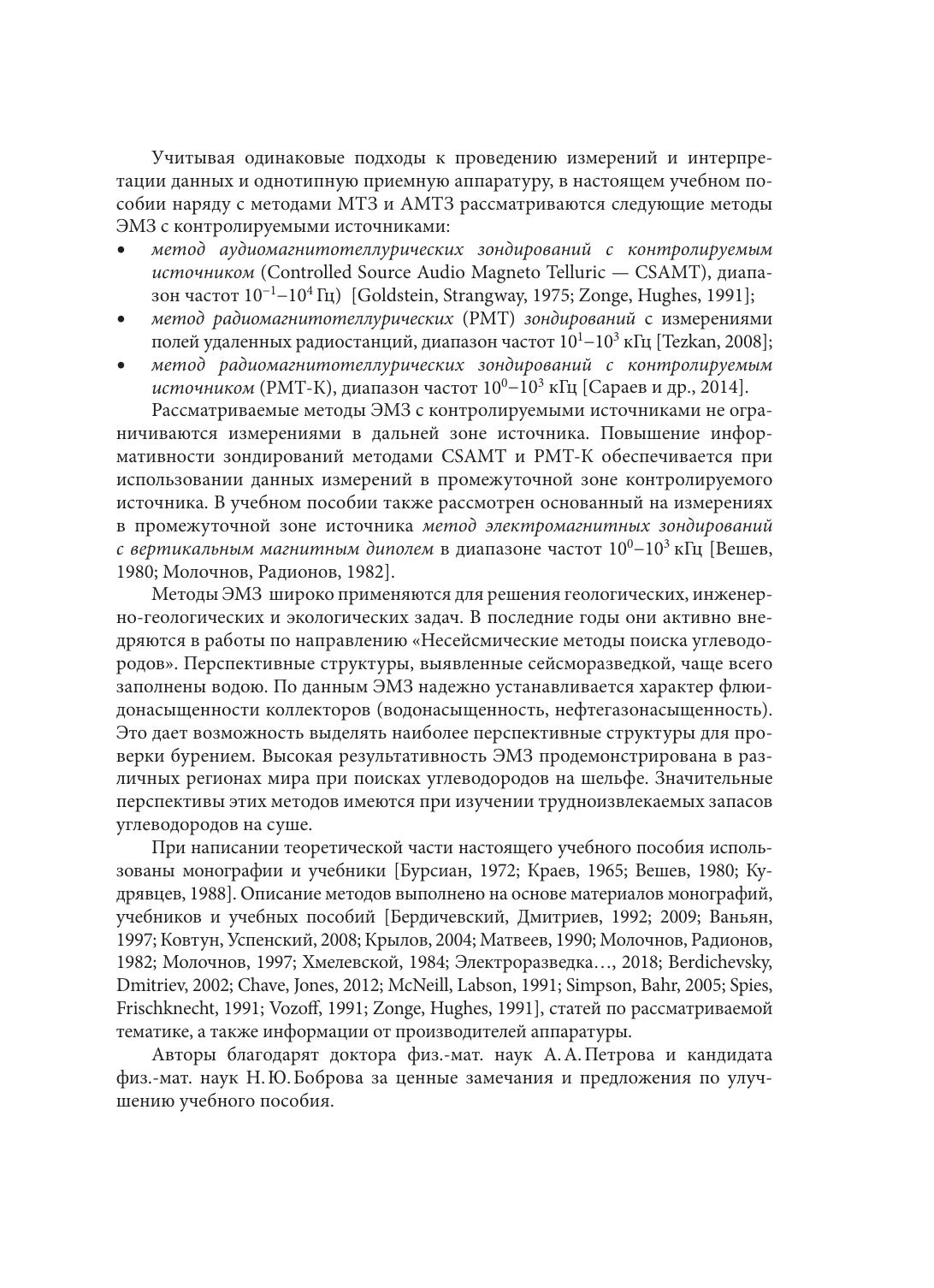 Рассмотрены физические основы методов электромагнитных зондирований, основанных на использовании естественных электромагнитных полей и гармонических изменяющихся электромагнитных полей искусственных (контролируемых) источников. Приведено описание методов и аппаратуры магнитотеллурических и аудиомагнитотеллурических зондирований, аудиомагнитотеллурических зондирований с контролируемым источником, электромагнитных зондирований с вертикальным магнитным диполем, радиомагнитотеллурических зондирований с измерениями полей удаленных радиостанций и контролируемого источника. Учебное пособие предназначено для студентов бакалавриата и магистратуры, обучающихся по направлению "Геофизика", а также для обучающихся Передовой инженерной школы СПбГУ "Междисциплинарные исследования, технологии и бизнес-процессы для минерально-сырьевого комплекса России".