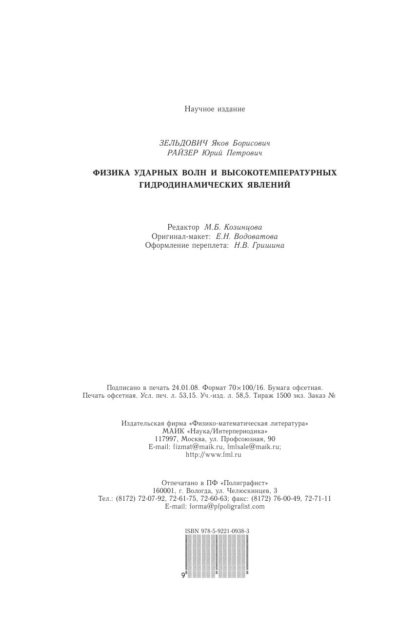 В книге рассматривается обширный круг вопросов из различных областей физики, физической химии, астрофизики, с которыми имеет дело газо- и гидродинамика, Излагаются основы газовой динамики и теория ударных волн, теория переноса излучения. Рассматриваются термодинамические и оптические свойства вещества при высоких температурах и давлениях, кинетика диссоциации, ионизации и других неравновесных процессов, явления, связанные с излучением света и лучистым теплообменом в ударных волнах и при взрывах, вопросы распространения ударных волн в твердых телах и т. д. Авторам монографии принадлежит большое число оригинальных работ в рассматриваемой области науки, которые нашли свое отражение в книге.Книга послужит ценным практическим пособием для широких кругов физиков, механиков и инженеров, занимающихся прикладной физикой и новой техникой. Она будет полезна студентам и аспирантам соответствующих специальностей, а также всем физикам и механикам, желающим познакомиться с основами науки об ударных волнах.