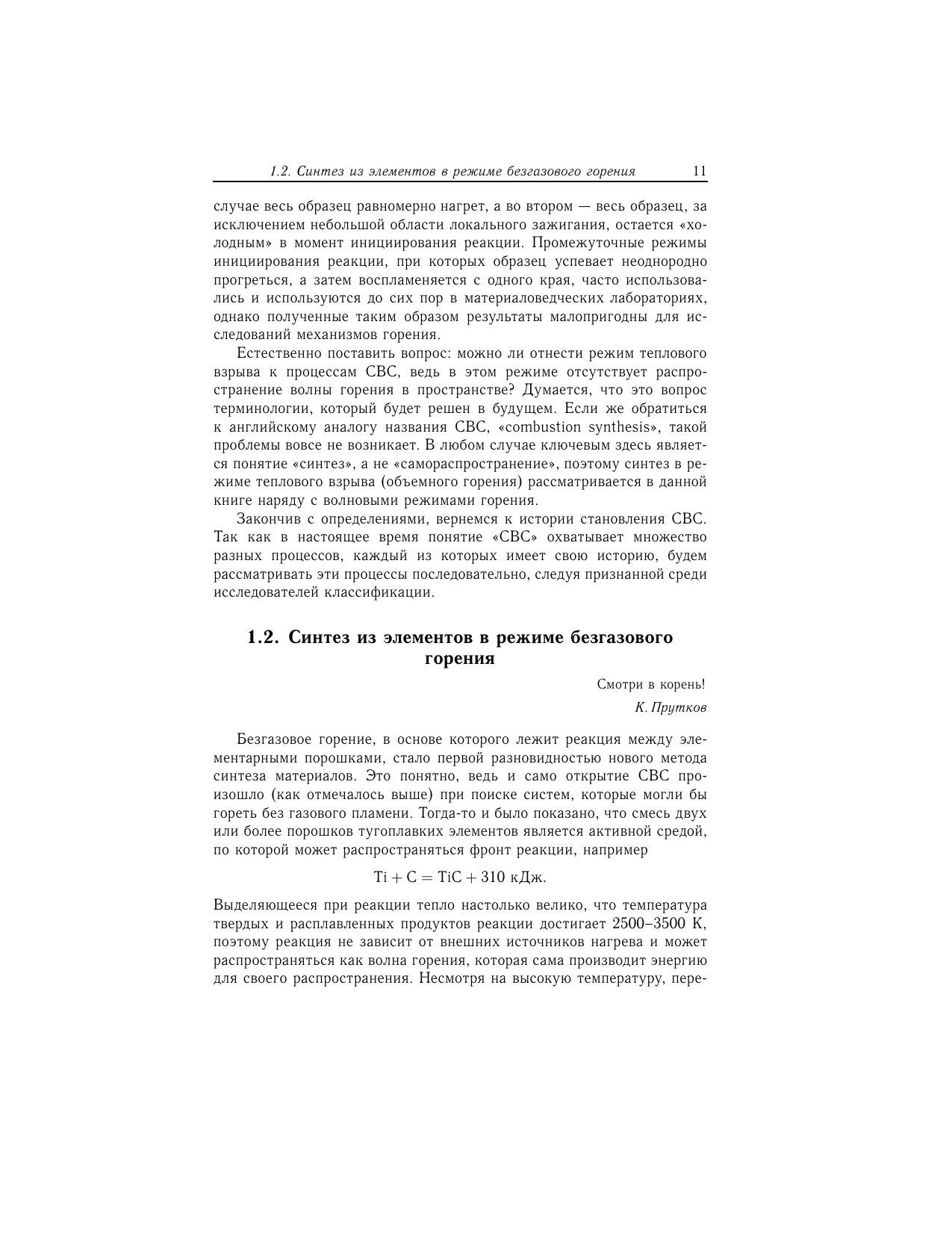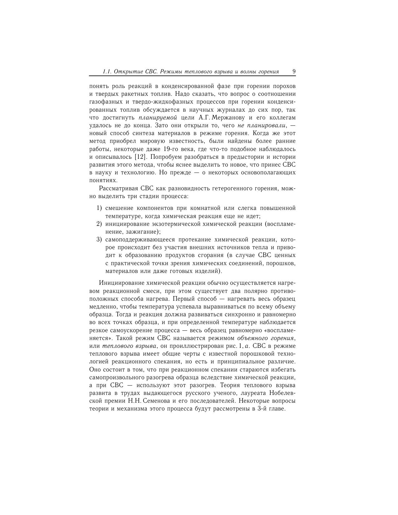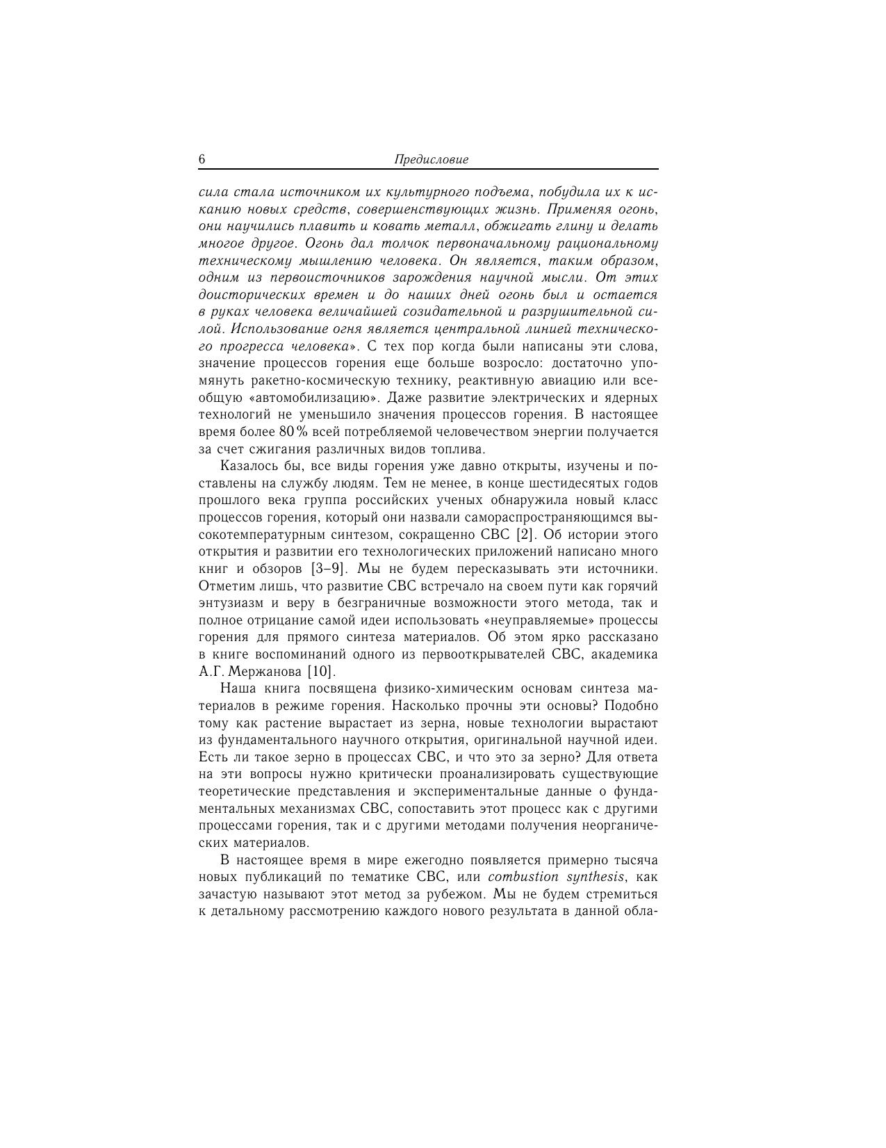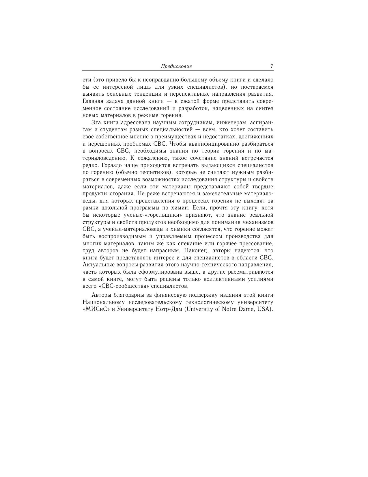 Монография посвящена процессам горения, которые используются для прямого синтеза материалов. Открытые около 45 лет назад в России, эти процессы послужили созданию метода самораспространяющегося высокотемпературного синтеза (СВС), который получил широкое признание в мировой науке и технологии. В книге проведены анализ и обобщение экспериментальных и теоретических результатов за весь период существования СВС, а также опыта промышленного использования этого метода. Основное внимание сфокусировано на результатах, полученных за последние 10-15 лет. Рассмотрены центральные вопросы нового научного направления, зародившегося на стыке физической химии и физического материаловедения – структурной макрокинетики, такие как механизмы гетерогенных реакций и формирования структуры твердых продуктов в режимах горения и теплового взрыва, способы управления данными процессами возможности использования особенностей СВС для получения конкурентоспособных продуктов и материалов перспективы будущего развития этой области науки. Книга адресована ученым, работающим как в области физико-химии горения, так и в области физического материаловедения, аспирантам, студентам и всем читателям, интересующимся наукой и современными технологиями. Издание осуществлено при поддержке Национального исследовательского университета "МИСиС" и Университета Нотр-Дам (University of Notre Dame, USA).