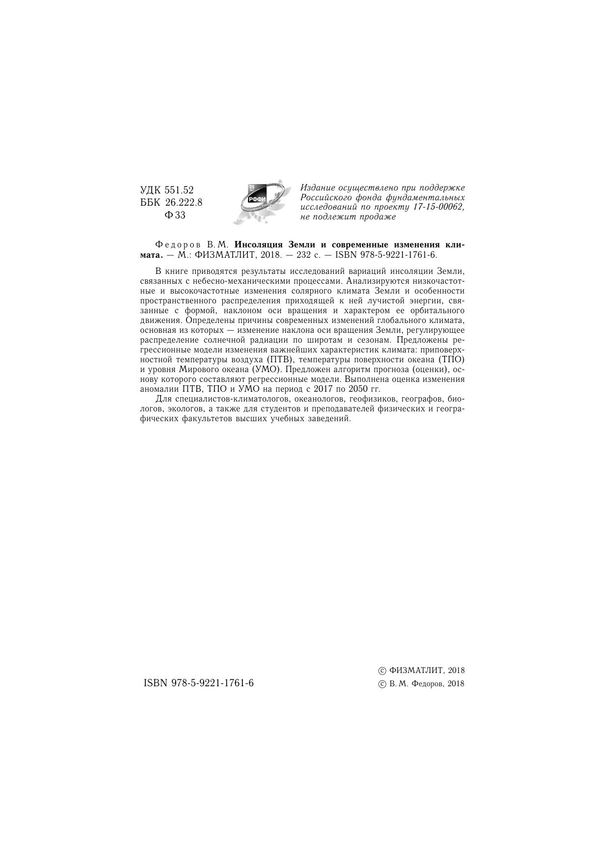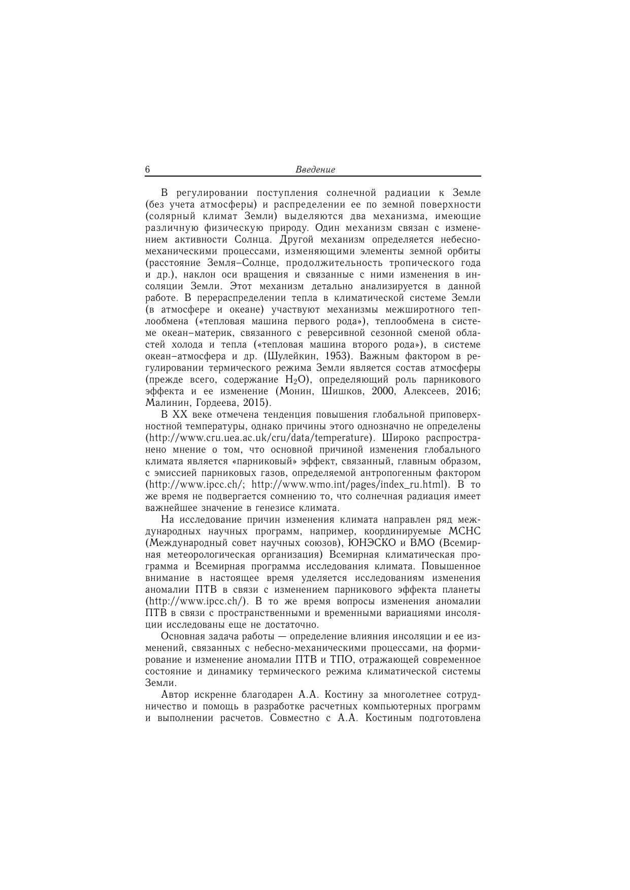В книге приводятся результаты исследований вариаций инсоляции Земли, связанных с небесно-механическими процессами. Анализируются низкочастотные и высокочастотные изменения солярного климата Земли и особенности пространственного распределения приходящей к ней лучистой энергии, связанные с формой, наклоном оси вращения и характером ее орбитального движения. Определены причины современных изменений глобального климата, основная из которых — изменение наклона оси вращения Земли, регулирующее распределение солнечной радиации по широтам и сезонам. Предложены регрессионные модели изменения важнейших характеристик климата: приповерхностной температуры воздуха (ПТВ), температуры поверхности океана (ТПО) и уровня Мирового океана (УМО). Предложен алгоритм прогноза (оценки), основу которого составляют регрессионные модели. Выполнена оценка изменения аномалии ПТВ, ТПО и УМО на период с 2017 по 2050 гг. Для специалистов-климатологов, океанологов, геофизиков, географов, биологов, экологов, а также для студентов и преподавателей физических и географических факультетов высших учебных заведений.