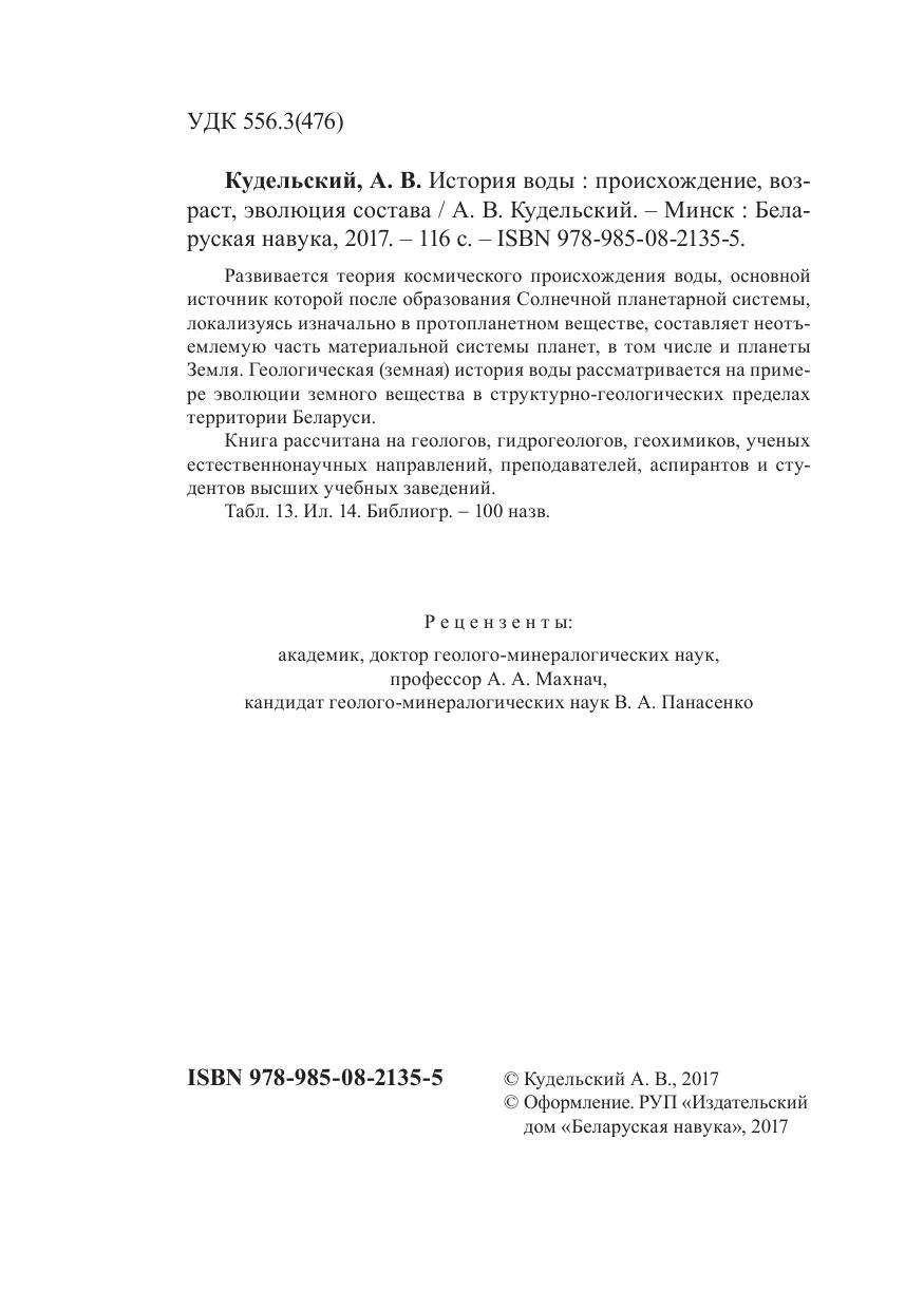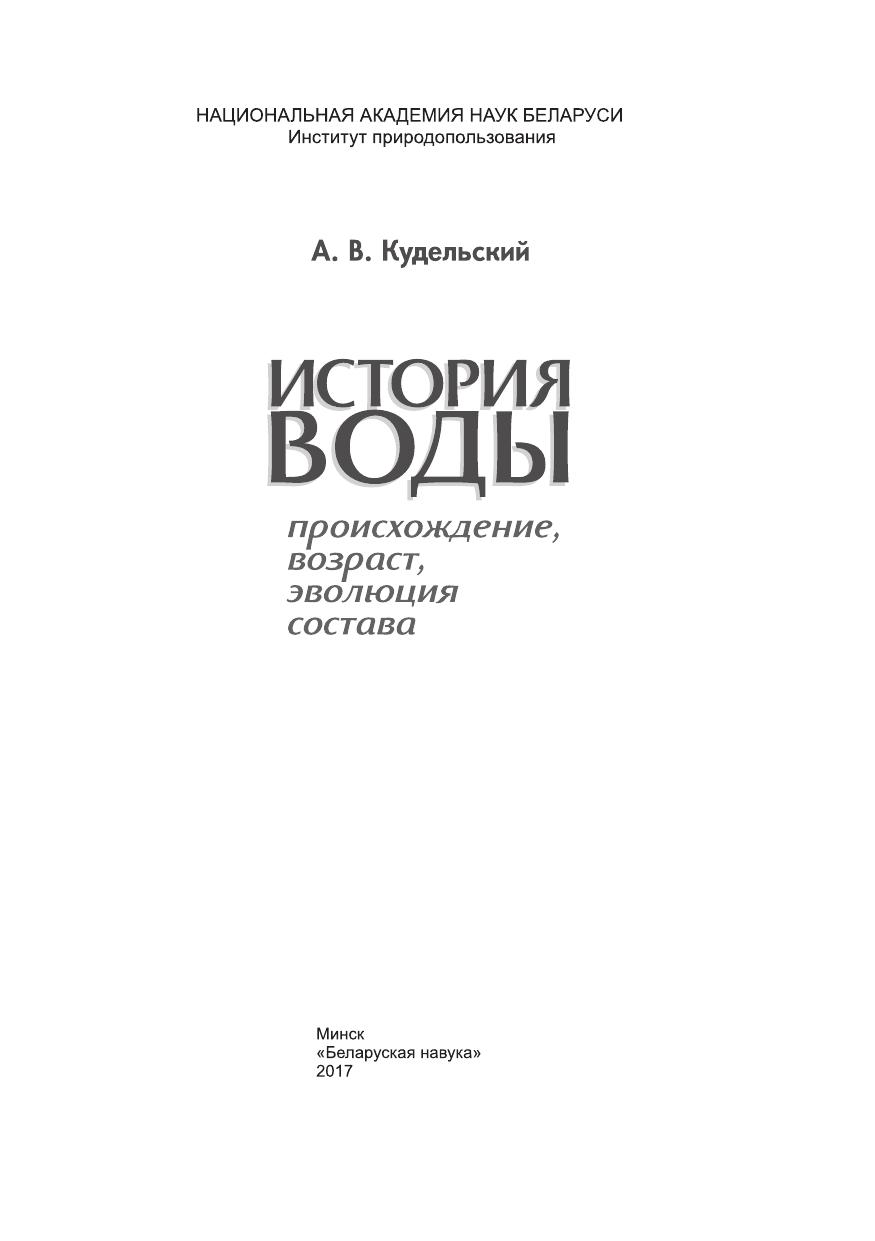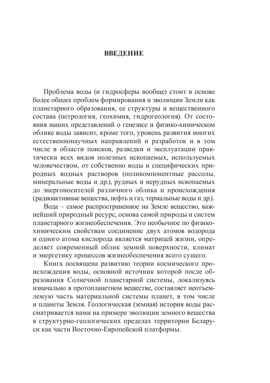 Развивается теория космического происхождения воды, основной источник которой после образования Солнечной планетарной системы, локализуясь изначально в протопланетном веществе, составляет неотъемлемую часть материальной системы планет, в том числе и планеты Земля. Геологическая (земная) история воды рассматривается на примере эволюции земного вещества в структурно-геологических пределах территории Беларуси. Книга рассчитана на геологов, гидрогеологов, геохимиков, ученых естественнонаучных направлений, преподавателей, аспирантов и студентов высших учебных заведений.