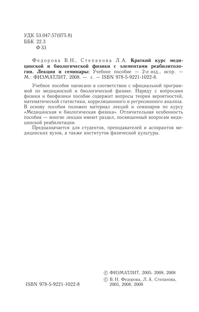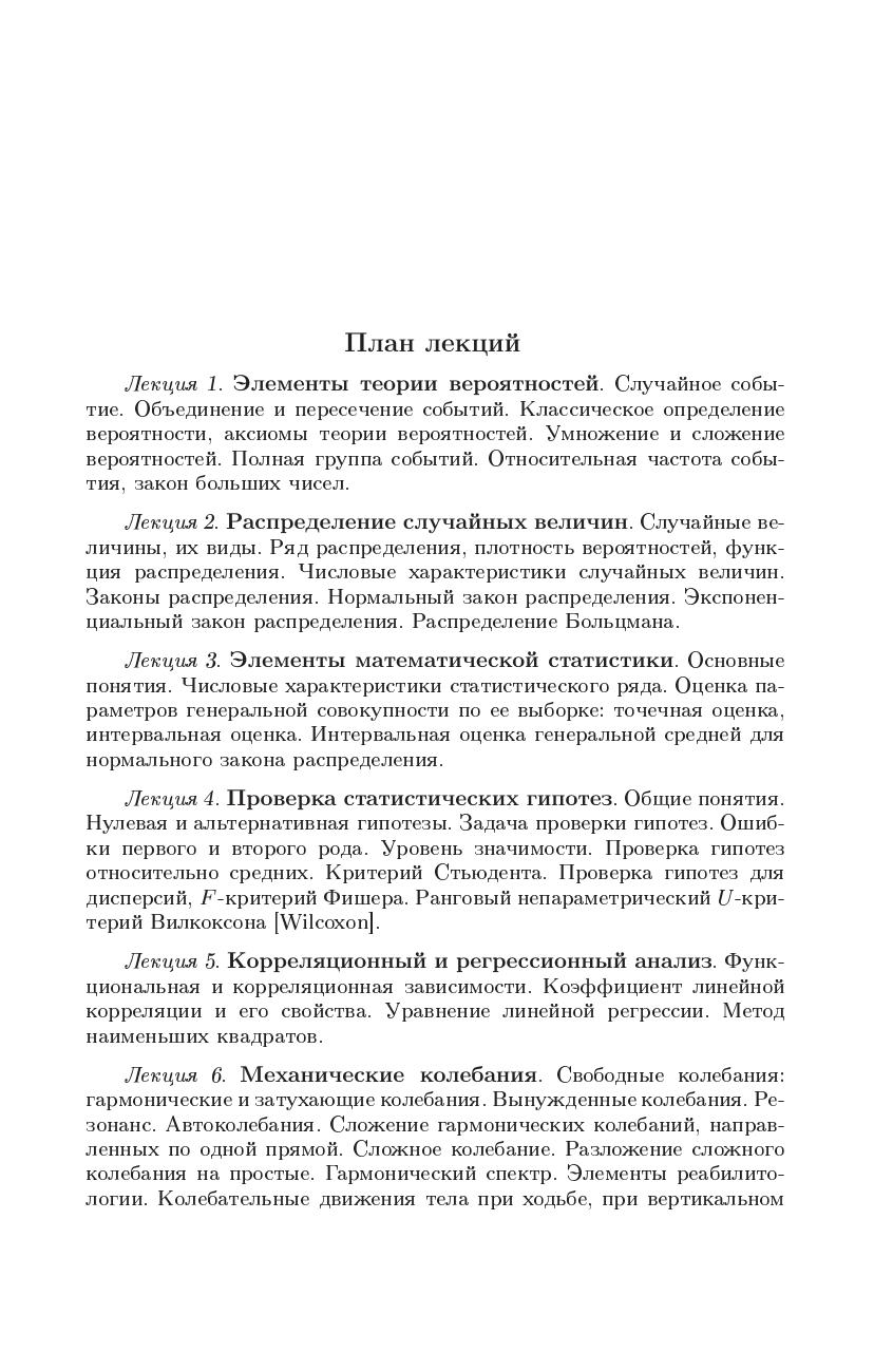 Учебное пособие написано в соответствии с официальной программой по медицинской и биологической физике. Наряду с вопросами физики и биофизики пособие содержит вопросы теории вероятностей, математической статистики, корреляционного и регресионного анализа. В основу пособия положен материал лекций и семинаров по курсу «Медицинская и биологическая физика». Отличительная особенность пособия — многие лекции имеют раздел, посвященный вопросам медицинской реабилитации.Предназначается для студентов, преподавателей и аспирантов медицинских вузов, а также институтов физической культуры.