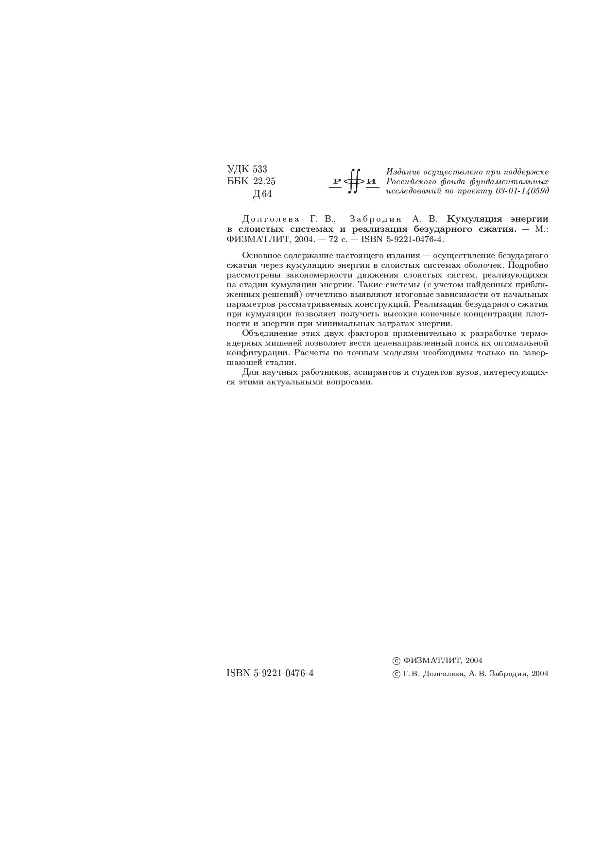 Основное содержание настоящего издания - осуществление безударного сжатия через кумуляцию энергии в слоистых системах оболочек. Подробно рассмотрены закономерности движения слоистых систем, реализующихся на стадии кумуляции энергии. Такие системы (с учетом найденных приближенных решений) отчетливо выявляют итоговые зависимости от начальных параметров рассматриваемых конструкций. Реализация безударного сжатия при кумуляции позволяет получить высокие конечные концентрации плотности и энергии при минимальных затратах энергии. Объединение этих двух факторов применительно к разработке термоядерных мишеней позволяет вести целенаправленный поиск их оптимальной конфигурации. Расчеты по точным моделям необходимы только на завершающей стадии. Для научных работников, аспирантов и студентов вузов, интересующихся этими актуальными вопросами.