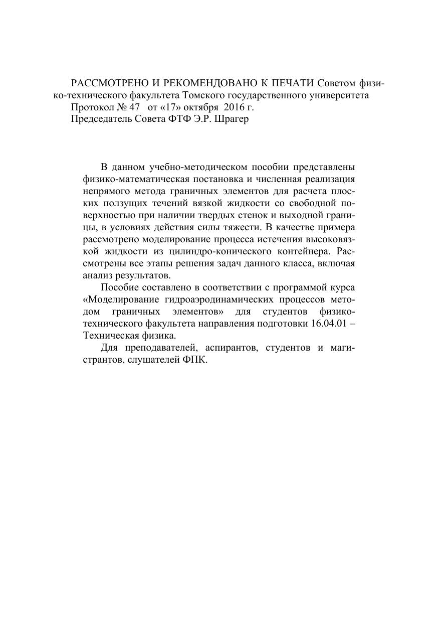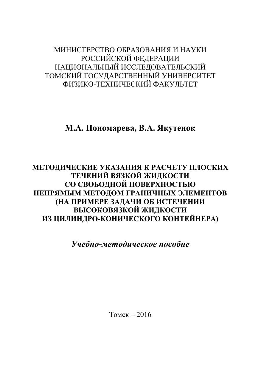 Методические указания к расчету плоских течений вязкой жидкости со свободной поверхностью непрямым методом граничных элементов (на примере задачи об истечении высоковязкой жидкости из цилиндро-конического контейнера)