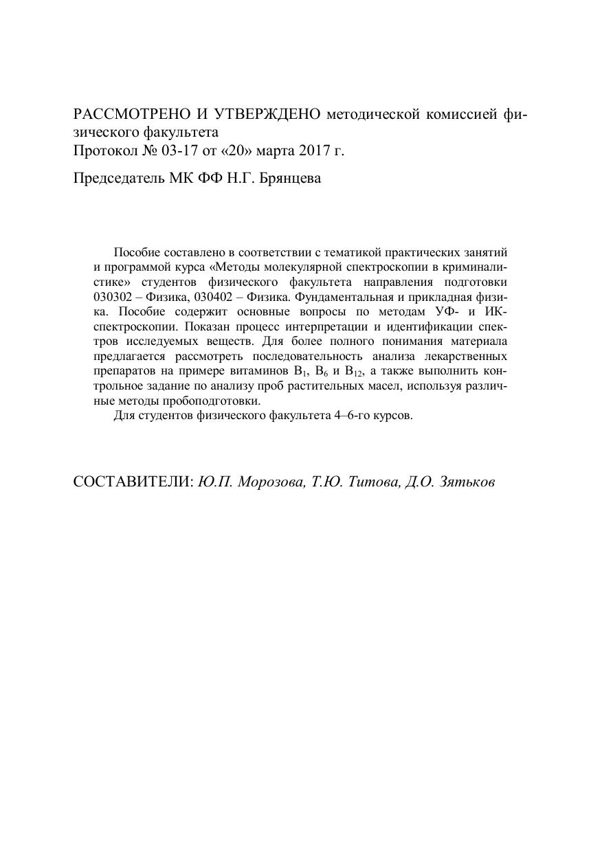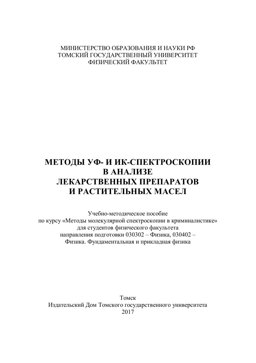 Пособие составлено в соответствии с тематикой практических занятий и программой курса «Методы молекулярной спектроскопии в криминалистике» студентов физического факультета направления подготовки 030302 – Физика, 030402 – Физика. Фундаментальная и прикладная физика. Пособие содержит основные вопросы по методам УФ- и ИК-спектроскопии. Показан процесс интерпретации и идентификации спектров исследуемых веществ. Для более полного понимания материала предлагается рассмотреть последовательность анализа лекарственных препаратов на примере витаминов В 1 , В 6 и В 12 , а также выполнить контрольное задание по анализу проб растительных масел, используя различные методы пробоподготовки. Для студентов физического факультета 4–6-го курсов.