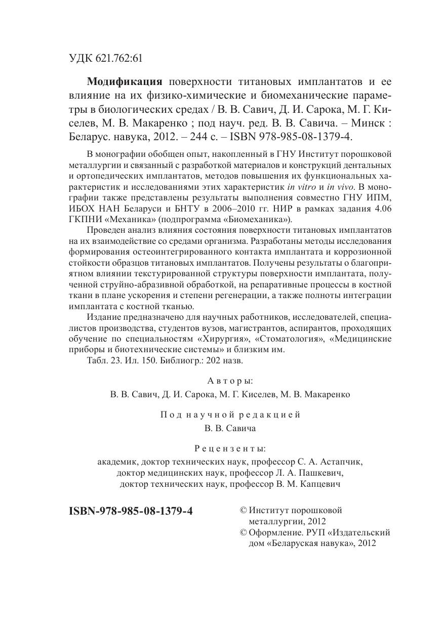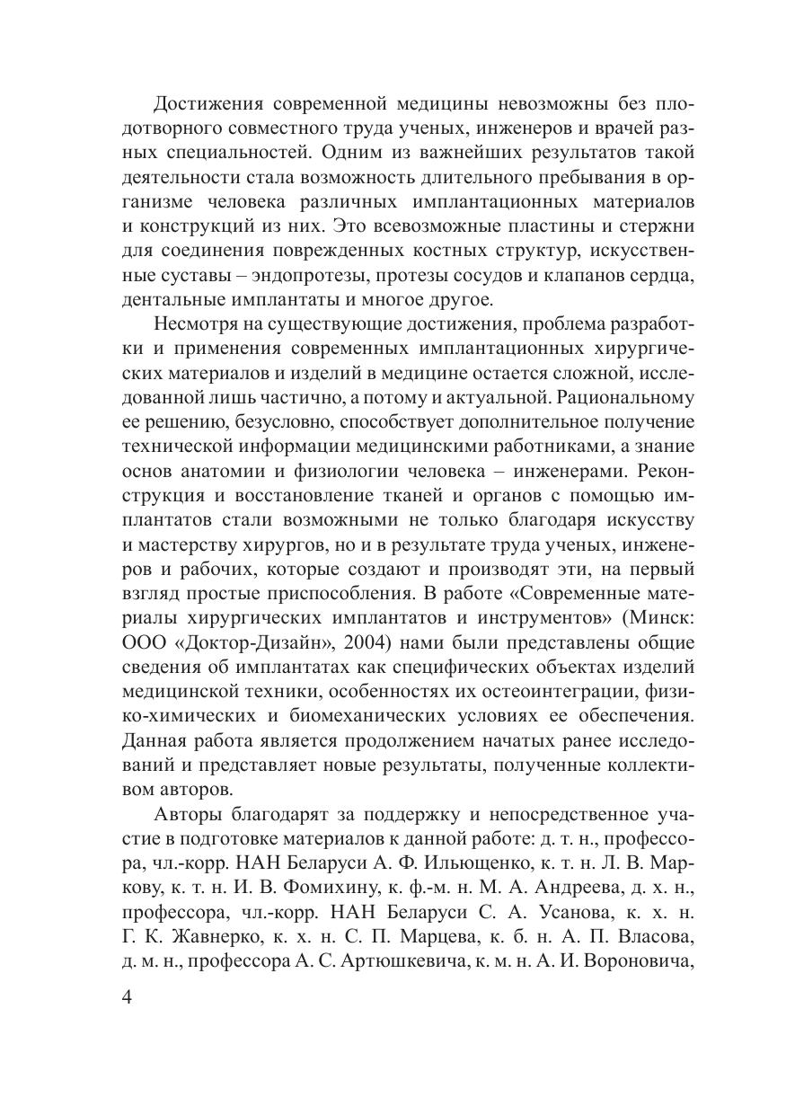 В монографии обобщен опыт, накопленный в ГНУ Институт порошковой металлургии и связанный с разработкой материалов и конструкций дентальных и ортопедических имплантатов, методов повышения их функциональных характеристик и исследованиями этих характеристик in vitro и in vivo. В монографии также представлены результаты выполнения совместно ГНУ ИПМ, ИБОХ НАН Беларуси и БНТУ в 2006–2010 гг. НИР в рамках задания 4.06 ГКПНИ «Механика» (подпрограмма «Биомеханика»). Проведен анализ влияния состояния поверхности титановых имплантатов на их взаимодействие со средами организма. Разработаны методы исследования формирования остеоинтегрированного контакта имплантата и коррозионной стойкости образцов титановых имплантатов. Получены результаты о благоприятном влиянии текстурированной структуры поверхности имплантата, полученной струйно-абразивной обработкой, на репаративные процессы в костной ткани в плане ускорения и степени регенерации, а также полноты интеграции имплантата с костной тканью. Издание предназначено для научных работников, исследователей, специалистов производства, студентов вузов, магистрантов, аспирантов, проходящих обучение по специальностям «Хирургия», «Стоматология», «Медицинские приборы и биотехнические системы» и близким им.