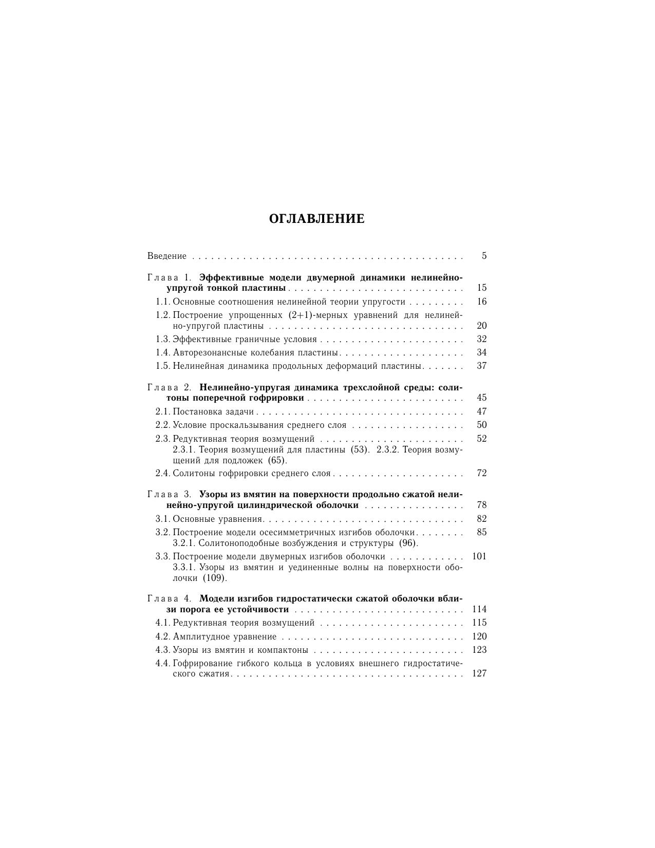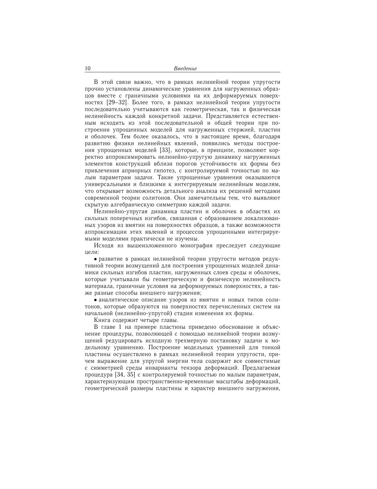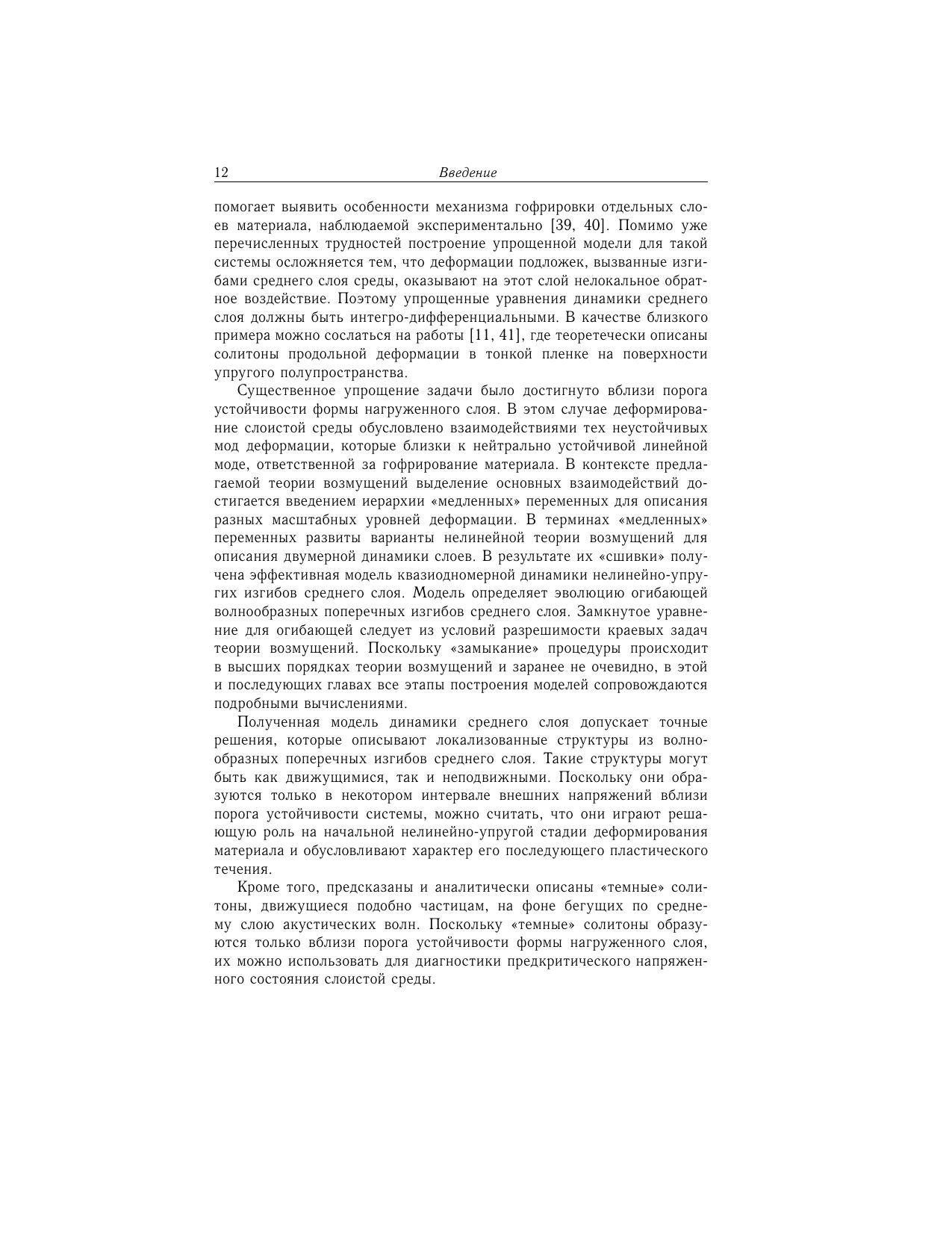 В монографии развиваются специальные варианты редуктивной теории возмущений, которые позволяют привести трехмерные динамические уравнения нелинейной теории упругости для пластин, слоистой среды и оболочек к более простым: двумерным и одномерным моделям. Первые порядки такой теории сводятся к традиционным уравнениям для пластин и оболочек. Получены новые существенно нелинейные модели, которые корректно учитывают граничные условия на поверхностях образцов, взаимодействие продольных и поперечных мод деформации материала, геометрическую и физическую нелинейности среды, изменения инерционных свойств деформируемых поверхностей из-за локальных изменений их кривизны. На этой основе аналитически описаны узоры из вмятин и новые типы солитонов, которые образуются на поверхностях перечисленных систем на начальной (нелинейно-упругой) стадии изменения их формы. Монография адресована научным сотрудникам, аспирантам и студентам вузов соответствующих специальностей.