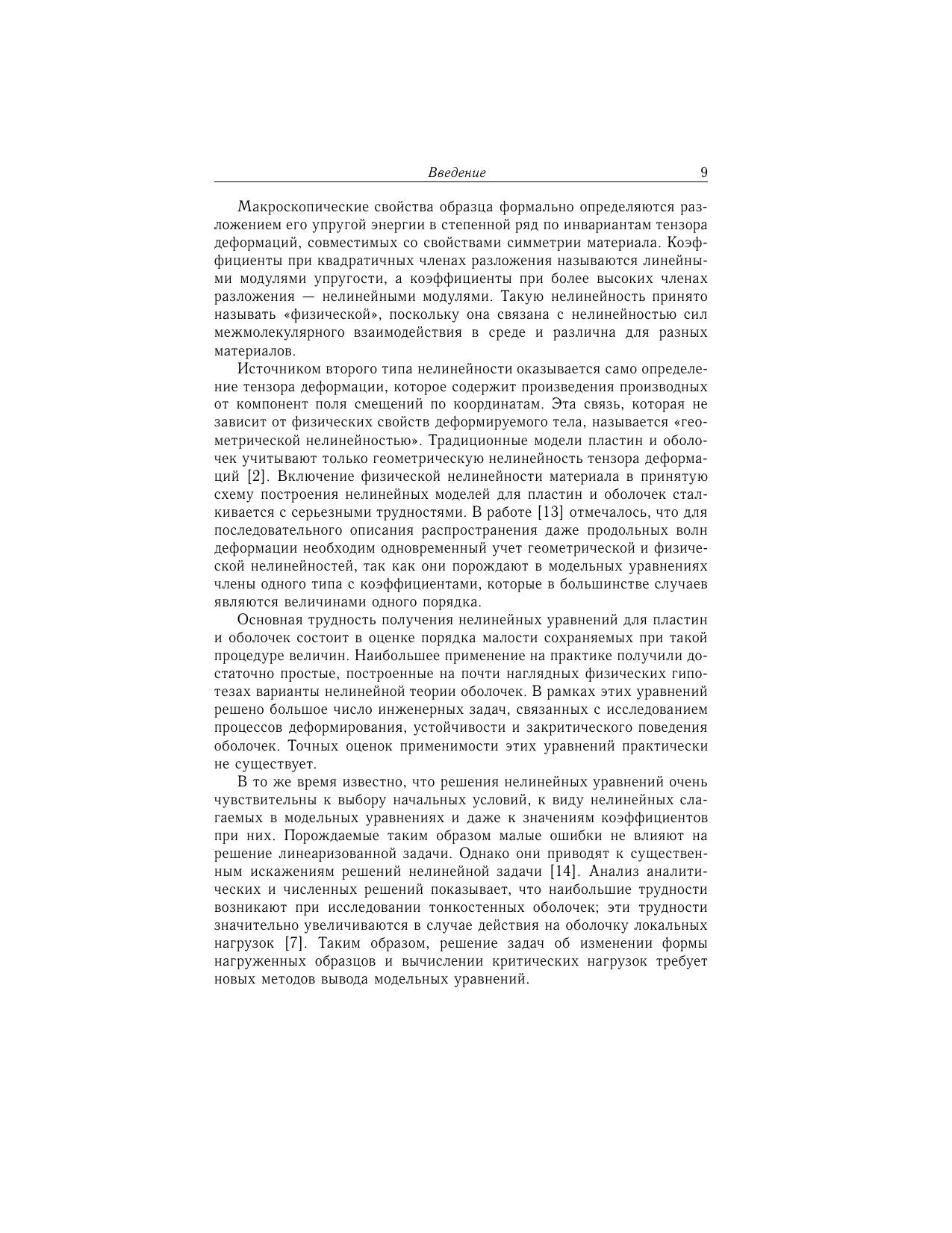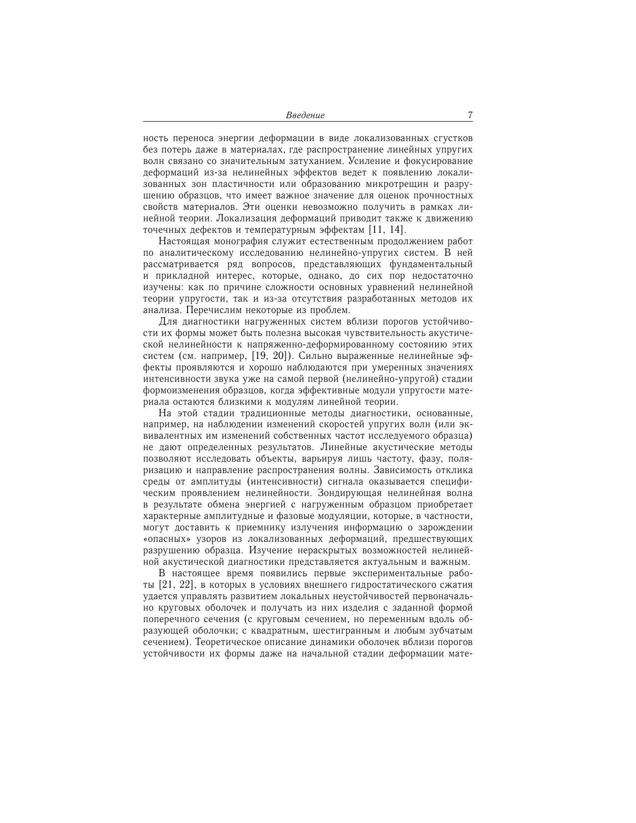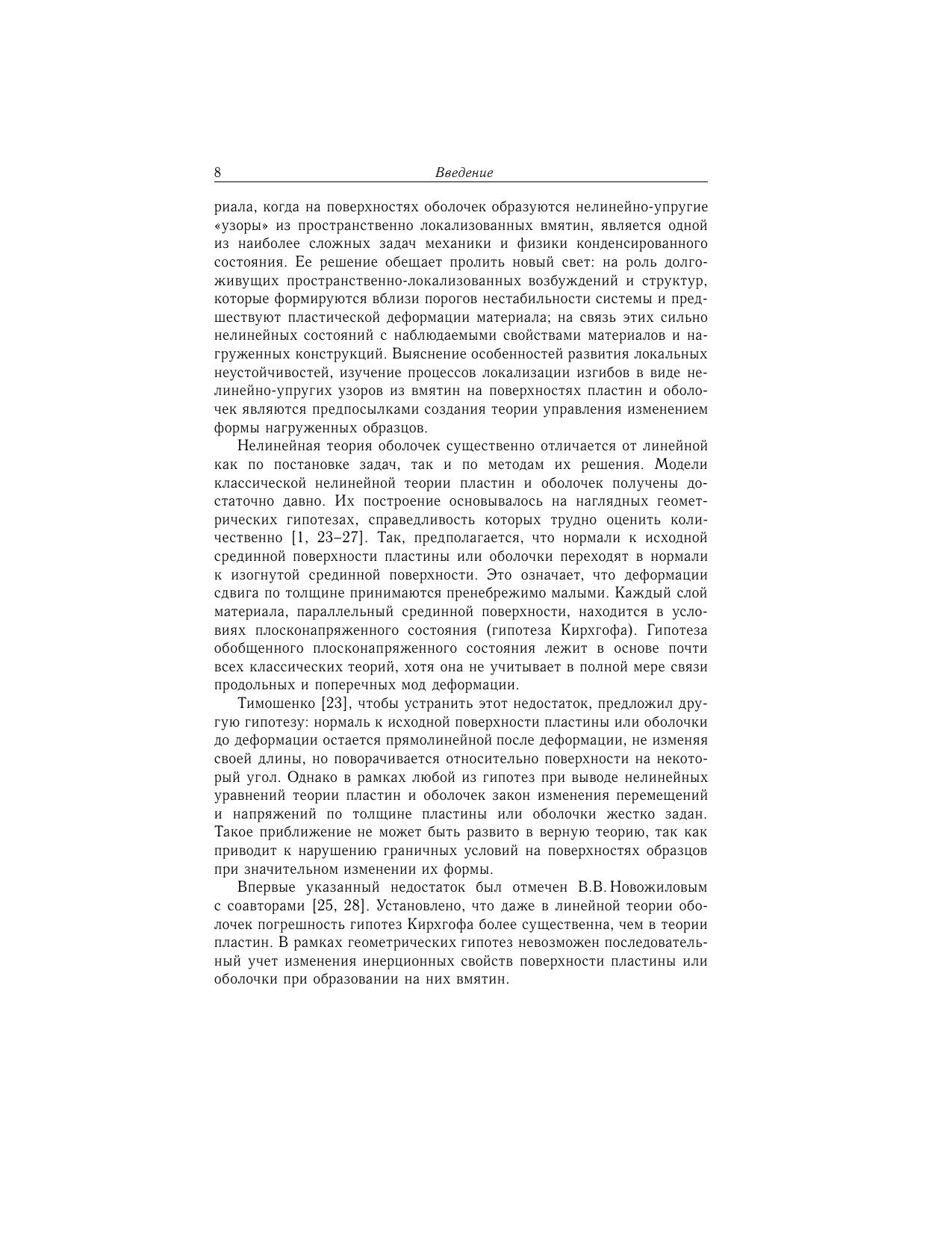 В монографии развиваются специальные варианты редуктивной теории возмущений, которые позволяют привести трехмерные динамические уравнения нелинейной теории упругости для пластин, слоистой среды и оболочек к более простым: двумерным и одномерным моделям. Первые порядки такой теории сводятся к традиционным уравнениям для пластин и оболочек. Получены новые существенно нелинейные модели, которые корректно учитывают граничные условия на поверхностях образцов, взаимодействие продольных и поперечных мод деформации материала, геометрическую и физическую нелинейности среды, изменения инерционных свойств деформируемых поверхностей из-за локальных изменений их кривизны. На этой основе аналитически описаны узоры из вмятин и новые типы солитонов, которые образуются на поверхностях перечисленных систем на начальной (нелинейно-упругой) стадии изменения их формы. Монография адресована научным сотрудникам, аспирантам и студентам вузов соответствующих специальностей.