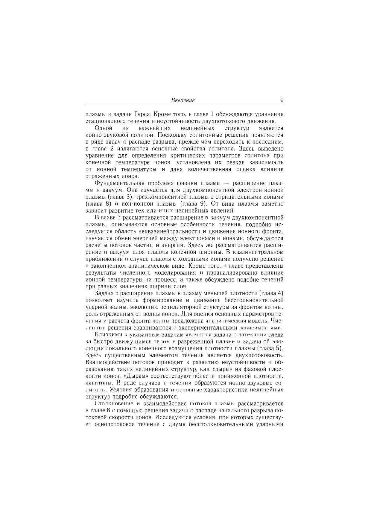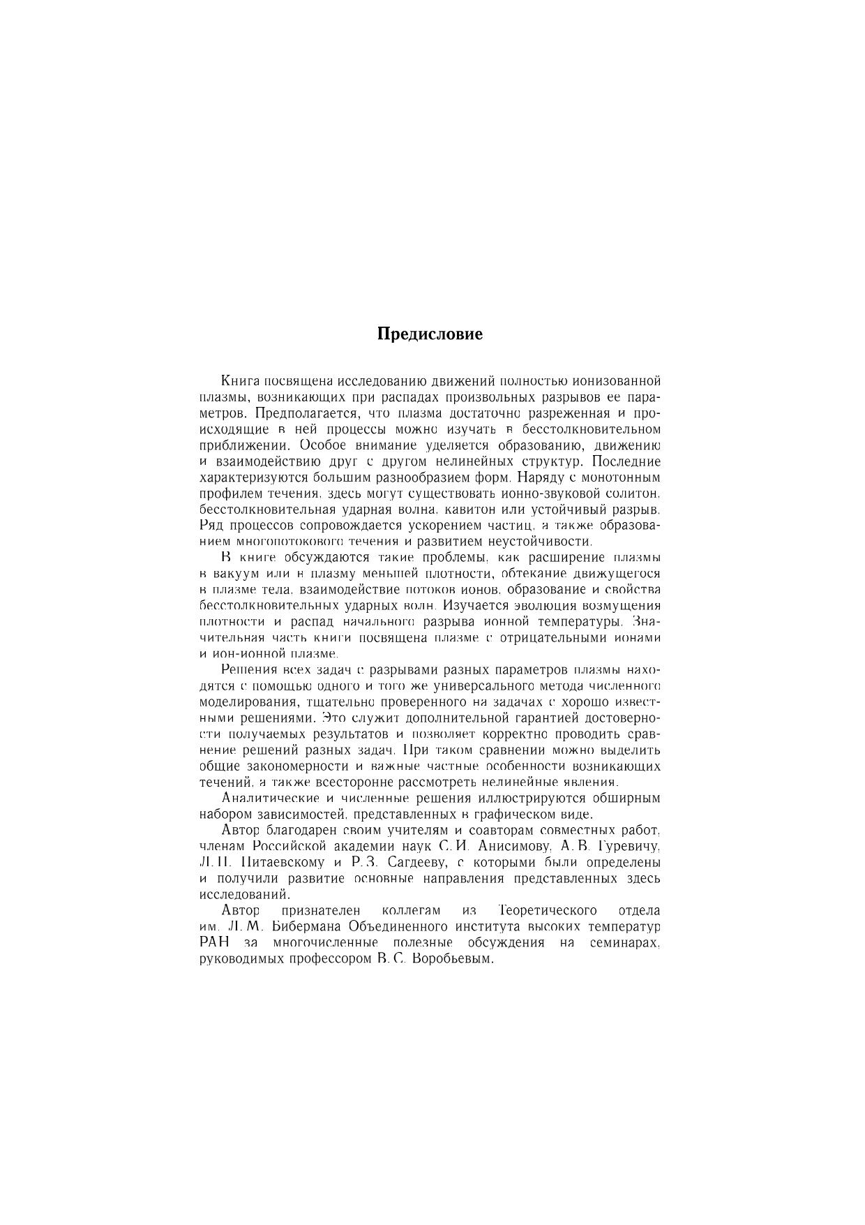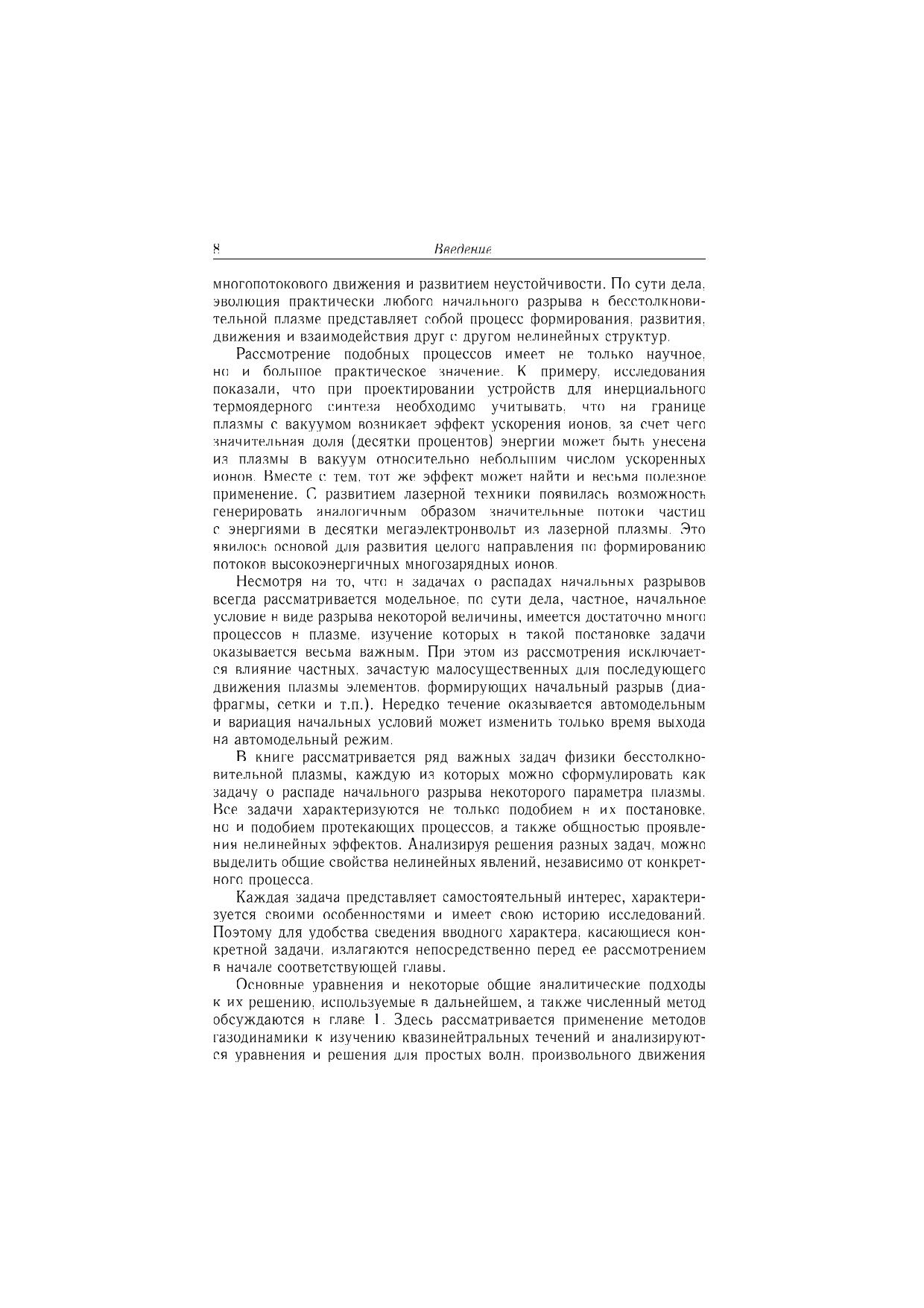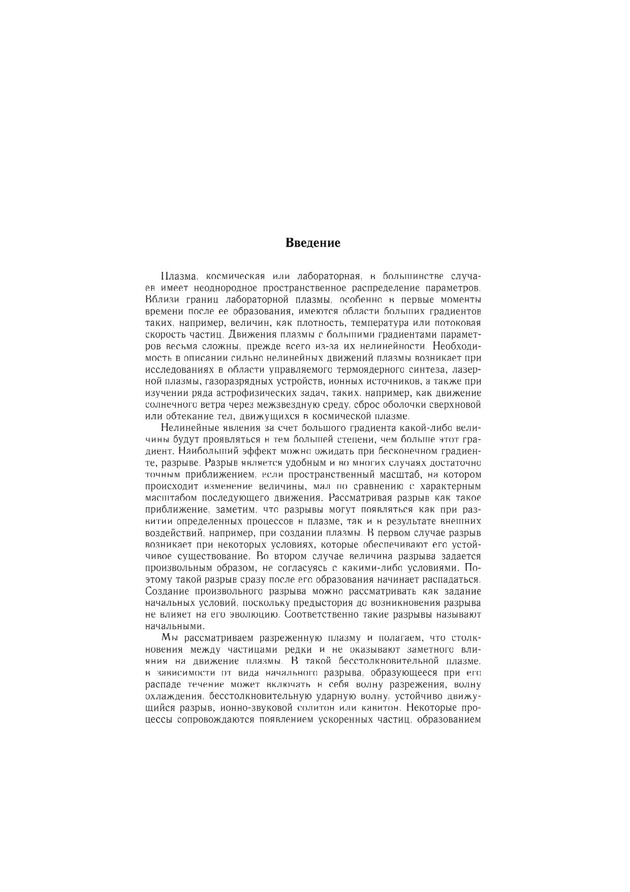 Исследованы нелинейные явления, возникающие в бесстолкновительной плазме при распадах начальных разрывов плотности плазмы, ионной температуры или потоковой скорости ионов. Изучено расширение в вакуум двухкомпонентной электроионной плазмы, трехкомпонентной плазмы с отрицательными ионами, а также ион-ионной плазмы. Рассмотрено расширение плазмы в плазму меньшей плотности, обтекание плазмой быстро движущегося тела и эволюция конечного возмущения плотности. Исследовано столкновение и взаимодействие потоков плазмы, а также движение плазмы при больших начальных градиентах ионной температуры. Подробно описаны образование и эволюция нелинейных структур: ионнозвукового солитона, бесстолкновительной ударной волны, кавитонов, а также волн разрежения и охлаждения. Рассмотрены явление ускорения ионов, возникновение многопотокового движения и развитие неустойчивости. Для специалистов в области физики плазмы, аспирантов и студентов старших курсов физико-математических специальностей.