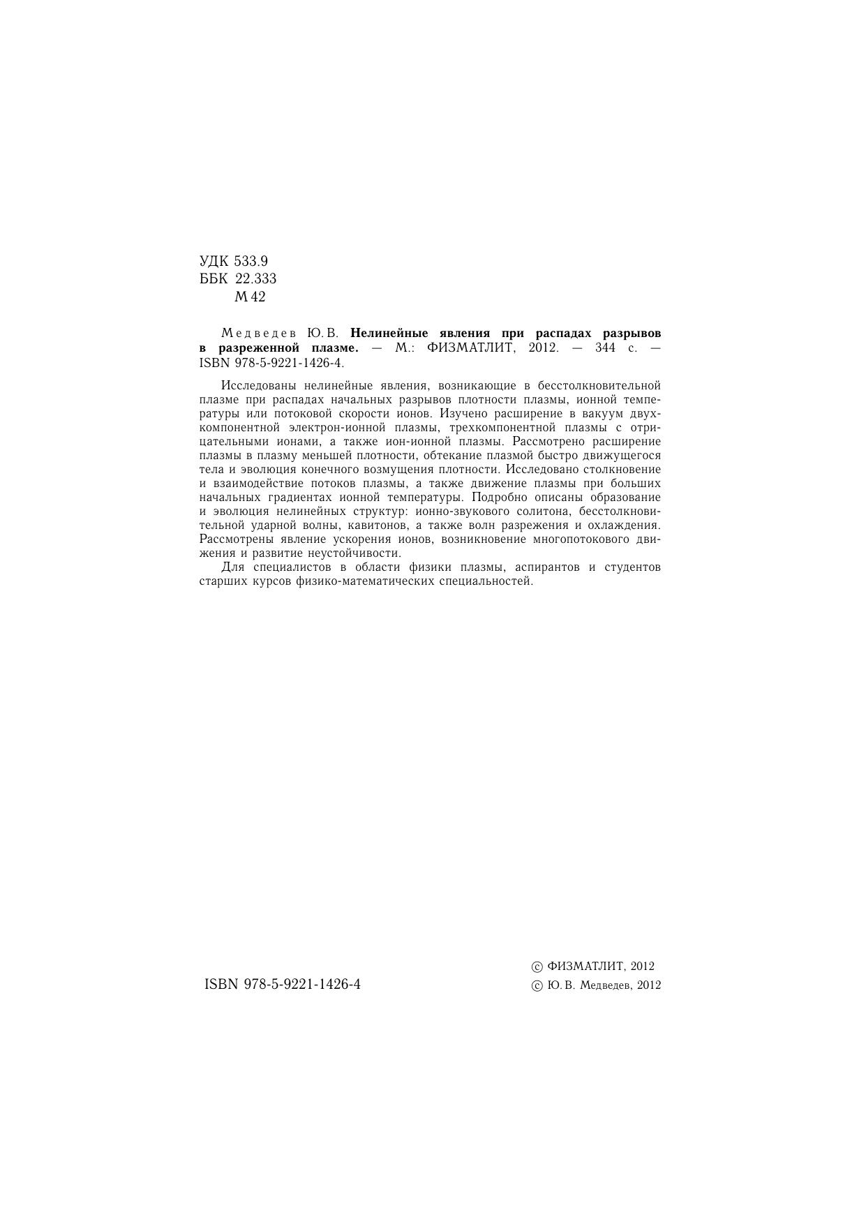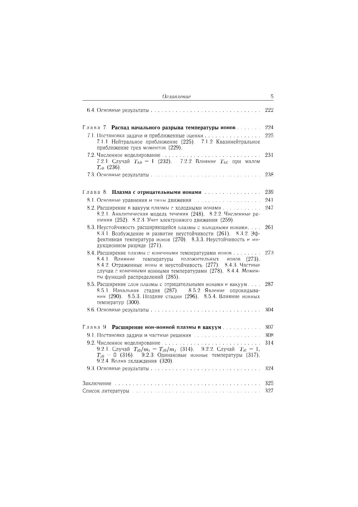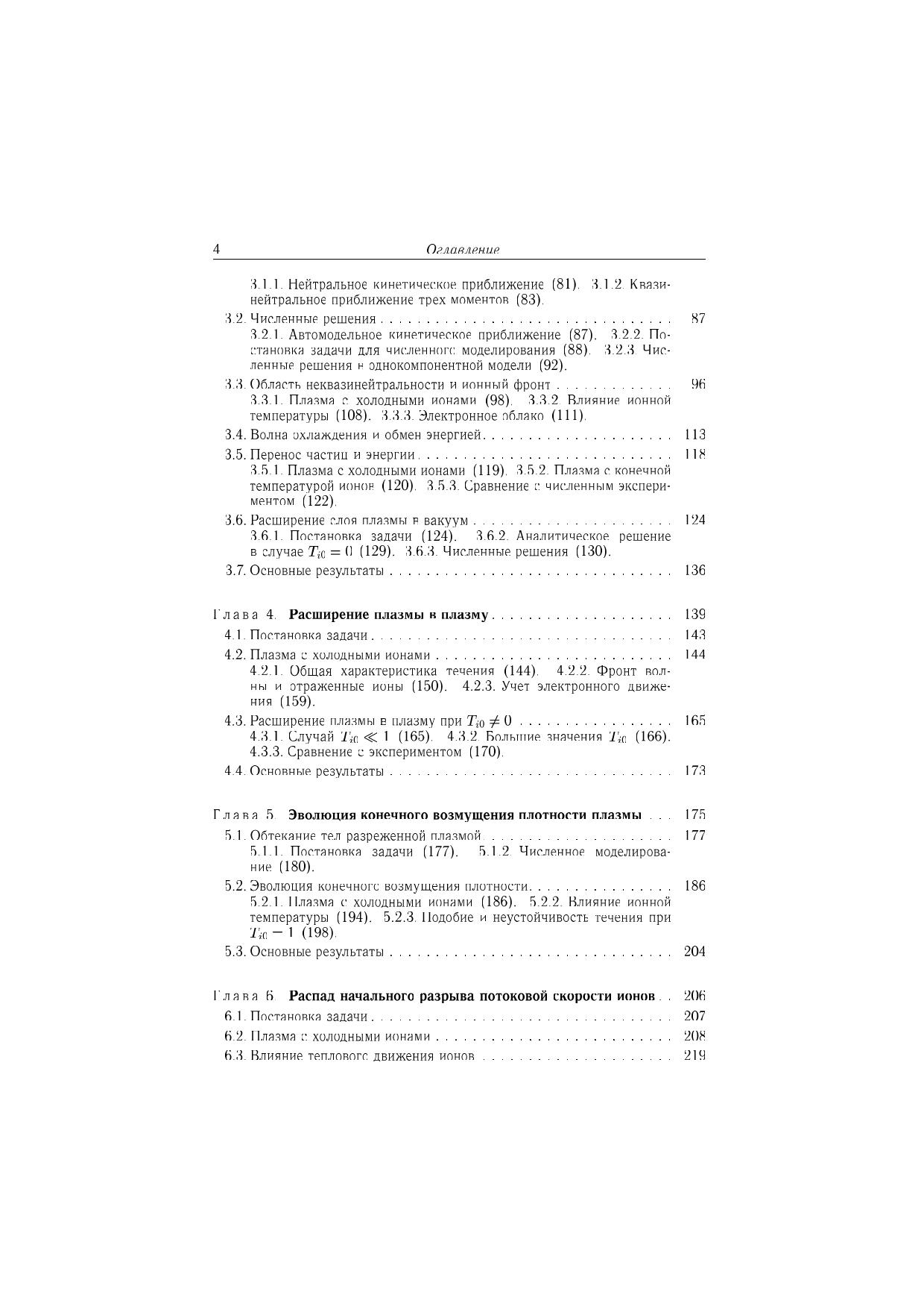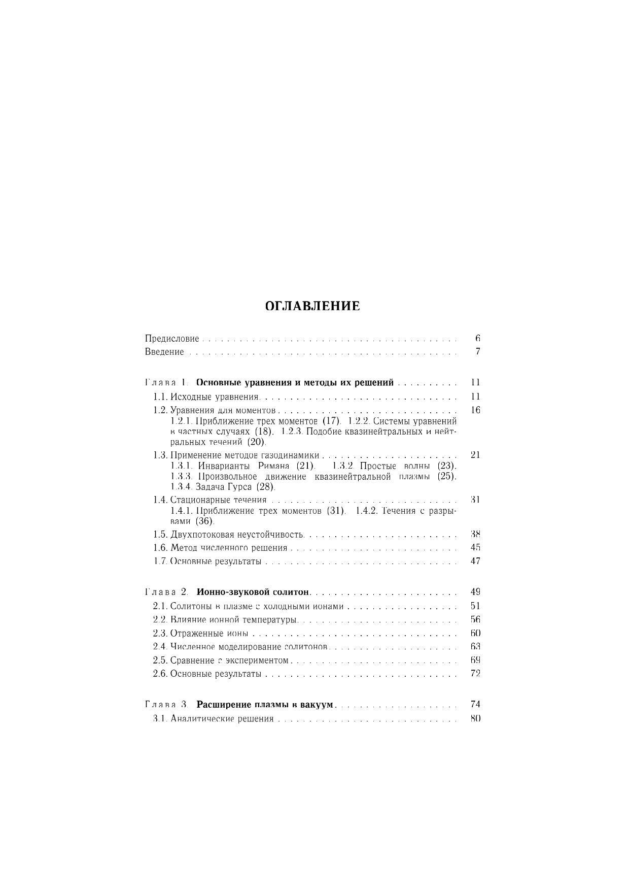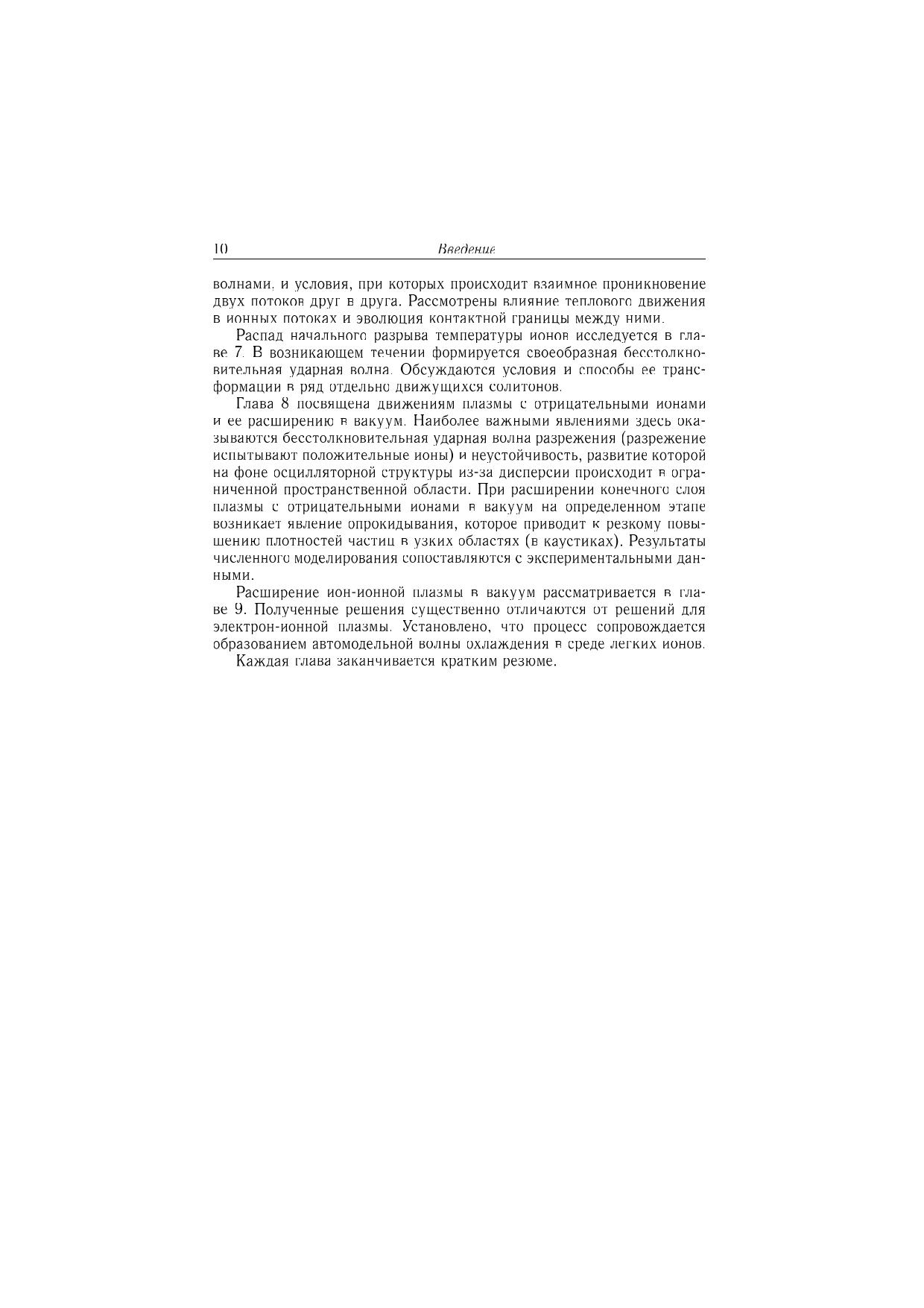 Исследованы нелинейные явления, возникающие в бесстолкновительной плазме при распадах начальных разрывов плотности плазмы, ионной температуры или потоковой скорости ионов. Изучено расширение в вакуум двухкомпонентной электроионной плазмы, трехкомпонентной плазмы с отрицательными ионами, а также ион-ионной плазмы. Рассмотрено расширение плазмы в плазму меньшей плотности, обтекание плазмой быстро движущегося тела и эволюция конечного возмущения плотности. Исследовано столкновение и взаимодействие потоков плазмы, а также движение плазмы при больших начальных градиентах ионной температуры. Подробно описаны образование и эволюция нелинейных структур: ионнозвукового солитона, бесстолкновительной ударной волны, кавитонов, а также волн разрежения и охлаждения. Рассмотрены явление ускорения ионов, возникновение многопотокового движения и развитие неустойчивости. Для специалистов в области физики плазмы, аспирантов и студентов старших курсов физико-математических специальностей.