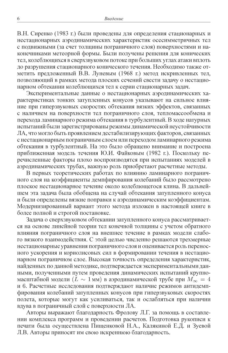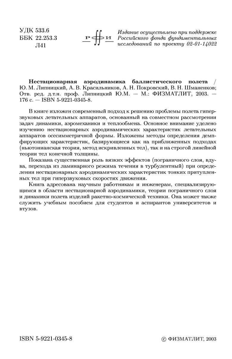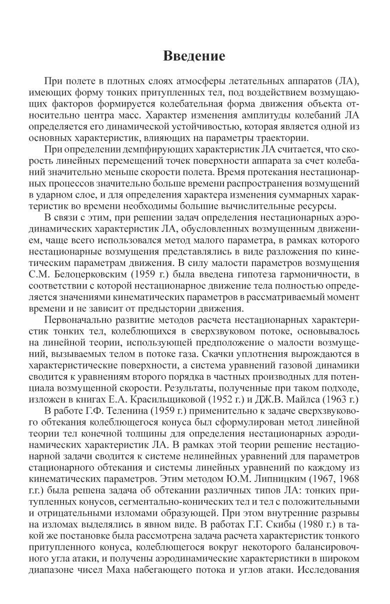 В книге изложен современный подход к решению проблемы полета гиперзвуковых летательных аппаратов, основанный на совместном рассмотрении задач динамики, аэромеханики и теплообмена. Основное внимание уделено изучению нестационарных аэродинамических характеристик летательных аппаратов осесимметричной формы. Изложены методы определения демпфирующих характеристик, базирующиеся как на приближенных подходах (ньютонианская теория, метод искривленных тел), так на строгой линейной теории тел конечной толщины. Показана существенная роль вязких эффектов (пограничного слоя, вдува, перехода из ламинарного режима течения в турбулентный) при определении нестационарных аэродинамических характеристик тонких притупленных тел при гиперзвуковых скоростях движения. Книга адресована научным работникам и инженерам, специализирующимся в области нестационарной аэродинамики, теории пограничного слоя и динамики полета изделий ракетно-космической техники. Она может также служить учебным пособием для студентов и аспирантов университетов и втузов.