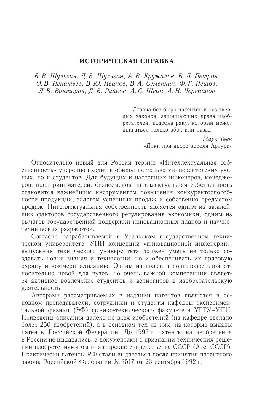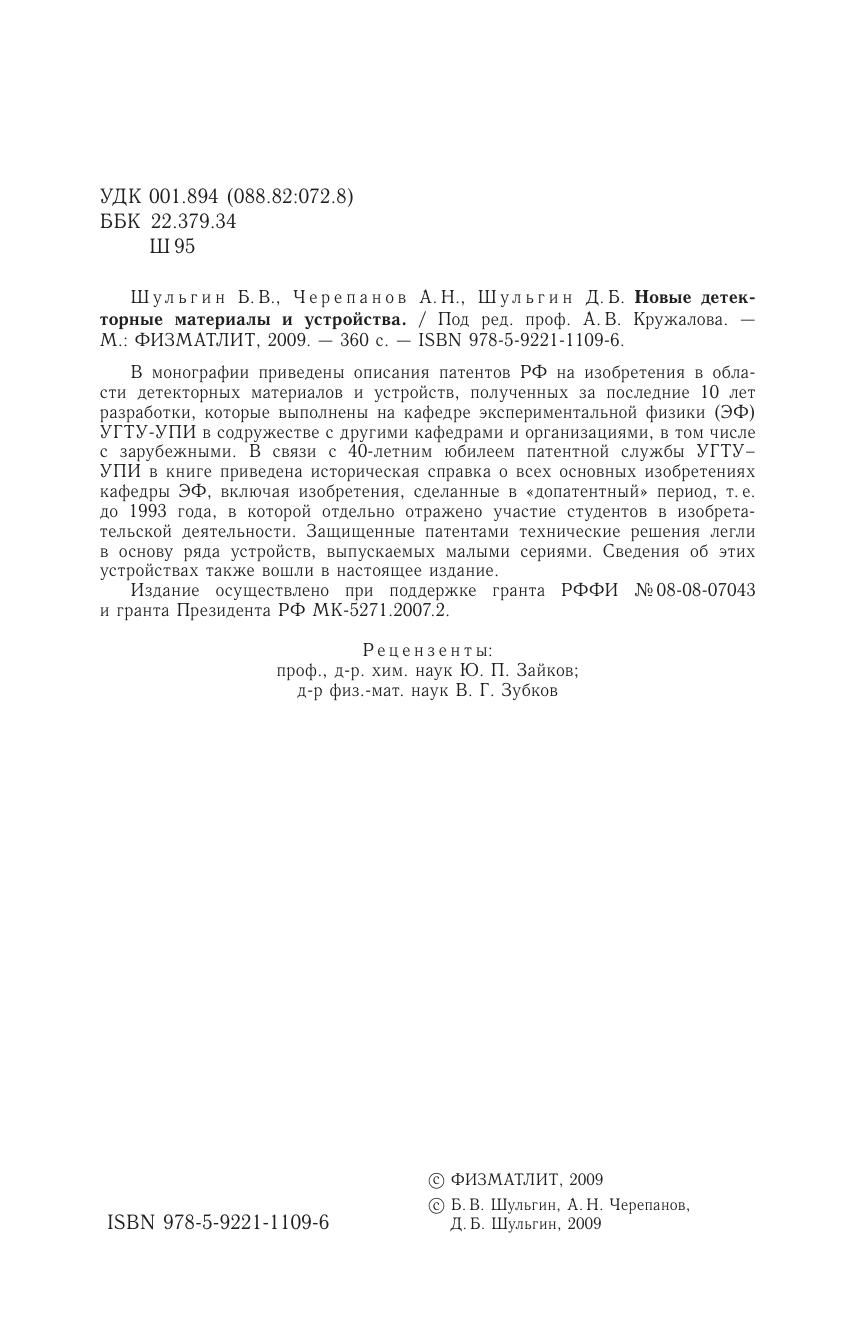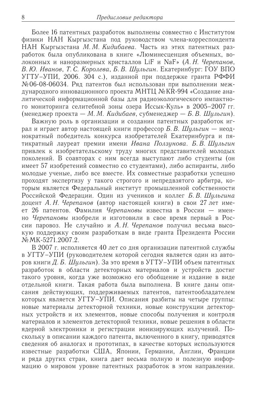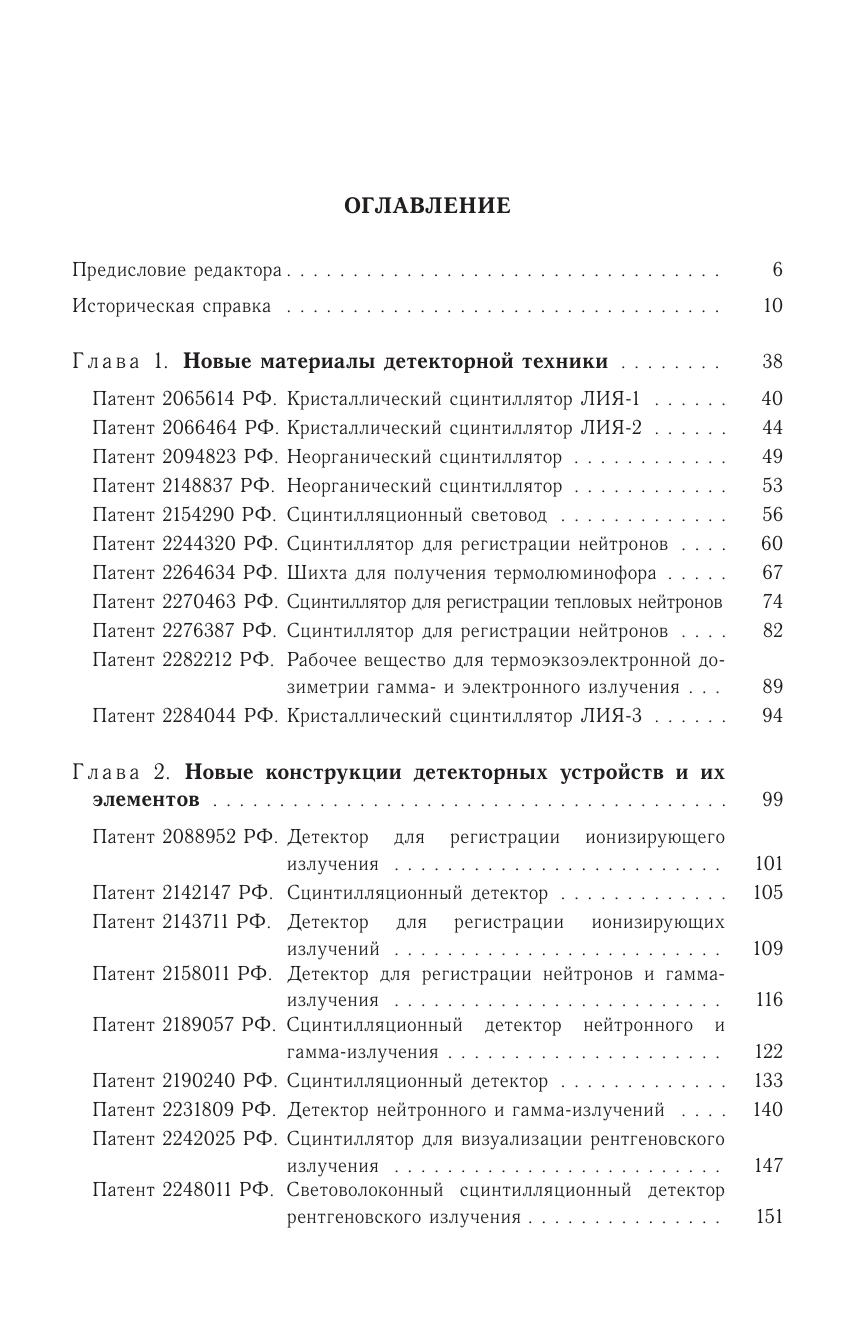 В монографии приведены описания патентов РФ на изобретения в области детекторных материалов и устройств, полученных за последние 10 лет разработки, которые выполнены на кафедре экспериментальной физики (ЭФ) УГТУ-УПИ в содружестве с другими кафедрами и организациями, в том числе с зарубежными. В связи с 40-летним юбилеем патентной службы УГТУ– УПИ в книге приведена историческая справка о всех основных изобретениях кафедры ЭФ, включая изобретения, сделанные в «допатентный» период, т. е. до 1993 года, в которой отдельно отражено участие студентов в изобретательской деятельности. Защищенные патентами технические решения легли в основу ряда устройств, выпускаемых малыми сериями. Сведения об этих устройствах также вошли в настоящее издание.