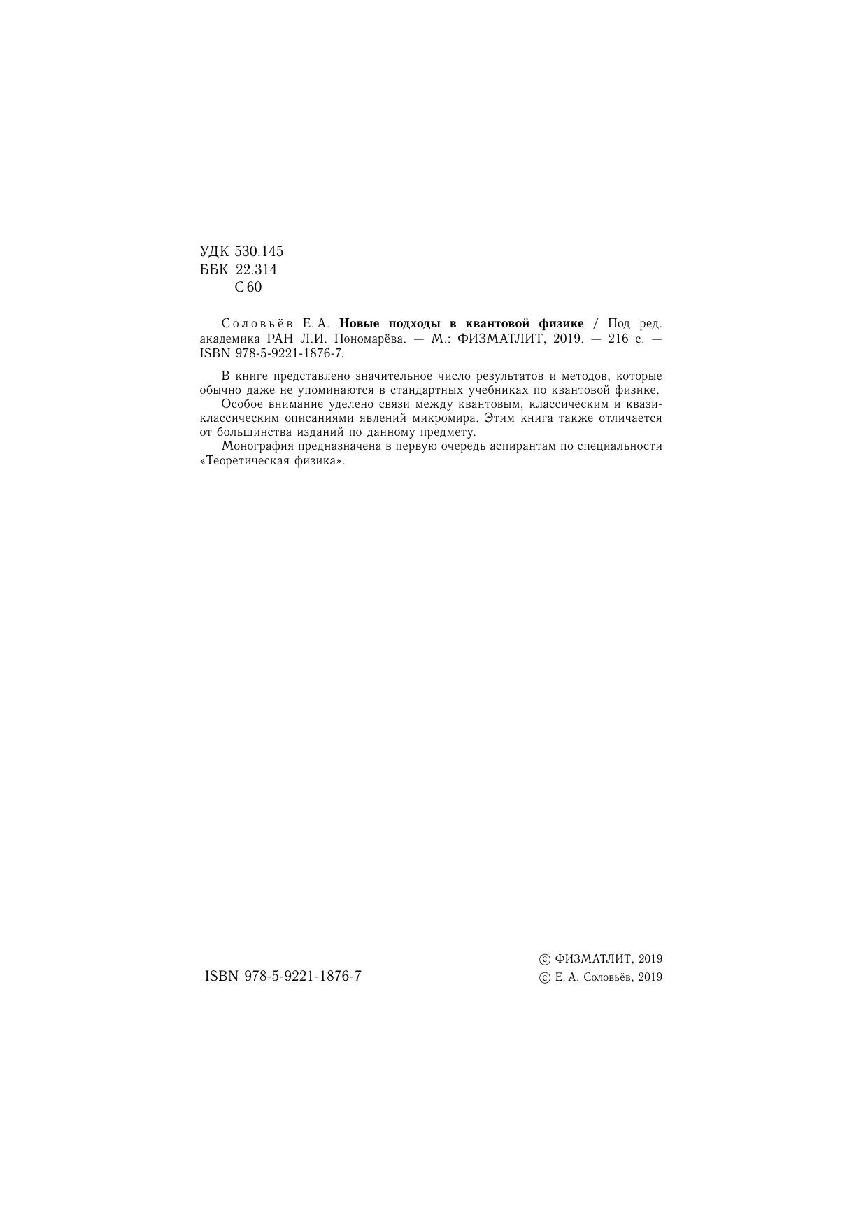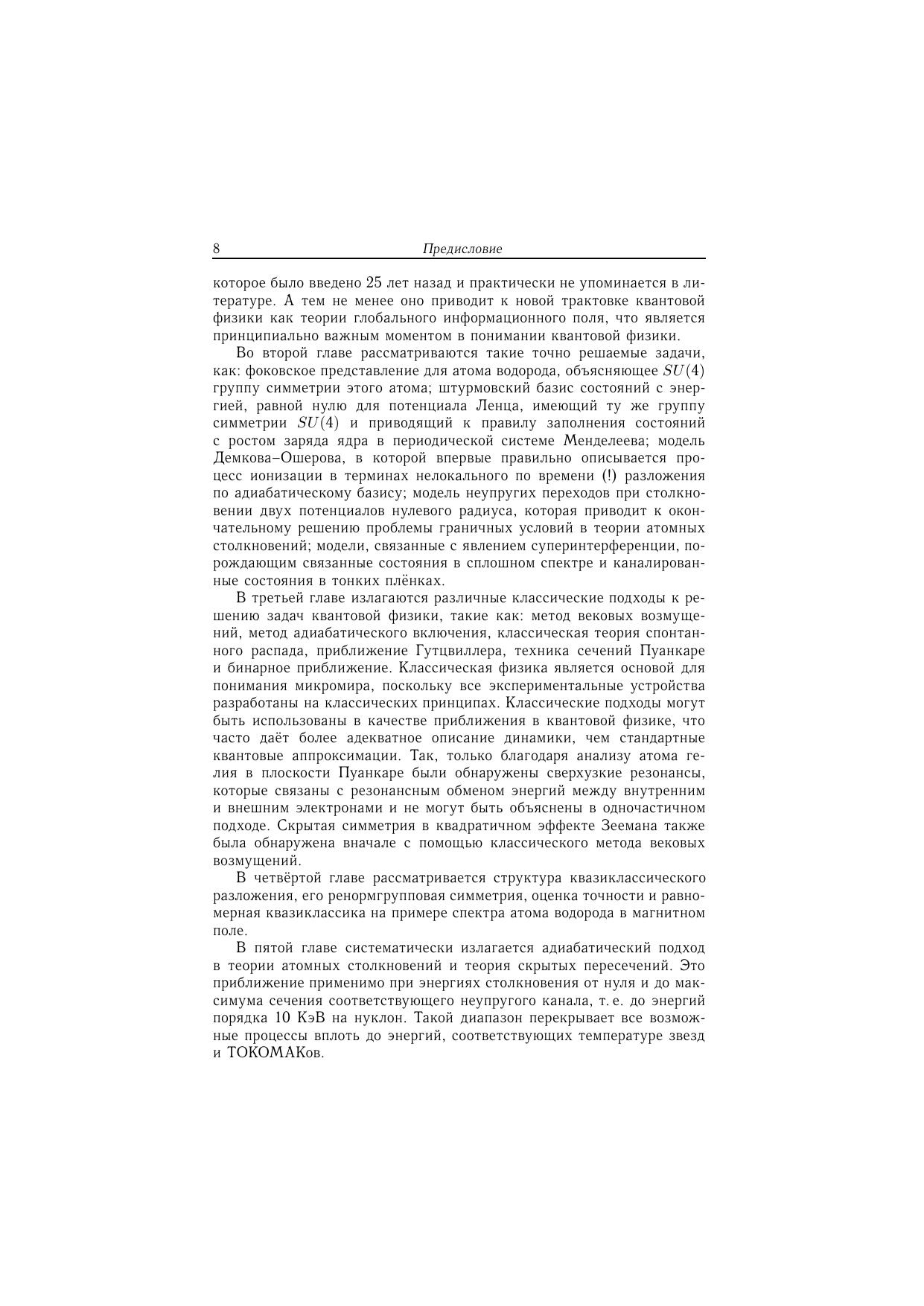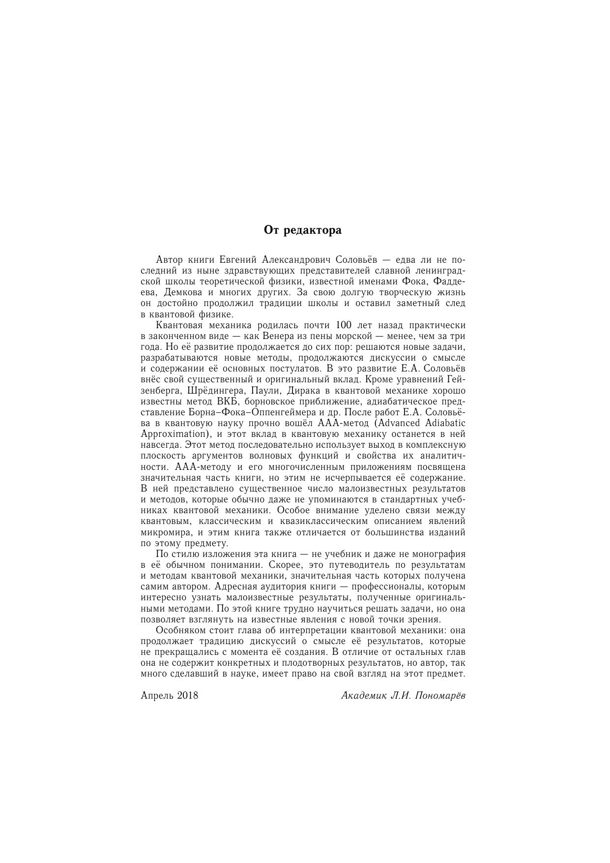 В книге представлено значительное число результатов и методов, которые обычно даже не упоминаются в стандартных учебниках по квантовой физике. Особое внимание уделено связи между квантовым, классическим и квазиклассическим описаниями явлений микромира. Этим книга также отличается от большинства изданий по данному предмету. Монография предназначена в первую очередь аспирантам по специальности «Теоретическая физика».