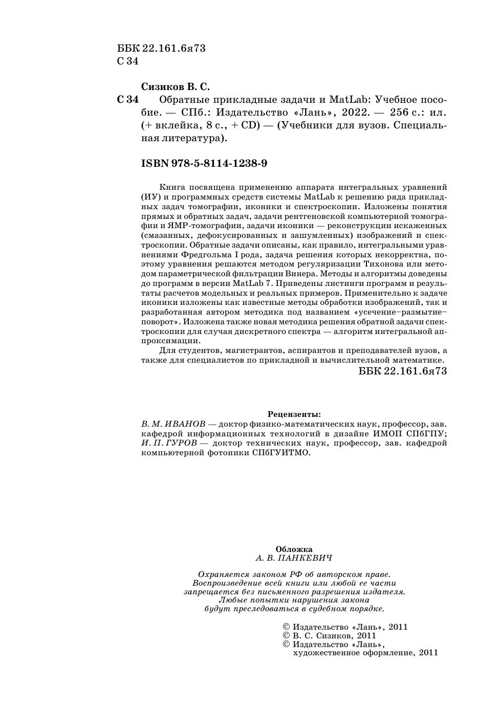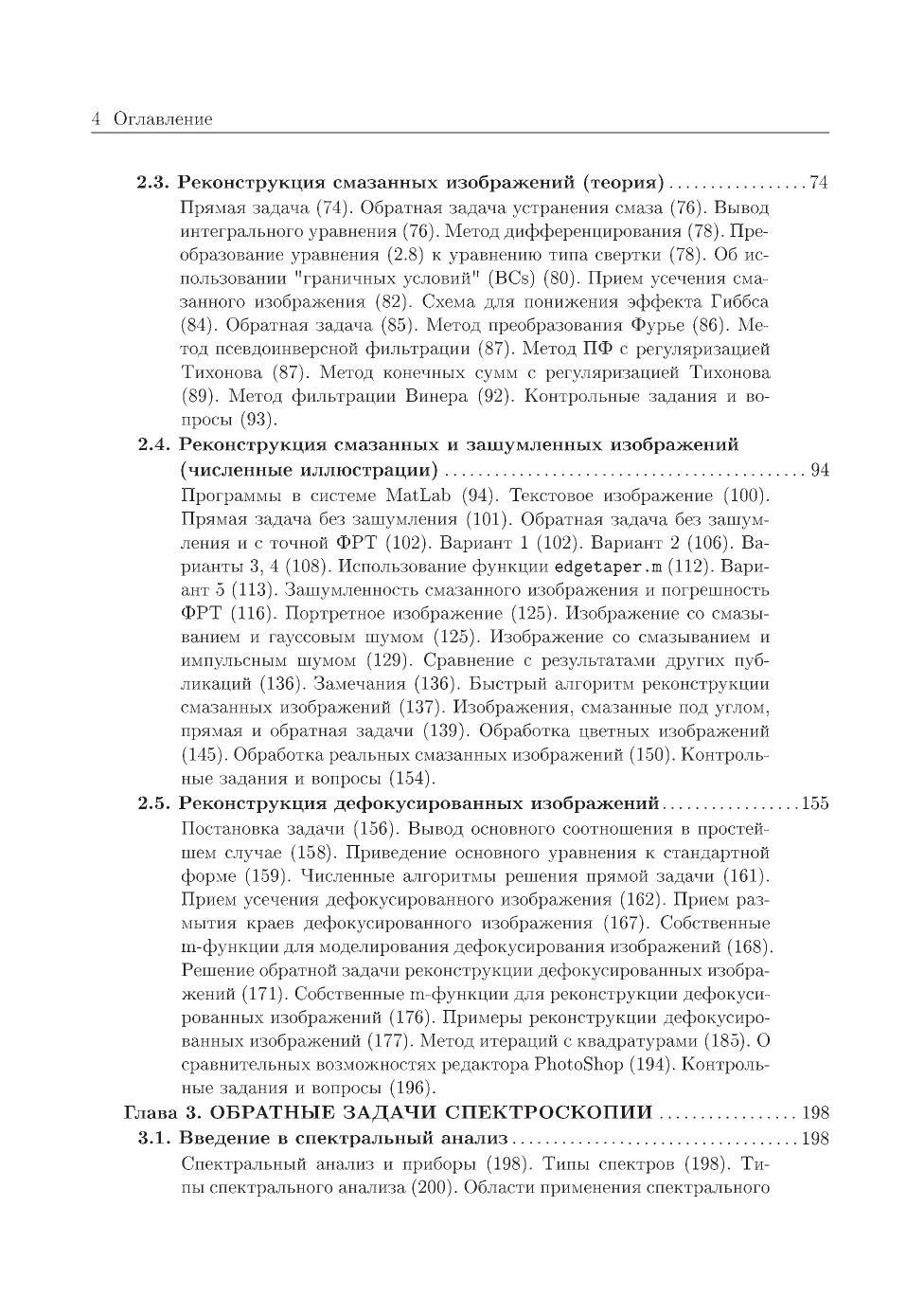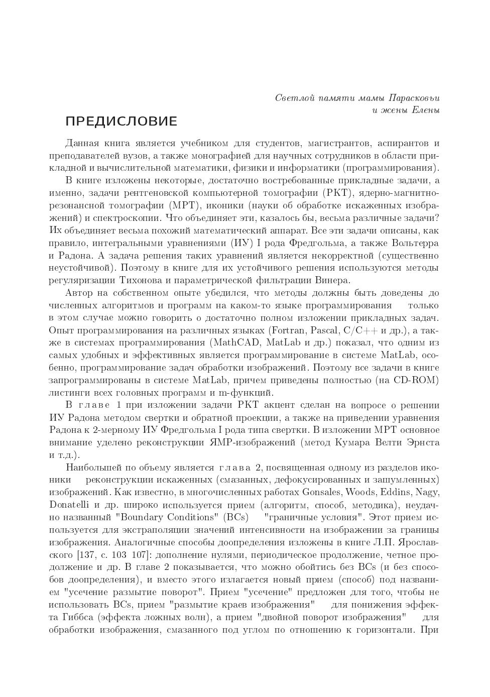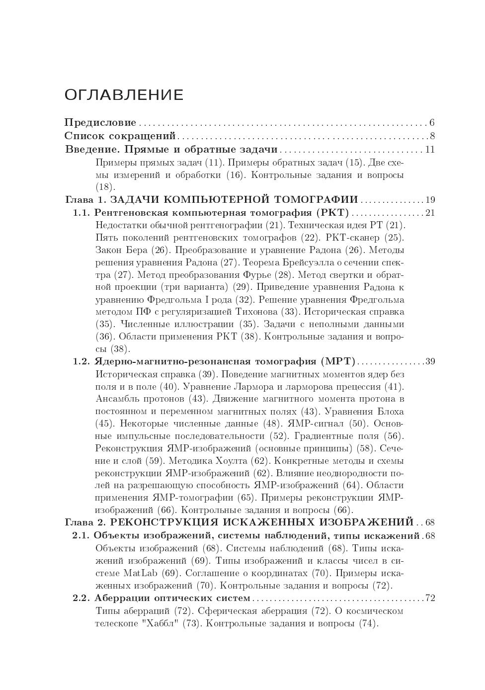 Книга посвящена применению аппарата интегральных уравнений (ИУ) и программных средств системы MatLab к решению ряда прикладных задач томографии, иконики и спектроскопии. Изложены понятия прямых и обратных задач, задачи рентгеновской компьютерной томографии и ЯМР-томографии, задачи иконики — реконструкции искаженных (смазанных, дефокусированных и зашумленных) изображений и спектроскопии. Обратные задачи описаны, как правило, интегральными уравнениями Фредгольма I рода, задача решения которых некорректна, поэтому уравнения решаются методом регуляризации Тихонова или методом параметрической фильтрации Винера. Методы и алгоритмы доведены до программ в версии MatLab 7. Приведены листинги программ и результаты расчетов модельных и реальных примеров. Применительно к задаче иконики изложены как известные методы обработки изображений, так и разработанная автором методика под названием «усечение–размытие–поворот». Изложена также новая методика решения обратной задачи спектроскопии для случая дискретного спектра — алгоритм интегральной аппроксимации. Для студентов, магистрантов, аспирантов и преподавателей вузов, а также для специалистов по прикладной и вычислительной математике.