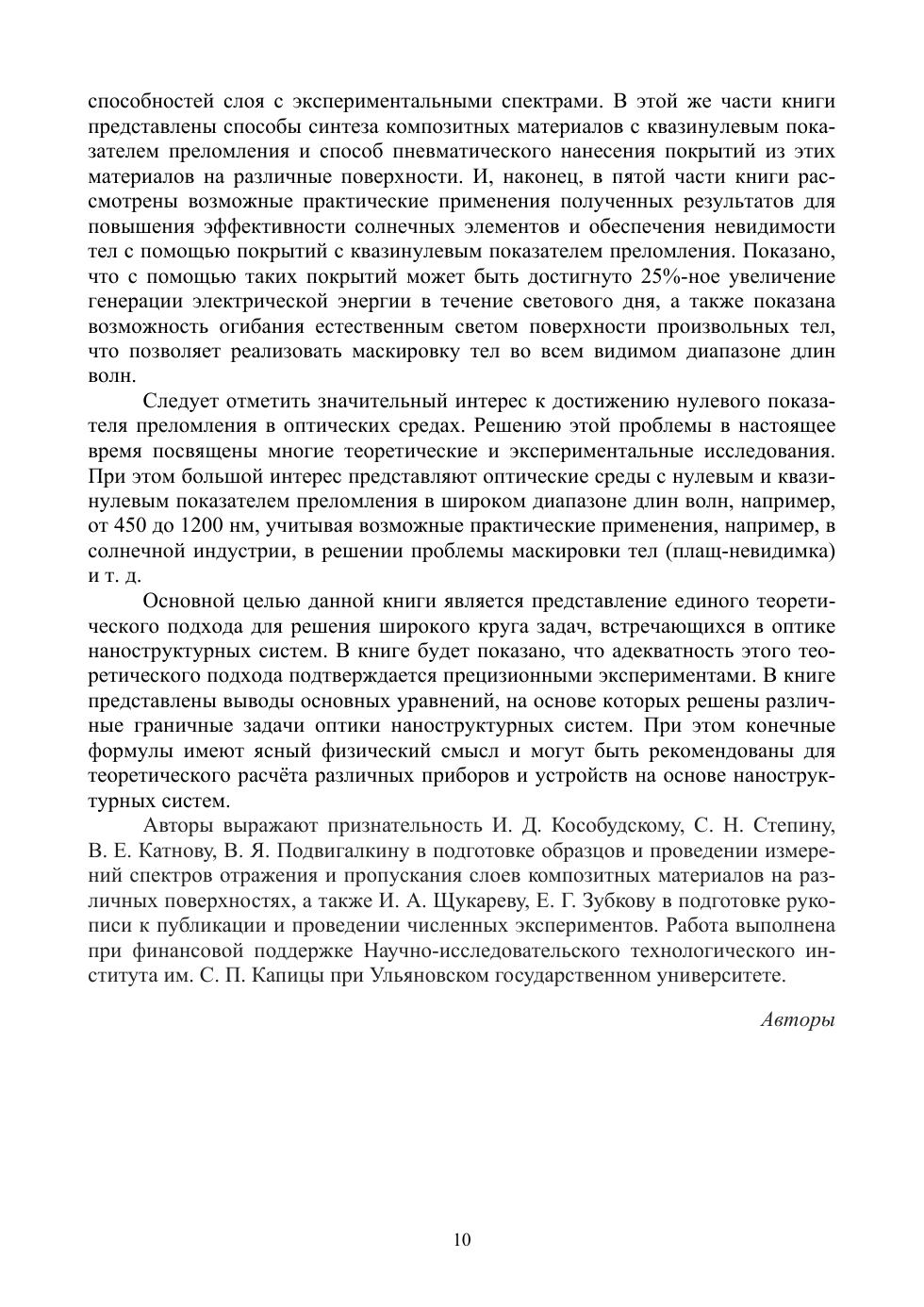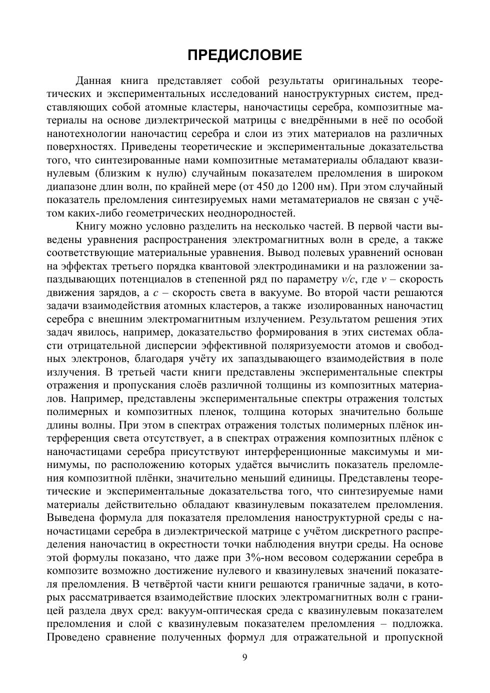В книге представлены результаты оригинальных теоретических и экспериментальных исследований наноструктурных систем, представляющих собой атомные кластеры, наночастицы серебра, композитные материалы на основе диэлектрической матрицы с внедренными в нее наночастицами серебра и слои из этих материалов на различных поверхностях. Приведены доказательства того, что синтезированные композитные метаматериалы обладают квазинулевым (близким к нулю) случайным показателем преломления в широком диапазоне длин волн от 450 до 1200 нм. При этом случайный показатель преломления метаматериалов не связан с учетом каких-либо геометрических неоднородностей.