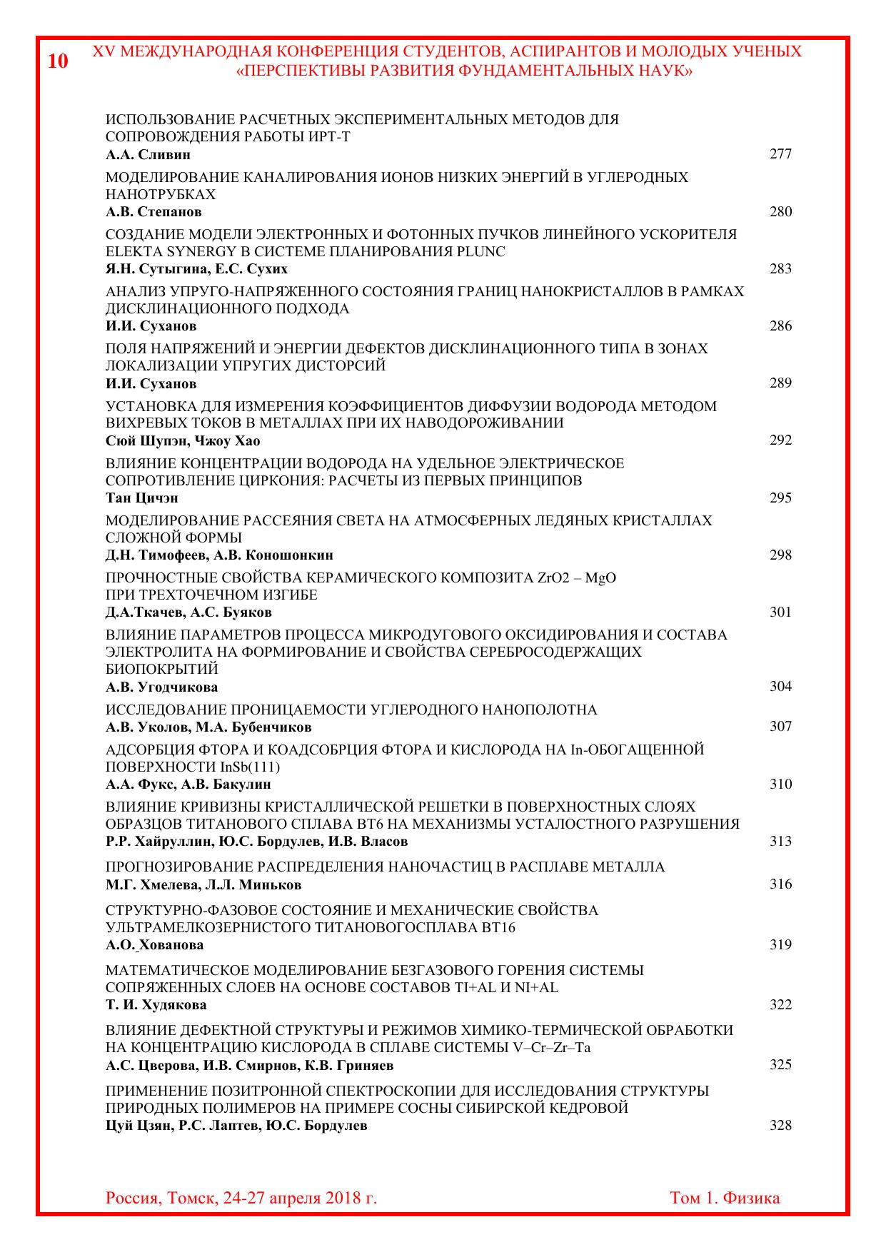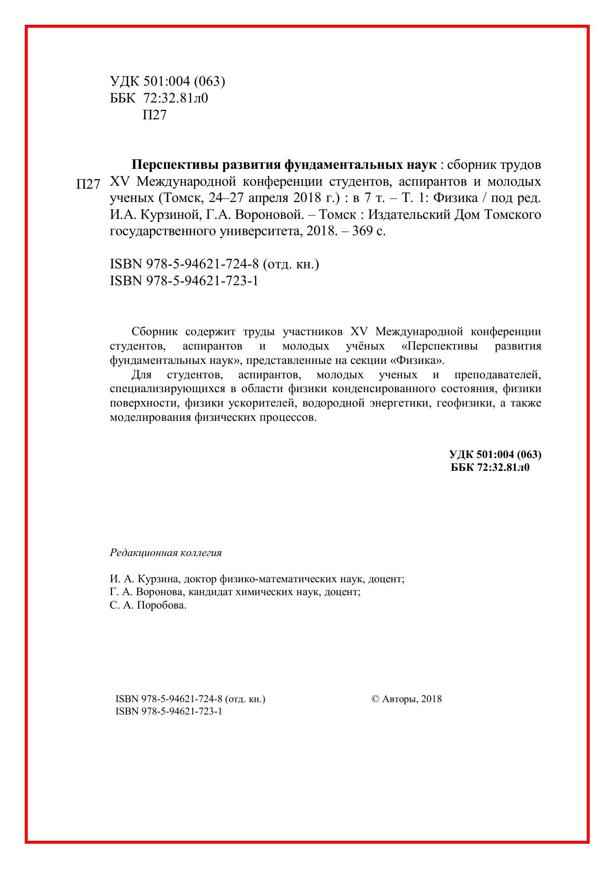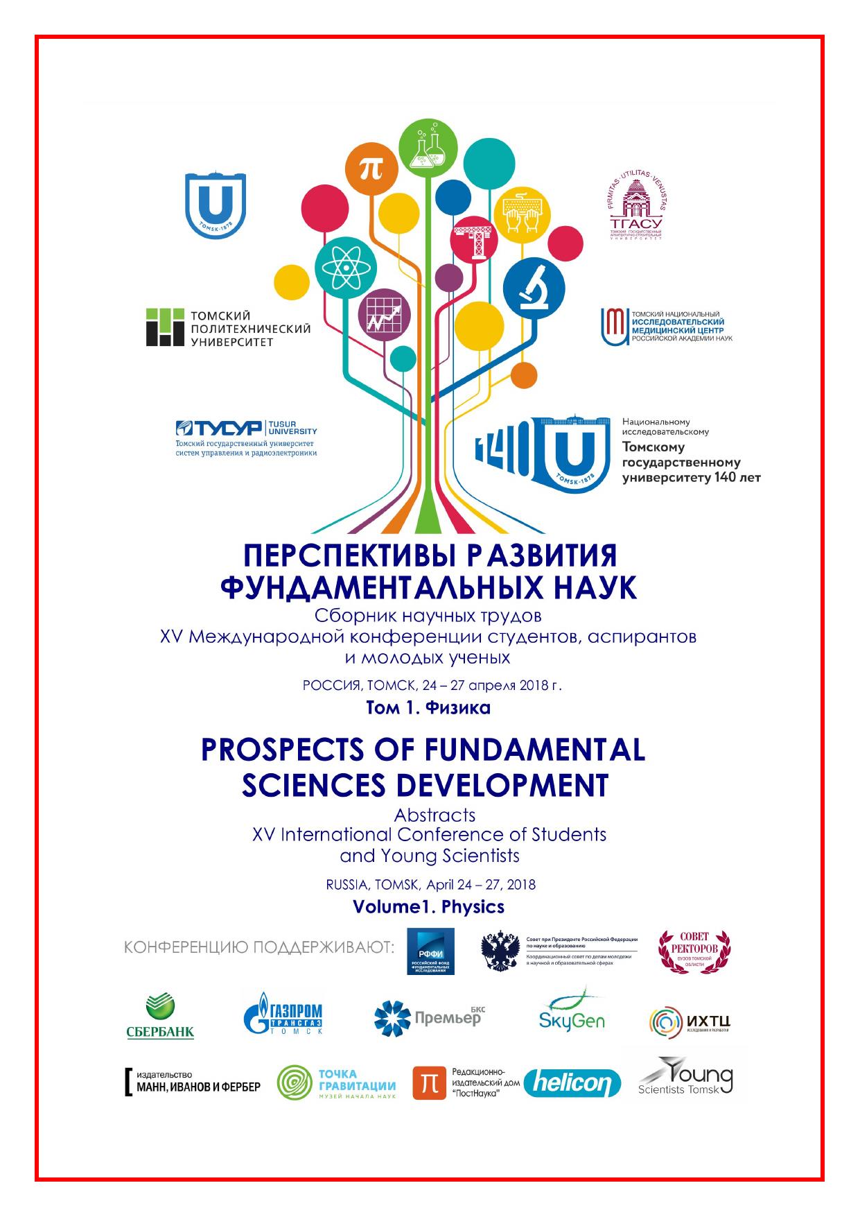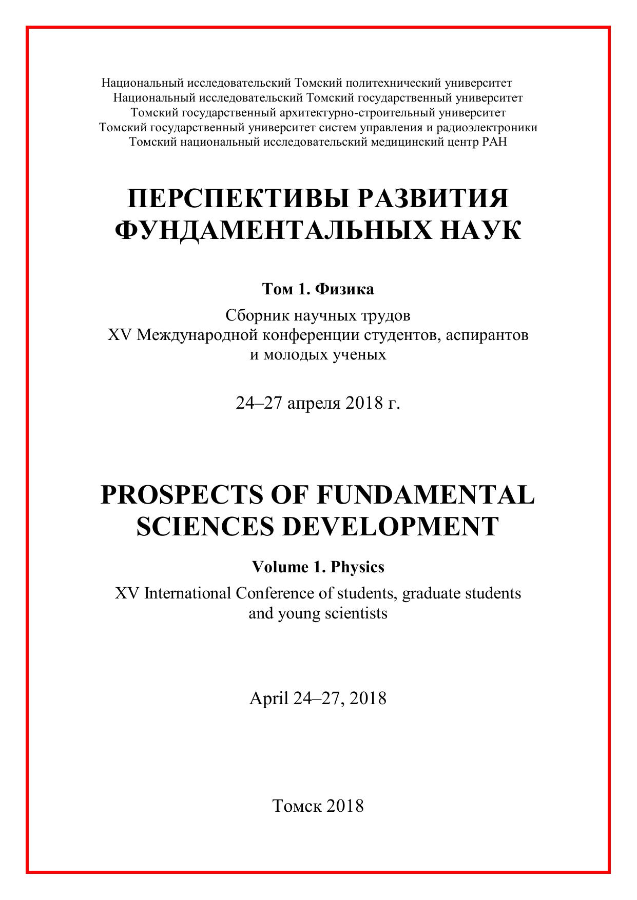 Сборник содержит труды участников XV Международной конференции студентов, аспирантов и молодых учёных «Перспективы развития фундаментальных наук», представленные на секции «Физика». Для студентов, аспирантов, молодых ученых и преподавателей, специализирующихся в области физики конденсированного состояния, физики поверхности, физики ускорителей, водородной энергетики, геофизики, а также моделирования физических процессов.