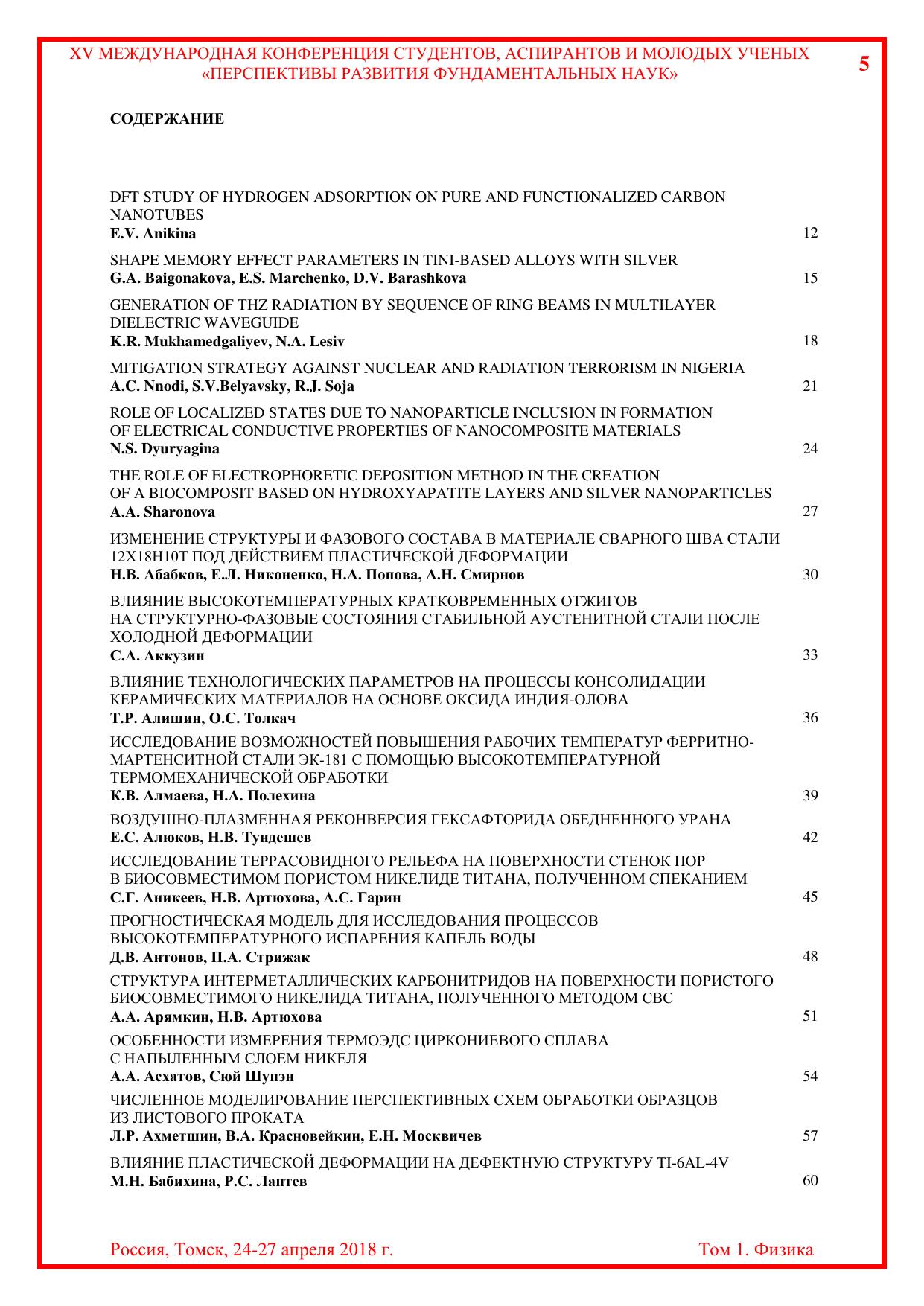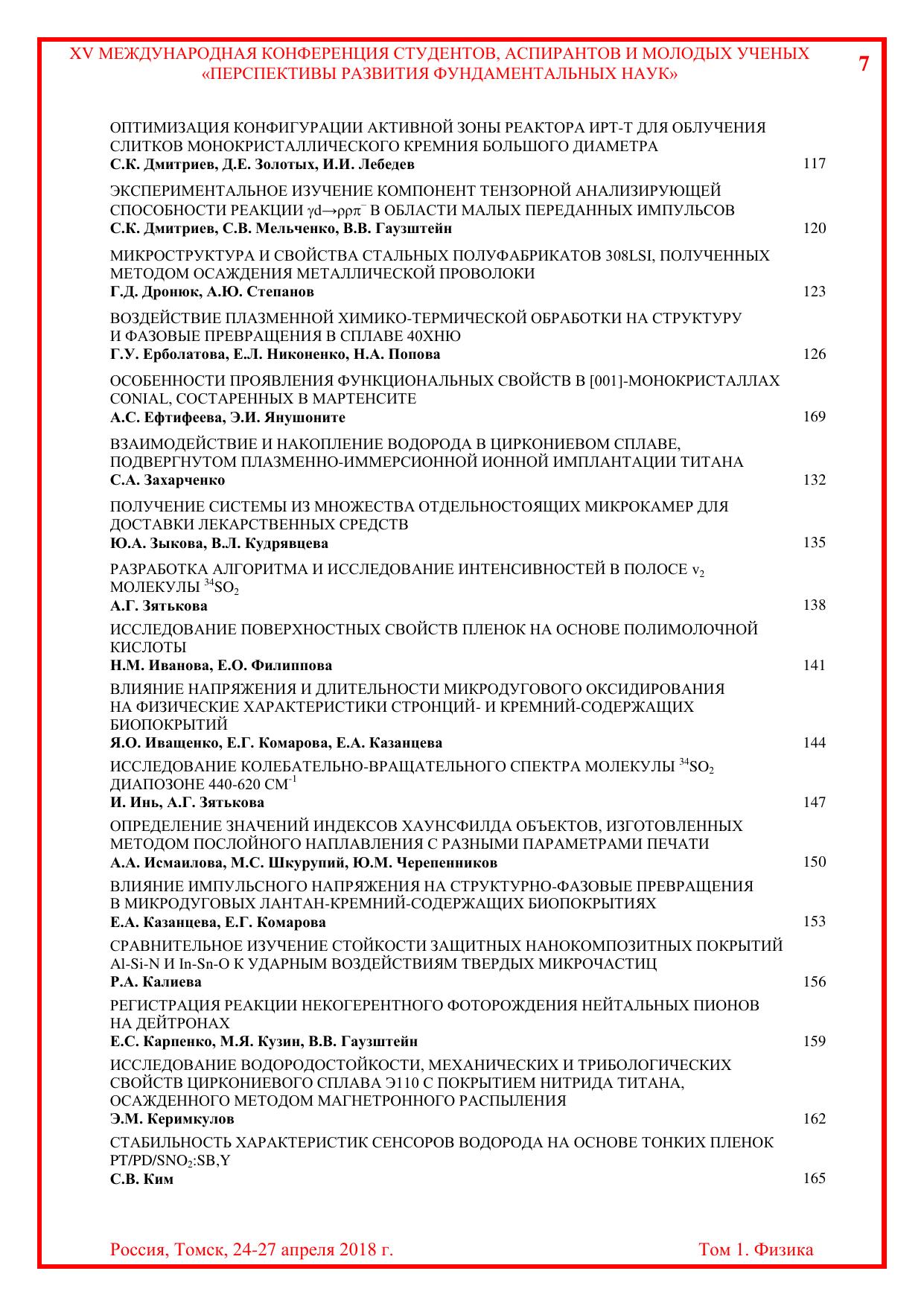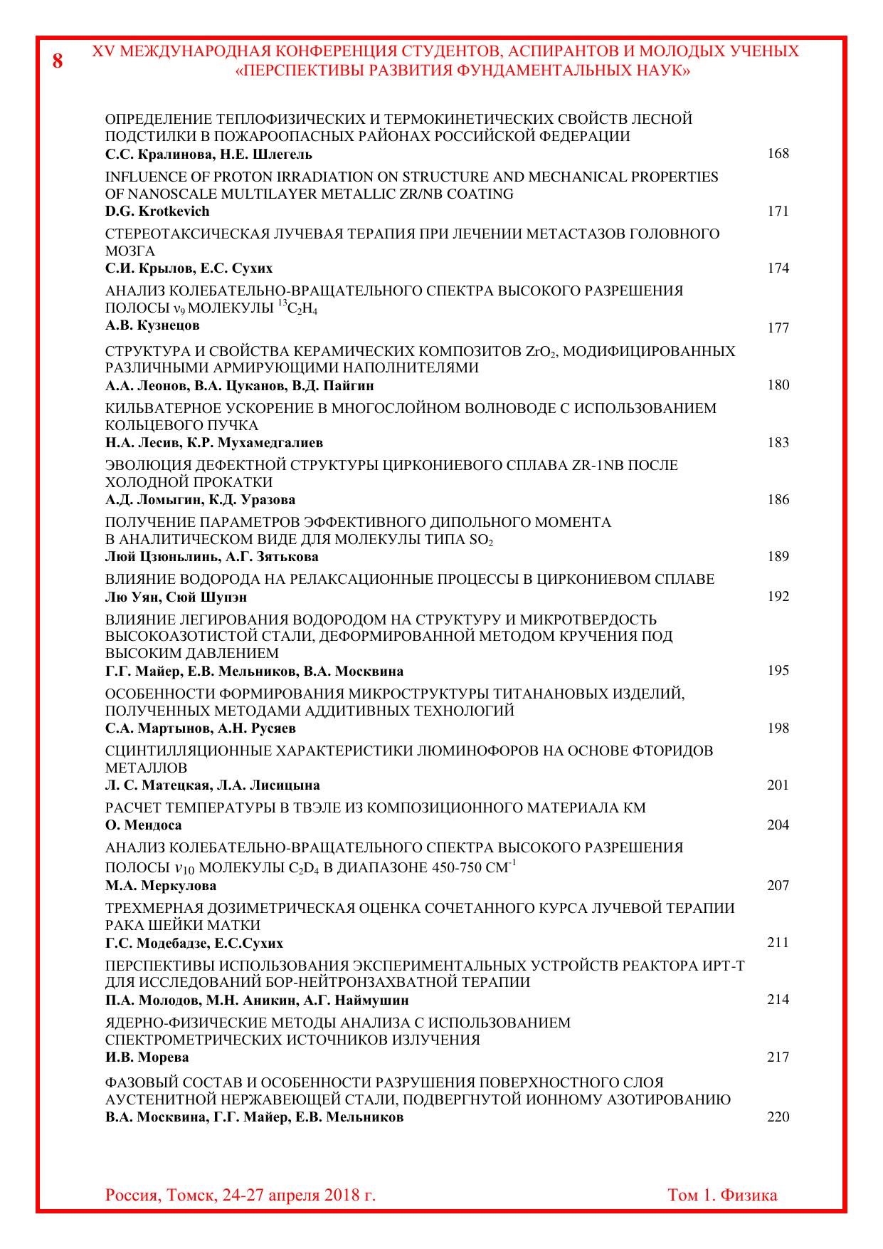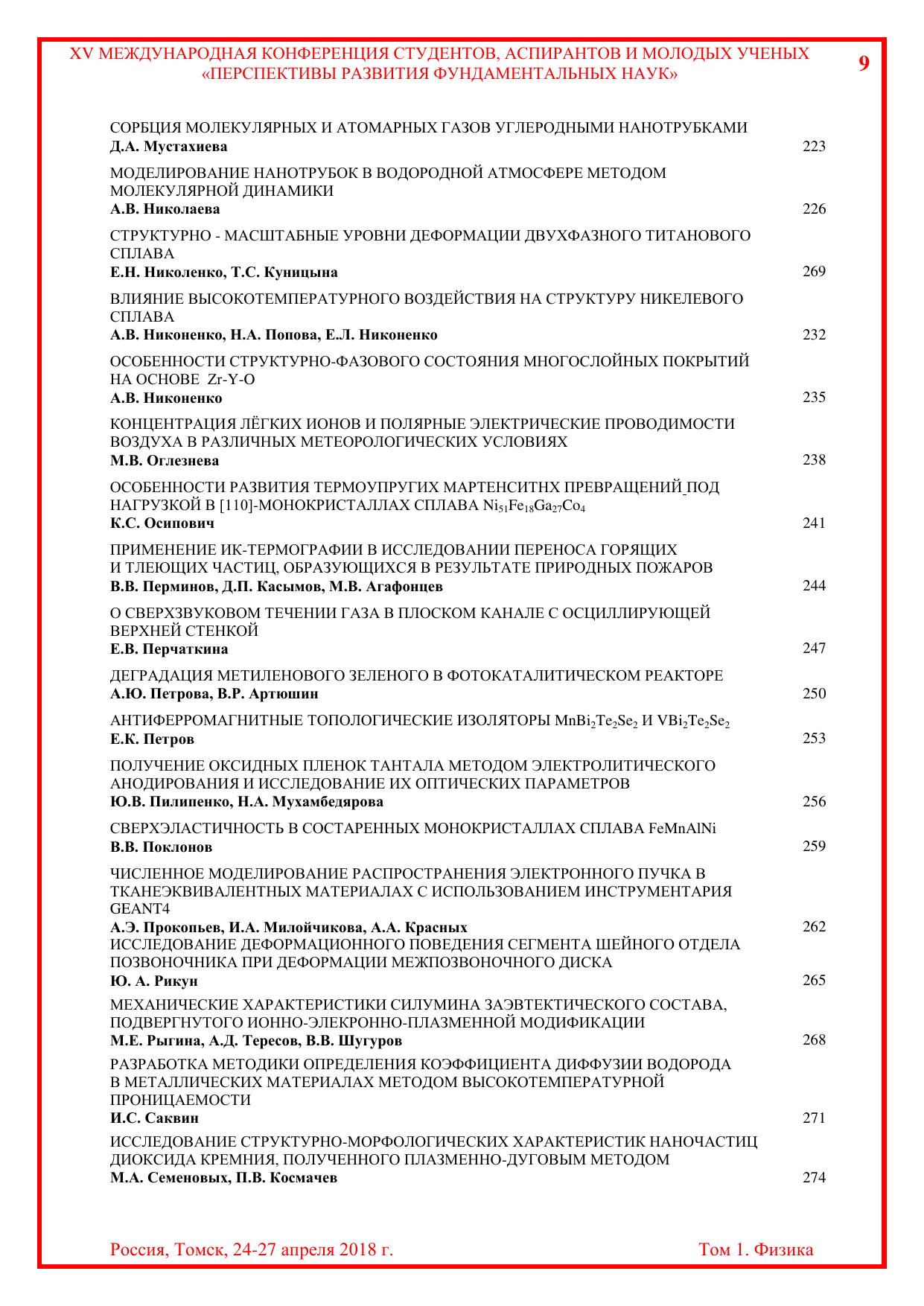 Сборник содержит труды участников XV Международной конференции студентов, аспирантов и молодых учёных «Перспективы развития фундаментальных наук», представленные на секции «Физика». Для студентов, аспирантов, молодых ученых и преподавателей, специализирующихся в области физики конденсированного состояния, физики поверхности, физики ускорителей, водородной энергетики, геофизики, а также моделирования физических процессов.