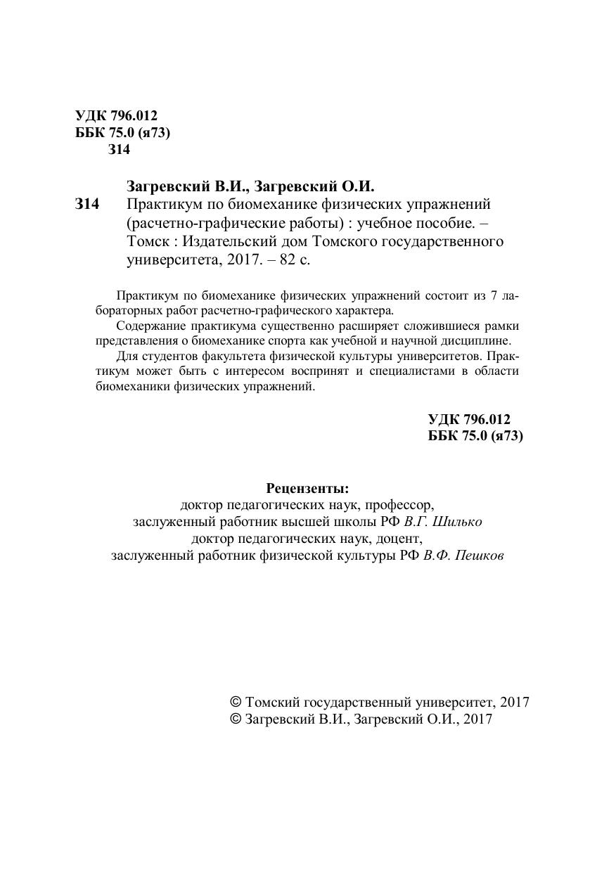 Практикум по биомеханике физических упражнений состоит из 7 лабораторных работ расчетно-графического характера. Содержание практикума существенно расширяет сложившиеся рамки представления о биомеханике спорта как учебной и научной дисциплине. Для студентов факультета физической культуры университетов. Практикум может быть с интересом воспринят и специалистами в области биомеханики физических упражнений.