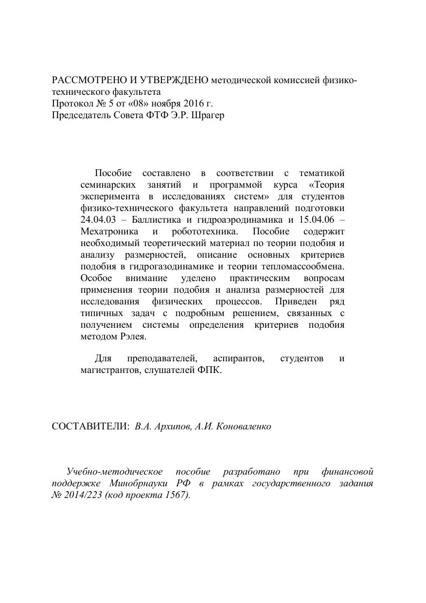 Пособие составлено в соответствии с тематикой семинарских занятий и программой курса «Теория эксперимента в исследованиях систем» для студентов физико-технического факультета направлений подготовки 24.04.03 – Баллистика и гидроаэродинамика и 15.04.06 – Мехатроника и робототехника. Пособие содержит необходимый теоретический материал по теории подобия и анализу размерностей, описание основных критериев подобия в гидрогазодинамике и теории тепломассообмена. Особое внимание уделено практическим вопросам применения теории подобия и анализа размерностей для исследования физических процессов. Приведен ряд типичных задач с подробным решением, связанных с получением системы определения критериев подобия методом Рэлея. Для преподавателей, аспирантов, студентов и магистрантов, слушателей ФПК.