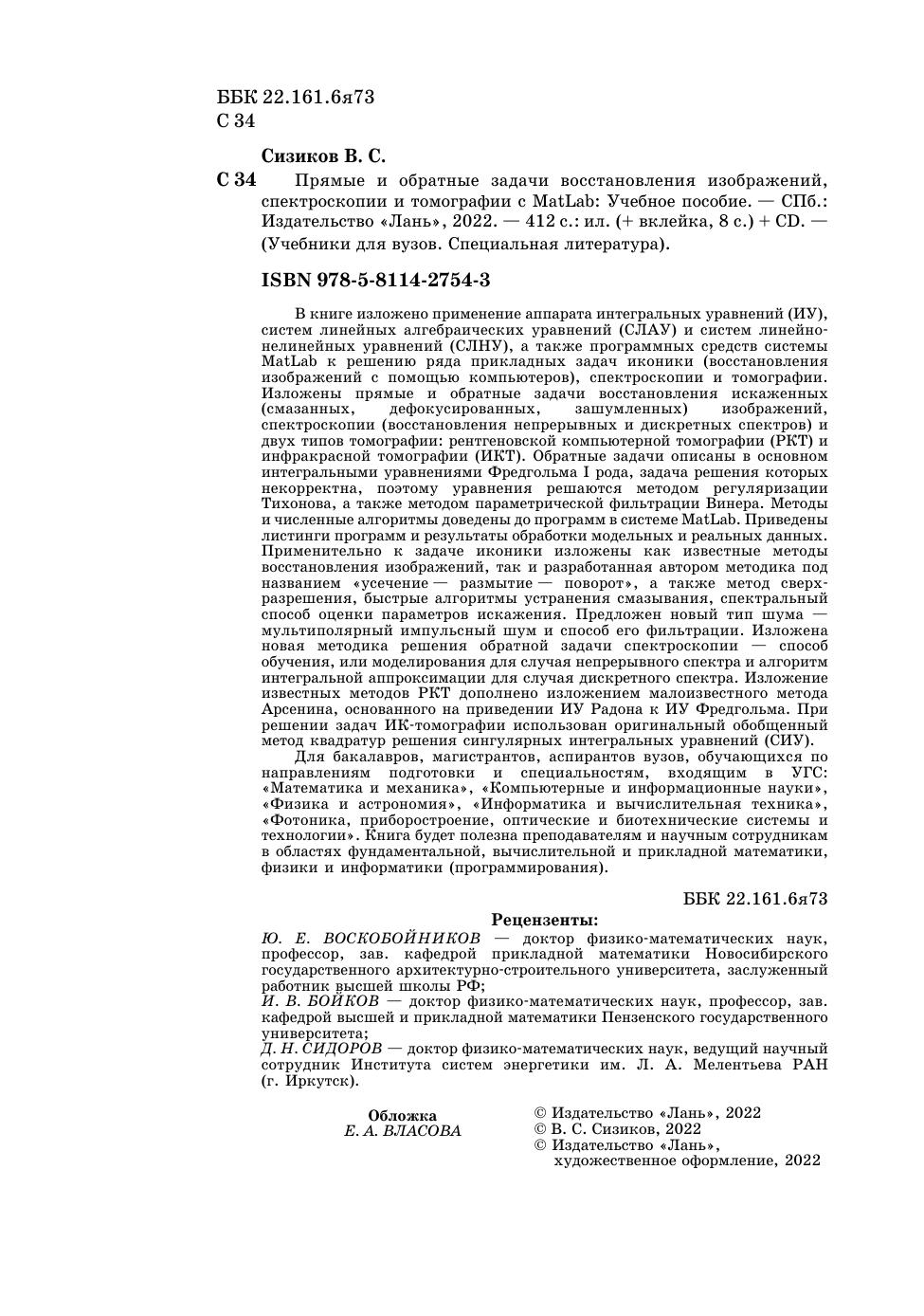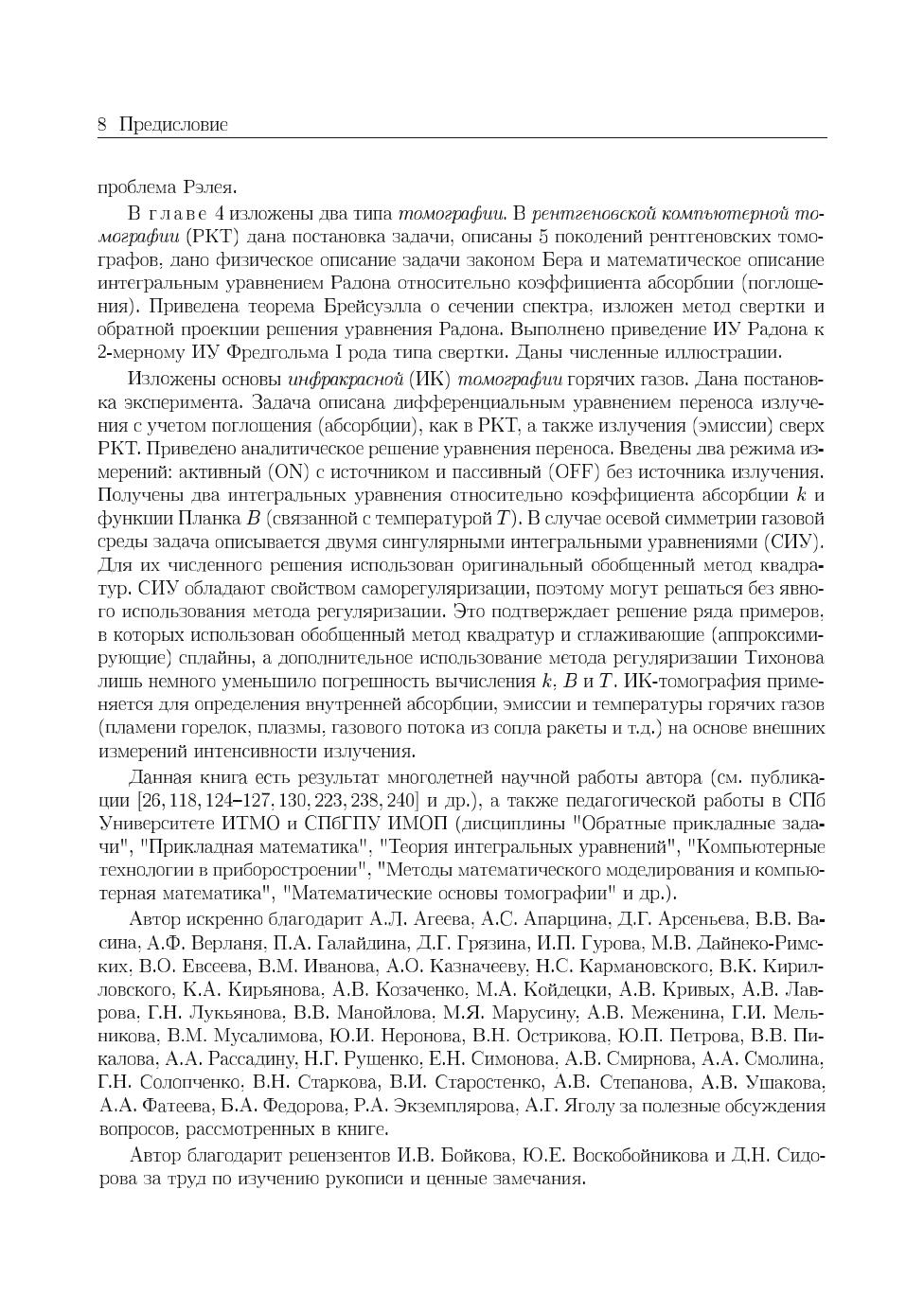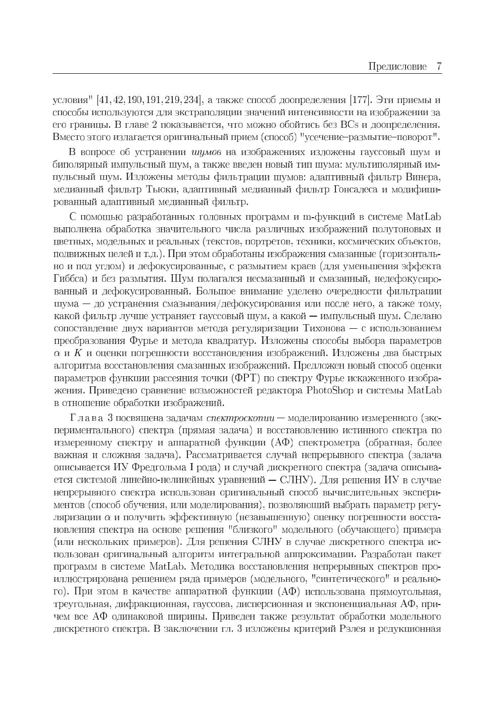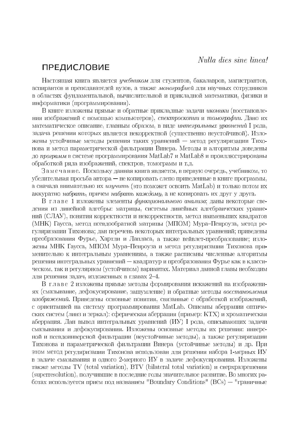 В книге изложено применение аппарата интегральных уравнений (ИУ), систем линейных алгебраических уравнений (СЛАУ) и систем линейно-нелинейных уравнений (СЛНУ), а также программных средств системы MatLab к решению ряда прикладных задач иконики (восстановления изображений с помощью компьютеров), спектроскопии и томографии. Изложены прямые и обратные задачи восстановления искаженных (смазанных, дефокусированных, зашумленных) изображений, спектроскопии (восстановления непрерывных и дискретных спектров) и двух типов томографии: рентгеновской компьютерной томографии (РКТ) и инфракрасной томографии (ИКТ). Обратные задачи описаны в основном интегральными уравнениями Фредгольма I рода, задача решения которых некорректна, поэтому уравнения решаются методом регуляризации Тихонова, а также методом параметрической фильтрации Винера. Методы и численные алгоритмы доведены до программ в системе MatLab. Приведены листинги программ и результаты обработки модельных и реальных данных. Применительно к задаче иконики изложены как известные методы восстановления изображений, так и разработанная автором методика под названием «усечение-размытие-поворот», а также метод сверхразрешения, быстрые алгоритмы устранения смазывания, спектральный способ оценки параметров искажения. Предложен новый тип шума — мультиполярный импульсный шум и способ его фильтрации. Изложена новая методика решения обратной задачи спектроскопии — способ обучения, или моделирования для случая непрерывного спектра и алгоритм интегральной аппроксимации для случая дискретного спектра. Изложение известных методов РКТ дополнено изложением малоизвестного метода Арсенина, основанного на приведении ИУ Радона к ИУ Фредгольма. При решении задач ИК-томографии использован оригинальный обобщенный метод квадратур решения сингулярных интегральных уравнений (СИУ). Для студентов, бакалавров, магистрантов, аспирантов и преподавателей вузов, а также для научных сотрудников в областях фундаментальной, вычислительной и прикладной математики, физики и информатики (программирования).