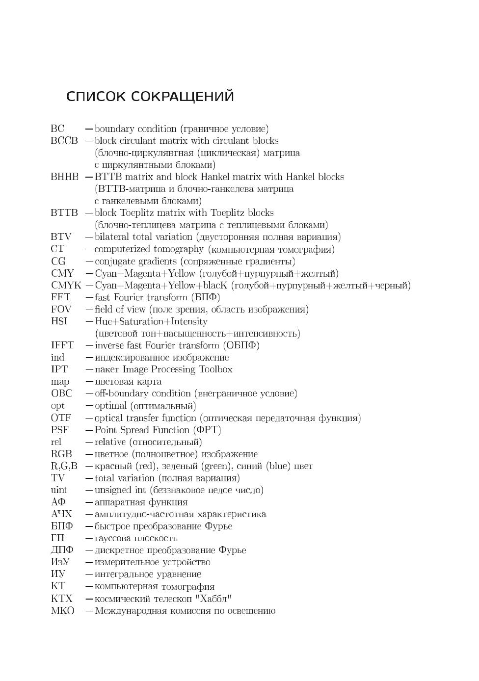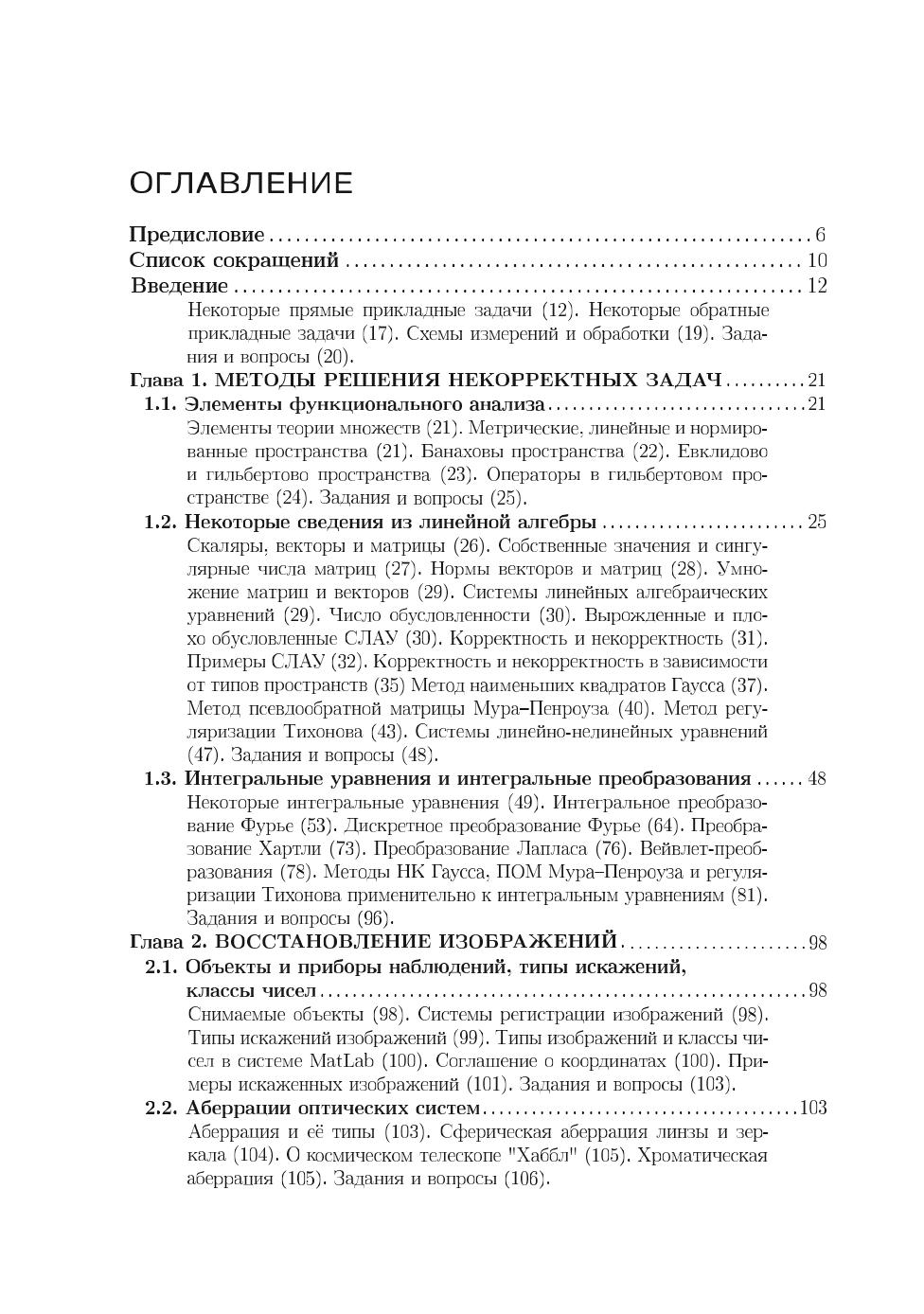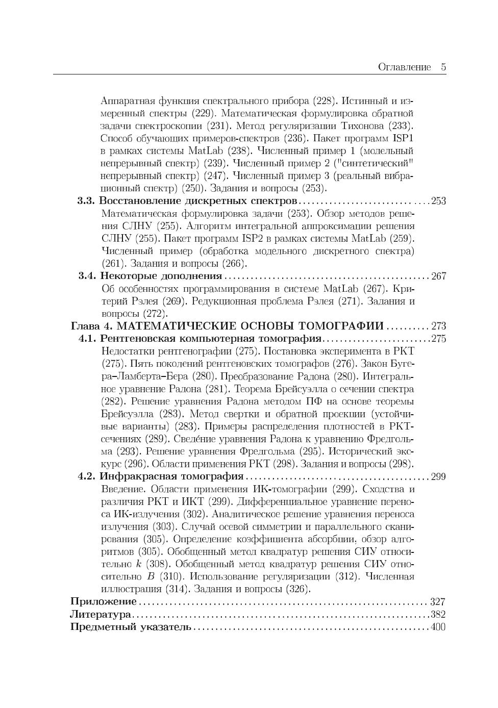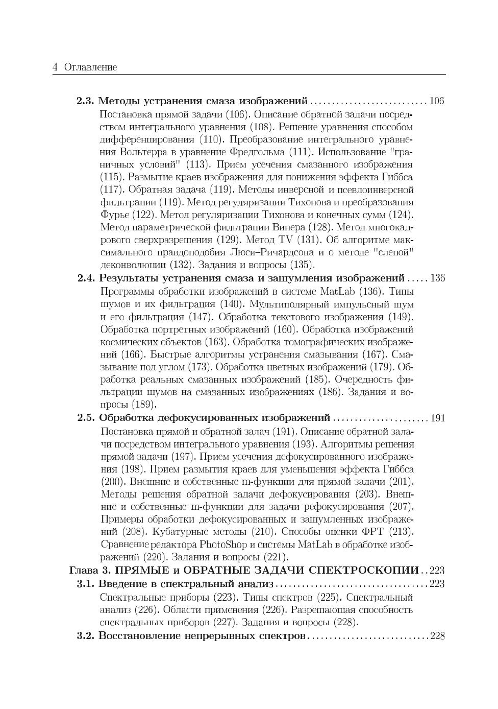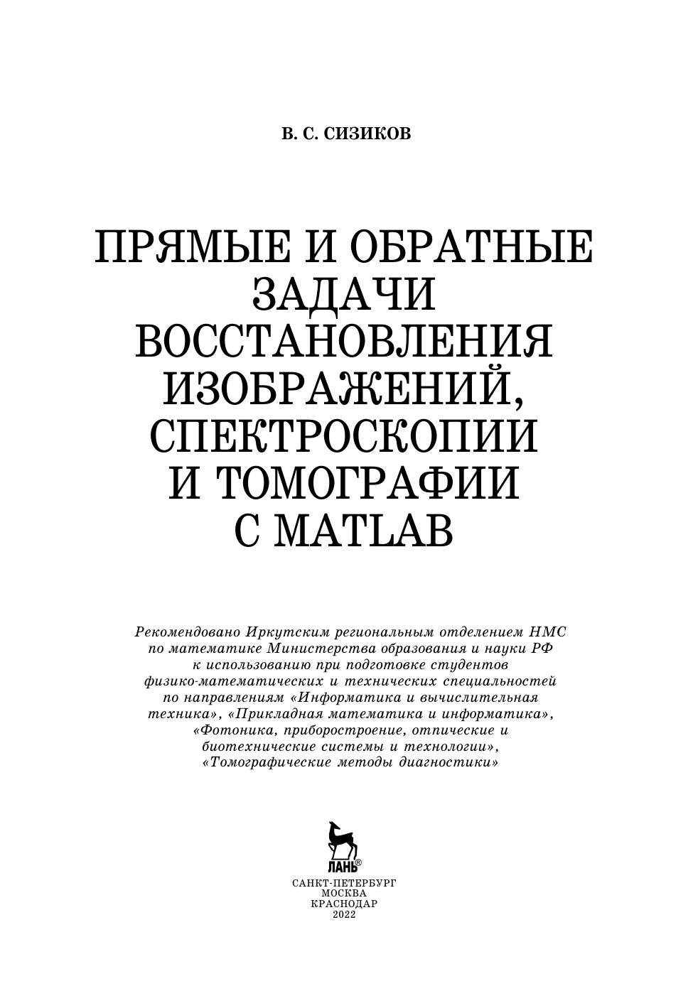 В книге изложено применение аппарата интегральных уравнений (ИУ), систем линейных алгебраических уравнений (СЛАУ) и систем линейно-нелинейных уравнений (СЛНУ), а также программных средств системы MatLab к решению ряда прикладных задач иконики (восстановления изображений с помощью компьютеров), спектроскопии и томографии. Изложены прямые и обратные задачи восстановления искаженных (смазанных, дефокусированных, зашумленных) изображений, спектроскопии (восстановления непрерывных и дискретных спектров) и двух типов томографии: рентгеновской компьютерной томографии (РКТ) и инфракрасной томографии (ИКТ). Обратные задачи описаны в основном интегральными уравнениями Фредгольма I рода, задача решения которых некорректна, поэтому уравнения решаются методом регуляризации Тихонова, а также методом параметрической фильтрации Винера. Методы и численные алгоритмы доведены до программ в системе MatLab. Приведены листинги программ и результаты обработки модельных и реальных данных. Применительно к задаче иконики изложены как известные методы восстановления изображений, так и разработанная автором методика под названием «усечение-размытие-поворот», а также метод сверхразрешения, быстрые алгоритмы устранения смазывания, спектральный способ оценки параметров искажения. Предложен новый тип шума — мультиполярный импульсный шум и способ его фильтрации. Изложена новая методика решения обратной задачи спектроскопии — способ обучения, или моделирования для случая непрерывного спектра и алгоритм интегральной аппроксимации для случая дискретного спектра. Изложение известных методов РКТ дополнено изложением малоизвестного метода Арсенина, основанного на приведении ИУ Радона к ИУ Фредгольма. При решении задач ИК-томографии использован оригинальный обобщенный метод квадратур решения сингулярных интегральных уравнений (СИУ). Для студентов, бакалавров, магистрантов, аспирантов и преподавателей вузов, а также для научных сотрудников в областях фундаментальной, вычислительной и прикладной математики, физики и информатики (программирования).