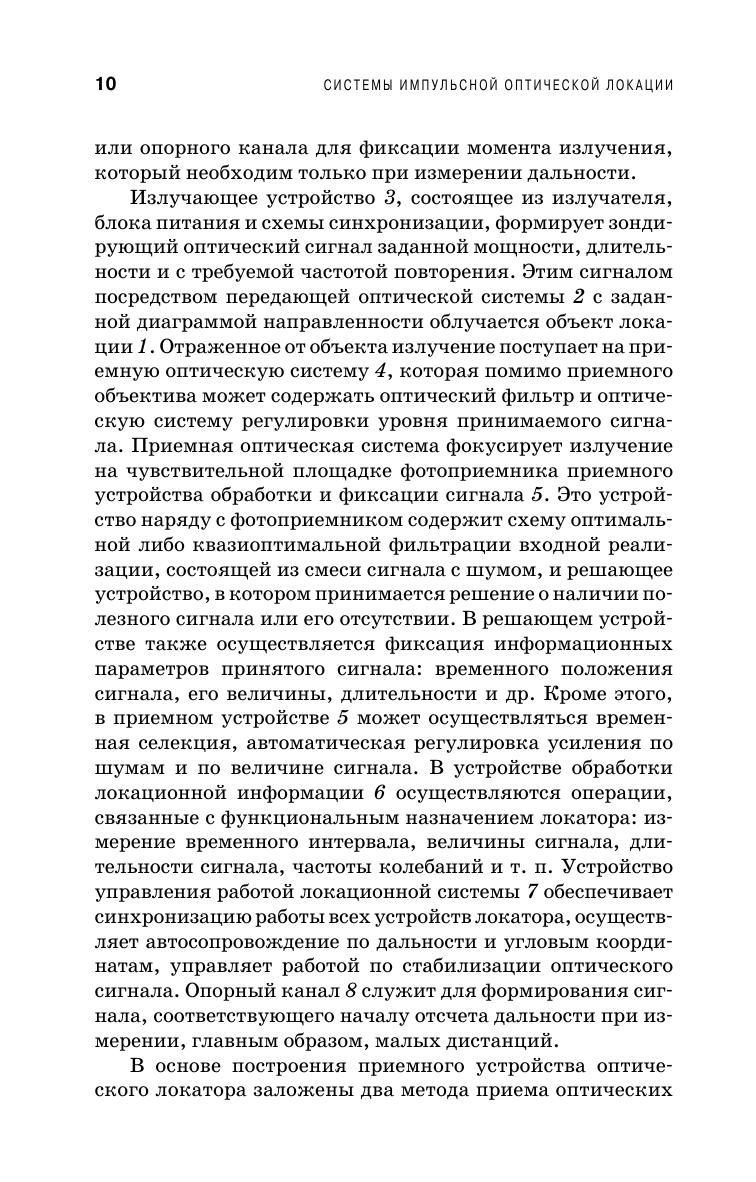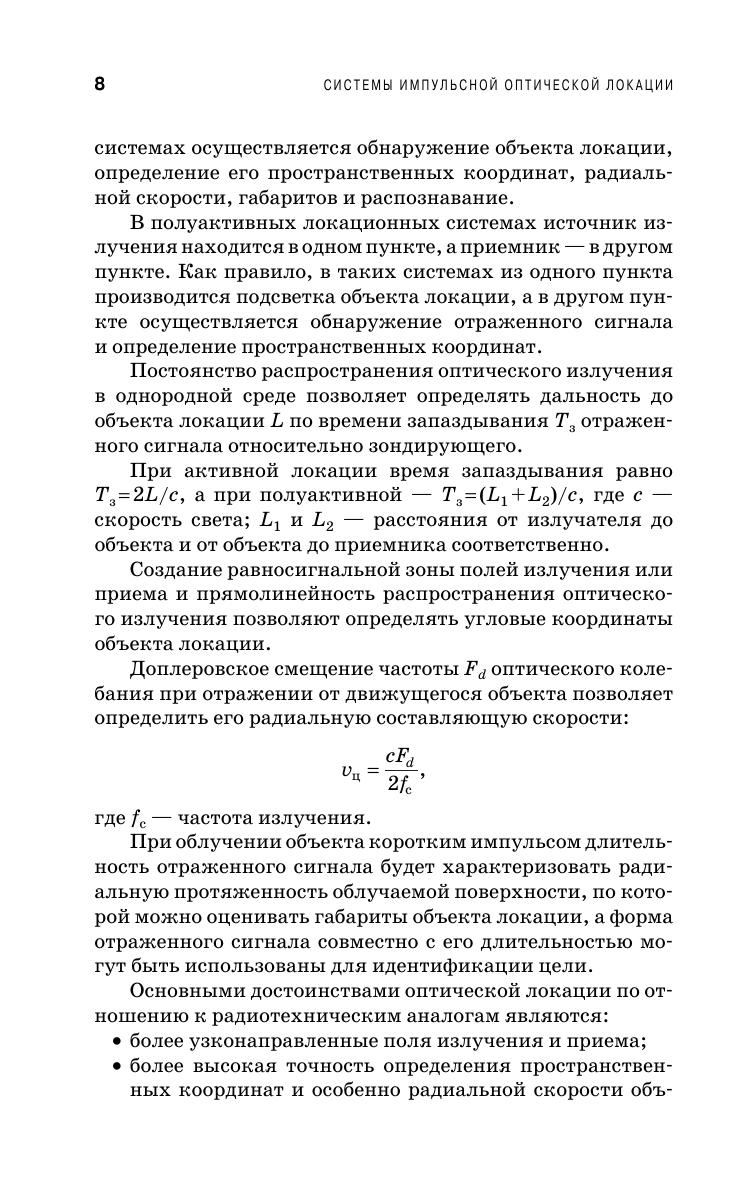 Изложены основы импульсной оптической локации. Рассмотрены энергетические и энергетическо-временные отражательные характеристики облучаемых поверхностей и методы их расчета. Описаны основные виды помех и их статистики. Изложены основы обнаружения и оценки импульсных сигналов, в том числе и при инерционном приеме. Рассмотрено влияние временного формирование излучения на условия обнаружения и точность измерения. Приведена методика энергетического и точностного расчета. Изложены принципы построения различных видов импульсных оптических локационных систем. Книга предназначена для студентов, обучающихся по направлению «Оптотехника», также будет полезна студентам радиотехнических специальностей и аспирантам, инженерам и научным работникам, занимающимся разработкой оптических локационных систем.