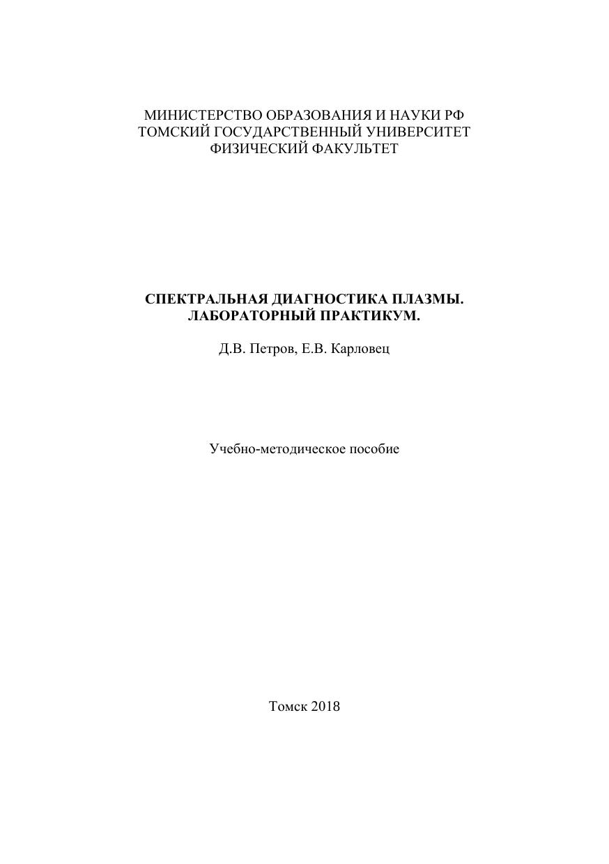 Представлены основы спектральной диагностики плазмы, описана необходимая инструментальная база, а также изложены рекомендации для выполнения лабораторных работ. Пособие составлено в соответствии с тематикой практических занятий и программой курса «Спектроскопия плазмы» студентов физического факультета ТГУ. Предназначено для бакалавров и магистрантов, обучающихся по направлениям подготовки 03.03.02 Физика. 03.04.02 Физика. Фундаментальная и прикладная физика.