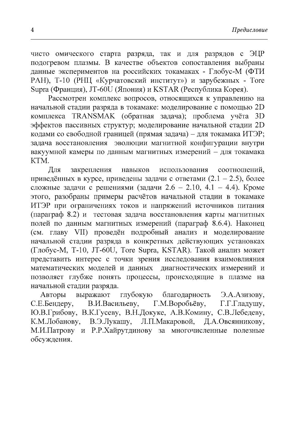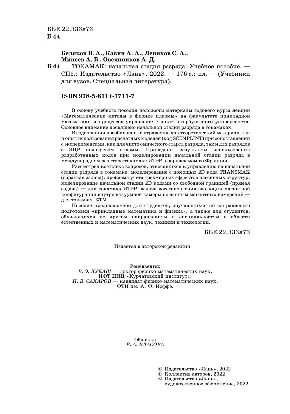 В основу учебного пособия положены материалы годового курса лекций «Математические методы в физике плазмы» на факультете прикладной математики и процессов управления Санкт-Петербургского университета. Основное внимание посвящено начальной стадии разряда в токамаках. В содержании пособия нашли отражение как теоретический материал, так и опыт использования расчетных моделей (код SCENPLINT) при сопоставлении с экспериментами, как для чисто омического старта разряда, так и для разрядов с ЭЦР подогревом плазмы. Приведены результаты использования разработанных кодов при моделировании начальной стадии разряда в международном реакторе-токамаке ИТЭР, сооружаемом во Франции. Рассмотрен комплекс вопросов, относящихся к управлению на начальной стадии разряда в токамаке: моделирование с помощью 2D кода TRANSMAK (обратная задача), проблема учета трехмерных эффектов пассивных структур, моделирование начальной стадии 2D кодами со свободной границей (прямая задача) — для токамака ИТЭР, задача восстановления эволюции магнитной конфигурации внутри вакуумной камеры по данным магнитных измерений — для токамака КТМ. Пособие предназначено для студентов, обучающихся по направлению подготовки «Прикладные математика и физика», а также для студентов, обучающихся по другим направлениям и специальностям в области естественных и математических наук, техники и технологии.
