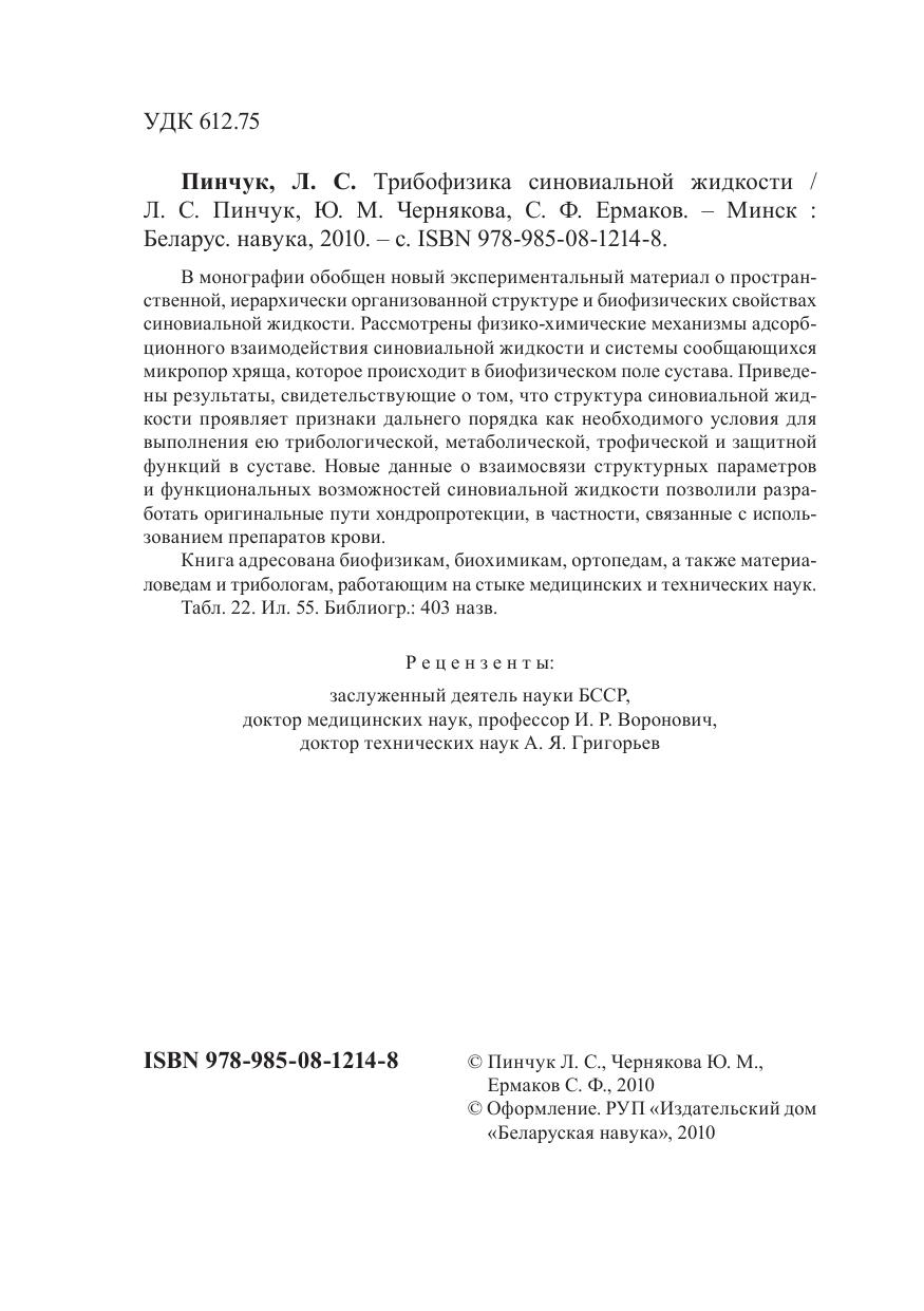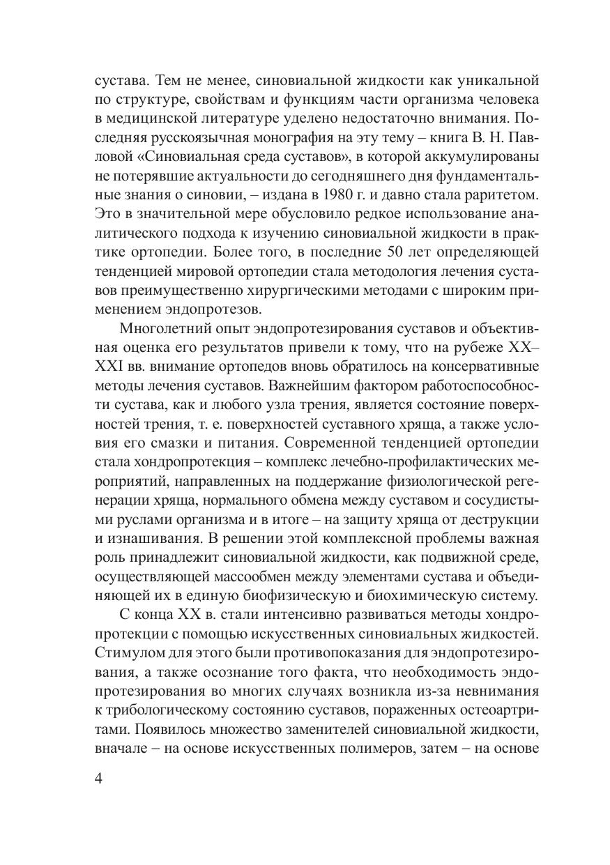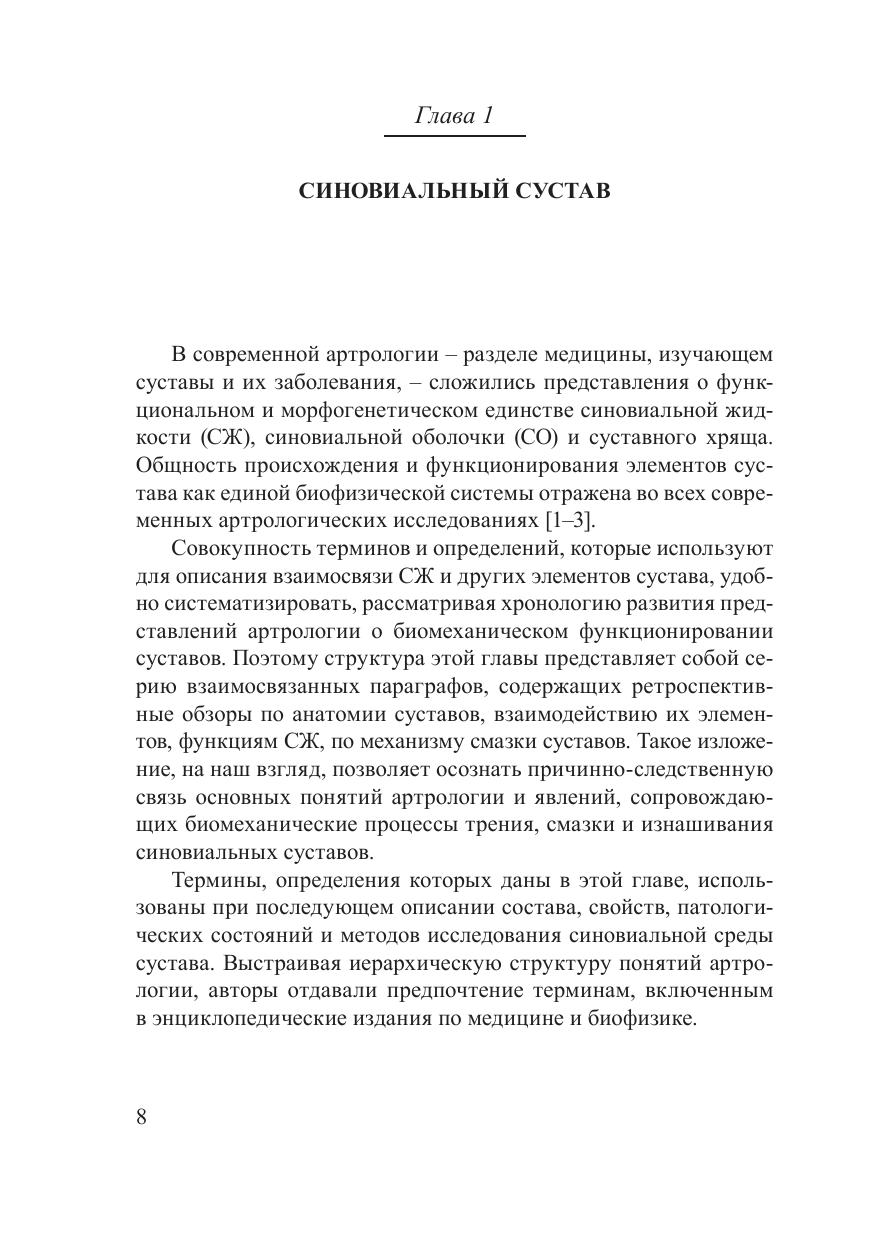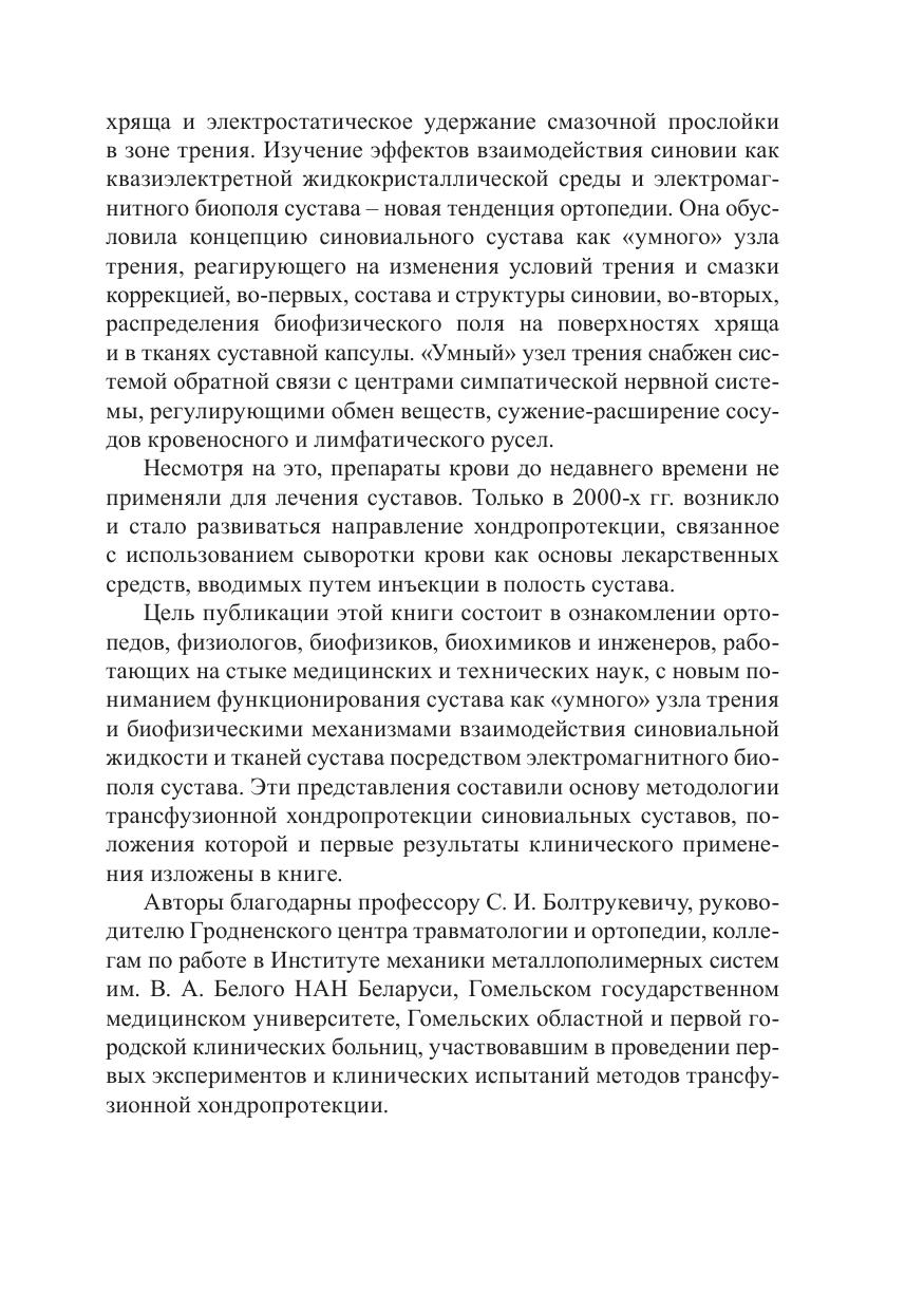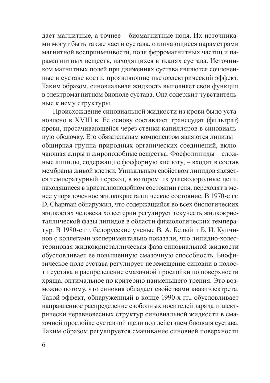 В монографии обобщен новый экспериментальный материал о пространственной, иерархически организованной структуре и биофизических свойствах синовиальной жидкости. Рассмотрены физико-химические механизмы адсорбционного взаимодействия синовиальной жидкости и системы сообщающихся микропор хряща, которое происходит в биофизическом поле сустава. Приведены результаты, свидетельствующие о том, что структура синовиальной жидкости проявляет признаки дальнего порядка как необходимого условия для выполнения ею трибологической, метаболической, трофической и защитной функций в суставе. Новые данные о взаимосвязи структурных параметров и функциональных возможностей синовиальной жидкости позволили разработать оригинальные пути хондропротекции, в частности, связанные с использованием препаратов крови. Книга адресована биофизикам, биохимикам, ортопедам, а также материаловедам и трибологам, работающим на стыке медицинских и технических наук.