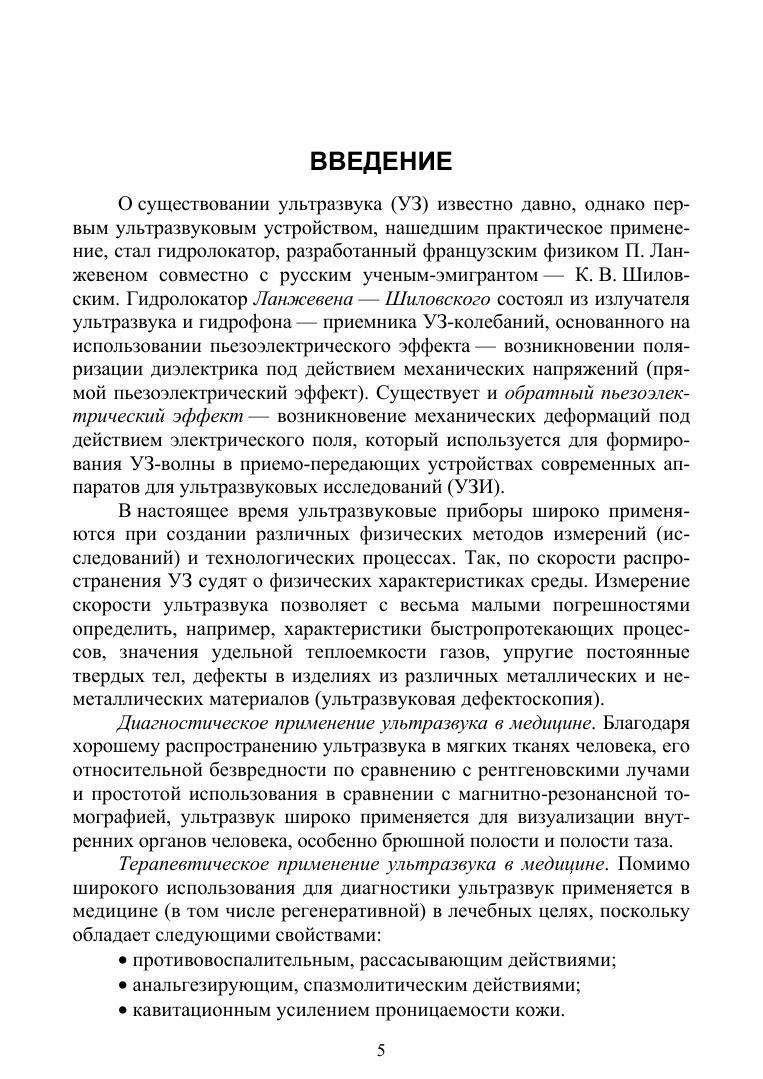 Учебное пособие содержит теоретический материал, касающийся физических основ ультразвука, особенностей взаимодействия ультразвука с биологическими тканями и его применения в медицине, ультразвуковой допплерографии, визуализации различных органов. Рассмотрены также современные методы ультразвуковой диагностики, такие как ультразвуковая эластография, ультразвуковое исследование с контрастным усилением и др. Пособие предназначено для студентов вузов.
