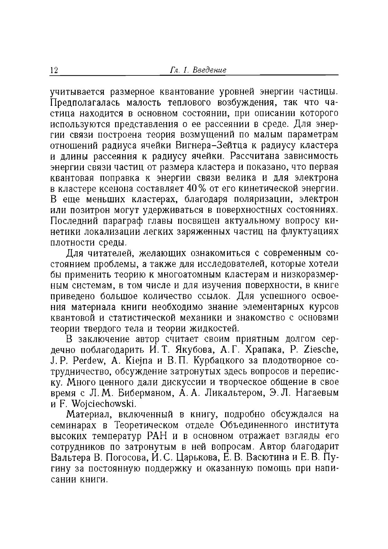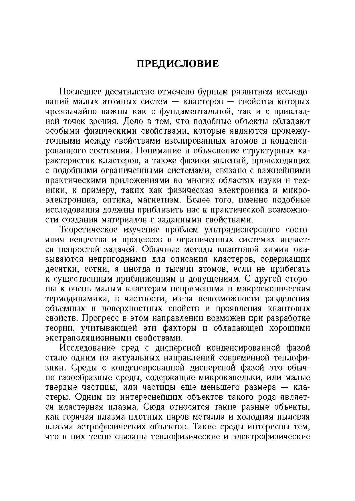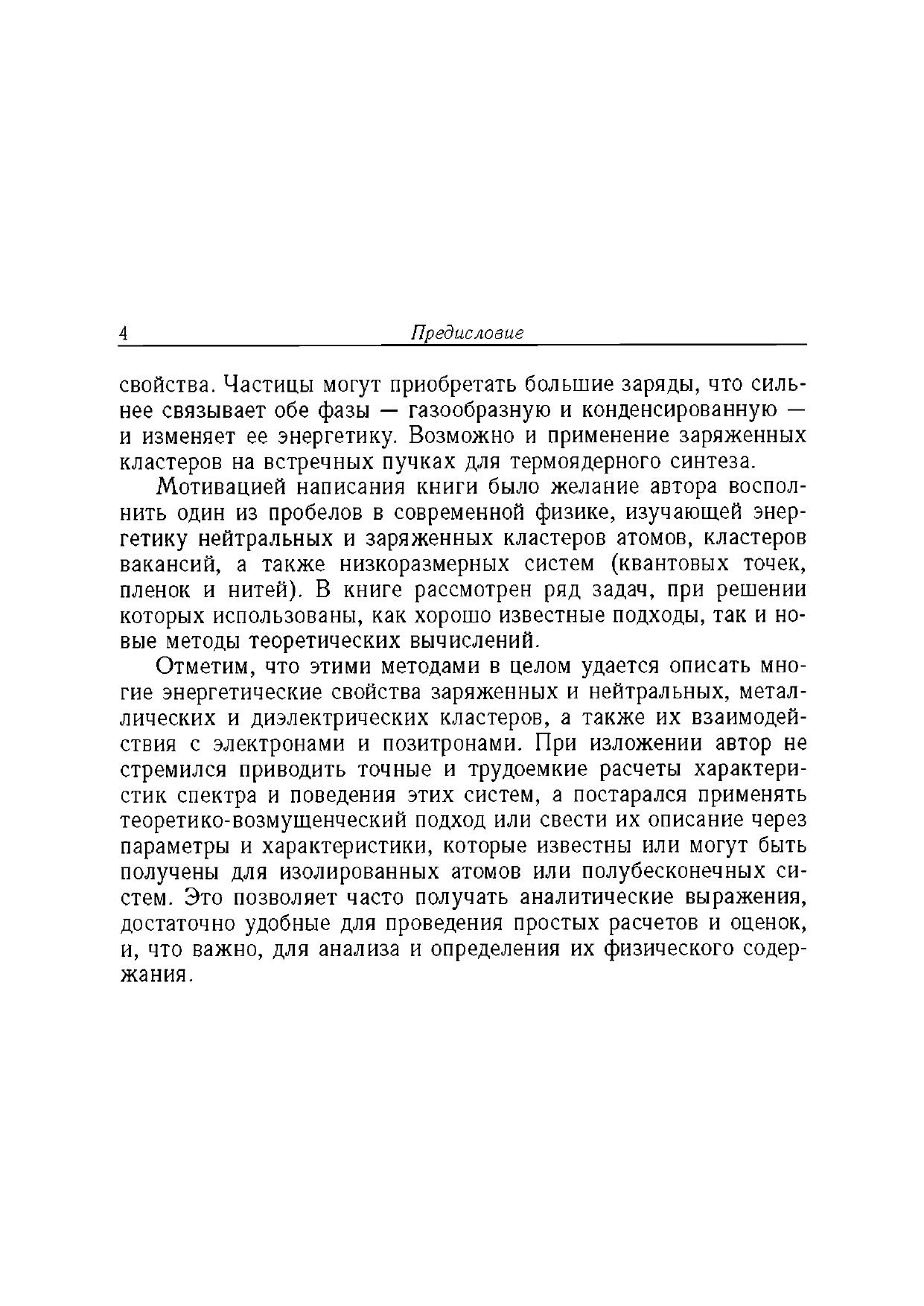 Излагаются результаты исследований поверхности термодинамических и электрофизических характеристик кластеров атомов и кластеров вакансий кинетических и равновесных свойств низкоразмерных систем и кластерной плазмы паров металлов процессов рассеяния и локализации позитронов в металлах, жидкостях и кластерах. Рассмотрены деформационная и температурная зависимости работы выхода электронов, размерный эффект потенциала ионизации и энергии прилипания, поверхностного натяжения локализованные состояний позитронов, которые могут быть использованы при изучении процессов конденсации, испарения, тензоэмиссионных эффектов, а также диагностики радиационных или равновесных дефектов различных сред. Используются аналитические и полуколичественные методы исследования, приводятся модельные оценки, изучаются асимптотики размерно зависящих физических величин. Применение методов иллюстрируется достаточно большим количеством задач из различных областей физики. Для научных работников, аспирантов и студентов, специализирующихся в области физики конденсированного и плазменного состояния, наносистем и микроэлектроники. Рекомендовано УМО вузов Российской Федерации по образованию в области прикладной математики и физики в качестве учебного пособия для студентов, обучающихся по специальностям