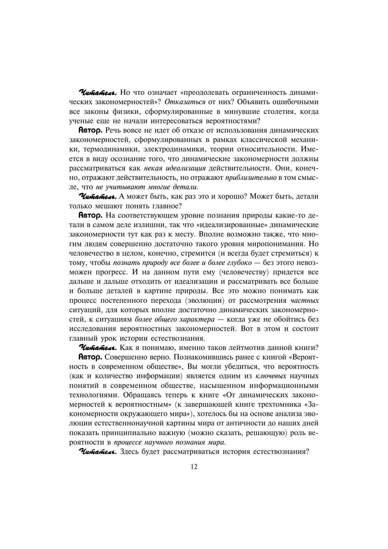 Данная книга завершает трехтомник автора с общим названием «Закономерности окружающего мира» (первая книга: «Случайность, необходимость, вероятность», вторая книга: «Вероятность в современном обществе», третья книга: «От динамических закономерностей к вероятностным»). Здесь в популярной и систематизированной форме анализируется эволюция естественнонаучных картин мира: от научных программ античности к механической картине, затем к электромагнитной картине и, наконец, к современной картине. Демонстрируется переход от динамических (жестко детерминированных) закономерностей к статистическим (вероятностным) закономерностям по мере постепенно углубляющегося научного постижения человеком окружающего мира. Достаточно подробно рассматривается эволюция представлений квантовой физики, физики элементарных частиц, космологии. В заключение обсуждаются идеи самоорганизации открытых неравновесных систем (возникновение диссипативных структур). Для широкого круга читателей и в первую очередь для школьников старших классов (начиная с 9-го класса), а также для студентов техникумов и высших учебных заведений.