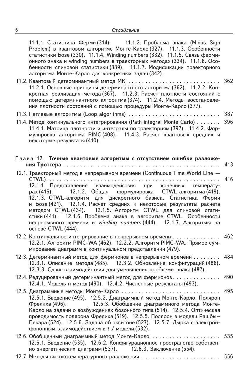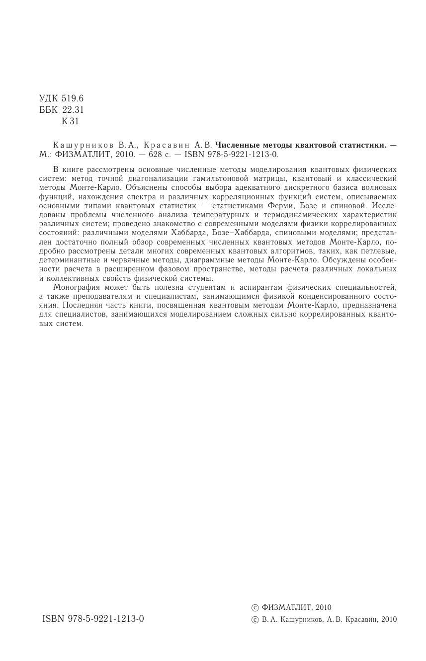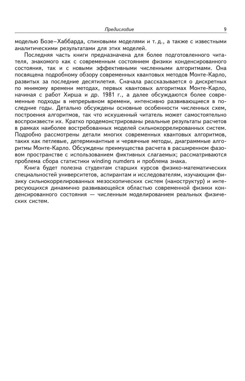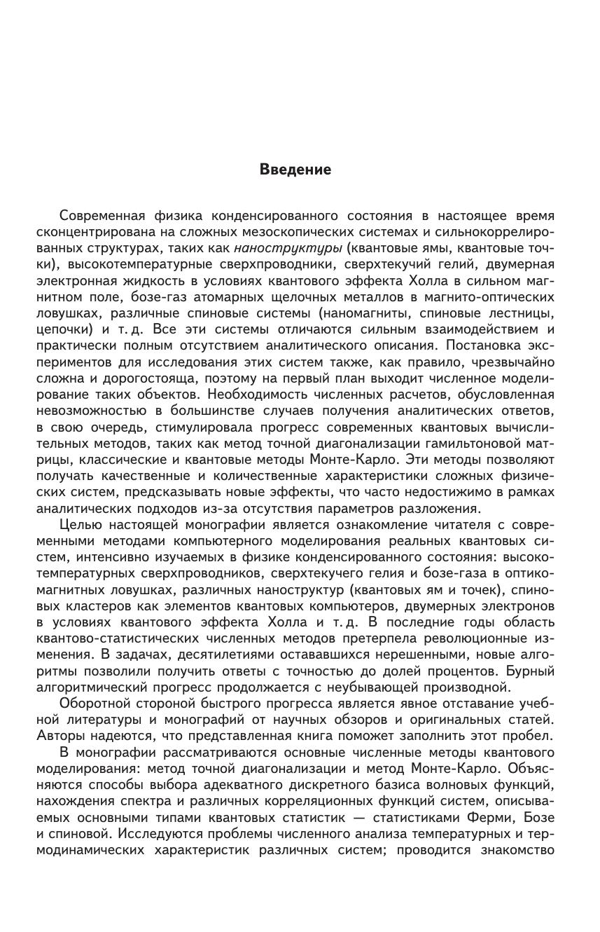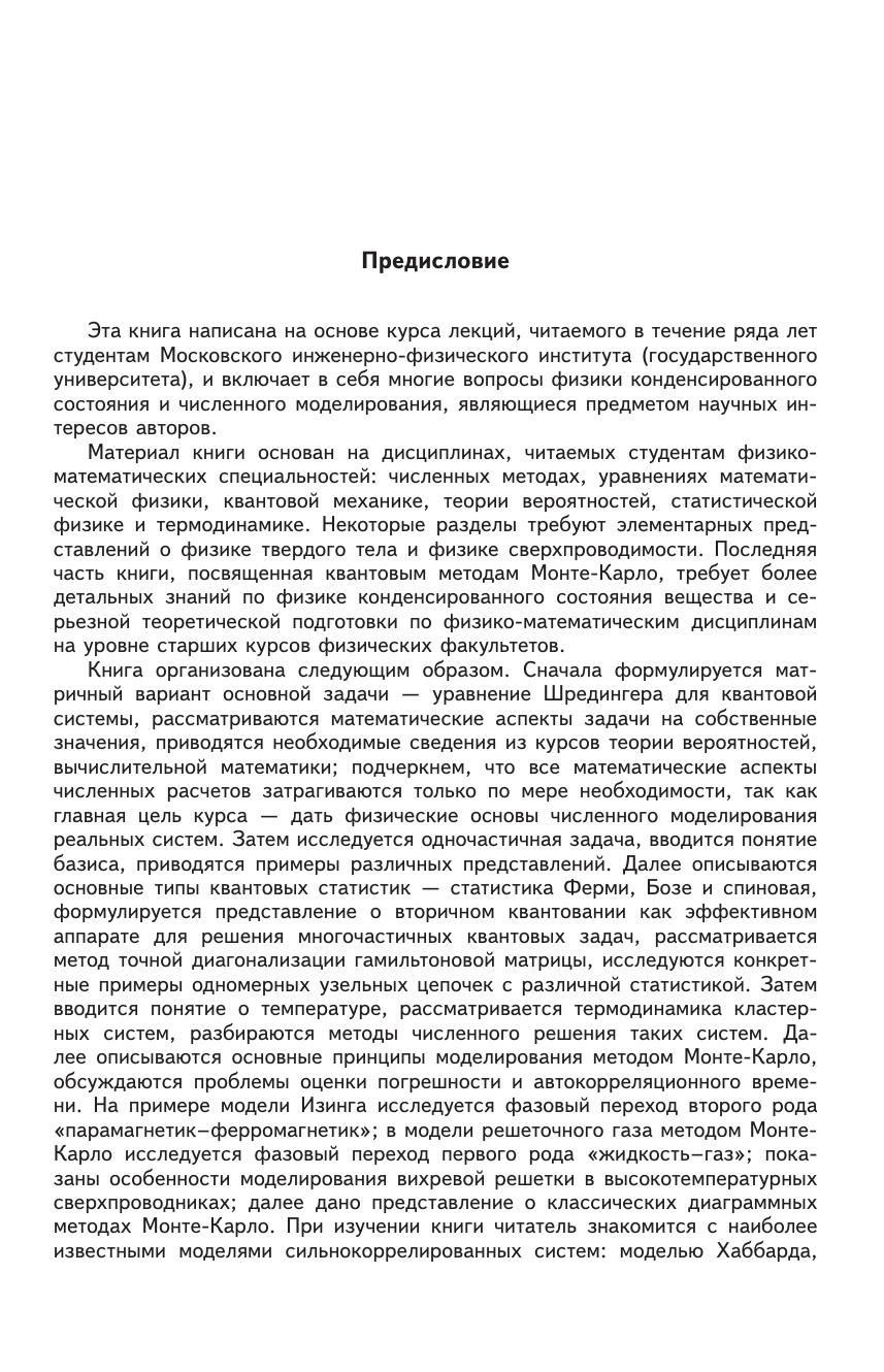 В книге рассмотрены основные численные методы моделирования квантовых физических систем: метод точной диагонализации гамильтоновой матрицы, квантовый и классический методы Монте-Карло. Объяснены способы выбора адекватного дискретного базиса волновых функций, нахождения спектра и различных корреляционных функций систем, описываемых основными типами квантовых статистик — статистиками Ферми, Бозе и спиновой. Исследованы проблемы численного анализа температурных и термодинамических характеристик различных систем проведено знакомство с современными моделями физики коррелированных состояний: различными моделями Хаббарда, Бозе–Хаббарда, спиновыми моделями представлен достаточно полный обзор современных численных квантовых методов Монте-Карло, подробно рассмотрены детали многих современных квантовых алгоритмов, таких, как петлевые, детерминантные и червячные методы, диаграммные методы Монте-Карло. Обсуждены особенности расчета в расширенном фазовом пространстве, методы расчета различных локальных и коллективных свойств физической системы. Монография может быть полезна студентам и аспирантам физических специальностей, а также преподавателям и специалистам, занимающимся физикой конденсированного состояния. Последняя часть книги, посвященная квантовым методам Монте-Карло, предназначена для специалистов, занимающихся моделированием сложных сильно коррелированных квантовых систем.