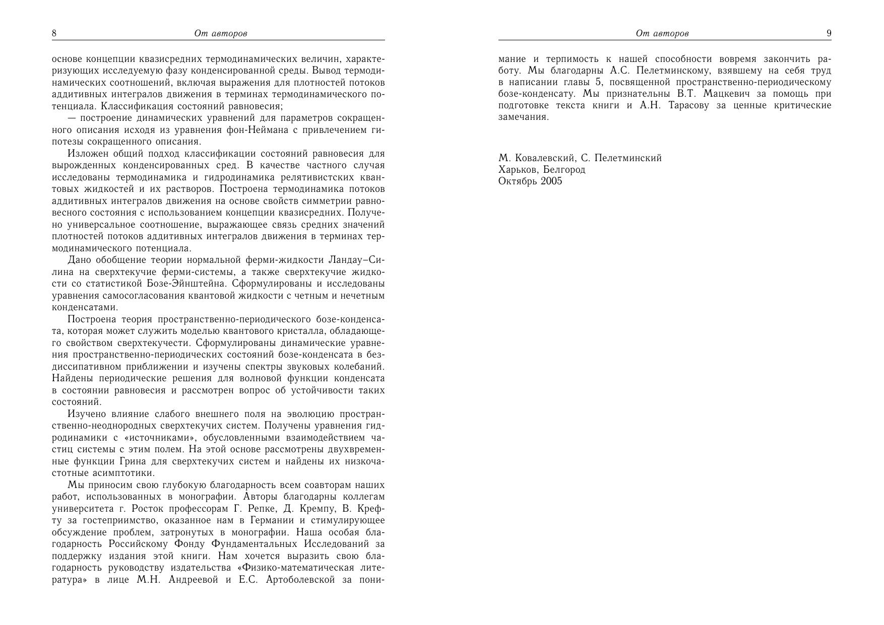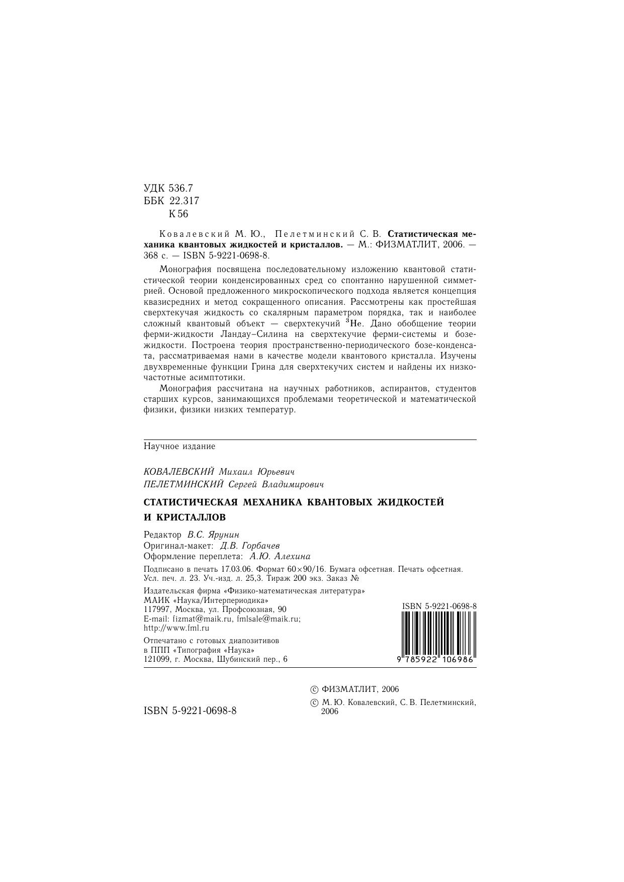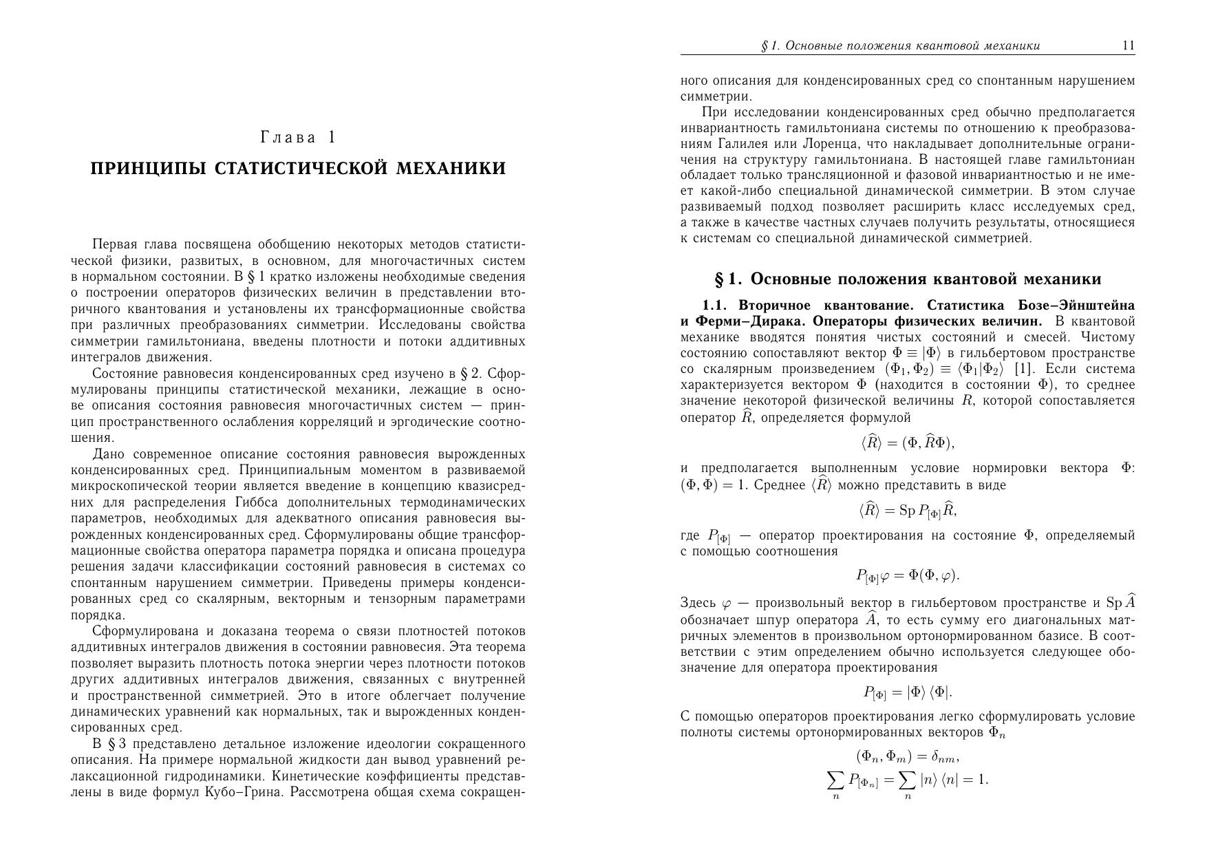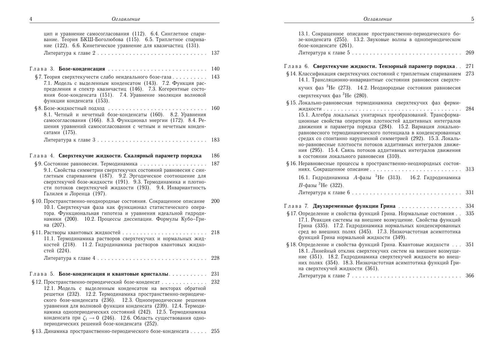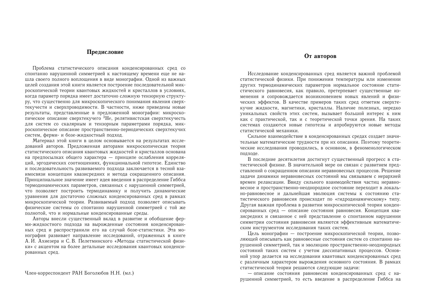 Монографияп освящена последовательному изложению квантовой статистической теории конденсированных сред со спонтанно нарушенной симметрией. Основой предложенного микроскопического подхода является концепция квазисредних и метод сокращенного описания. Рассмотрены как простейшая сверхтекучаяжи дкость со скалярным параметром порядка, так и наиболее сложный квантовый объект — сверхтекучий 3_He. Дано обобщение теории ферми-жидкости Ландау–Силина на сверхтекучие ферми-системы и бозежидкости. Построена теорияп ространственно-периодического бозе-конденсата, рассматриваемаяна ми в качестве модели квантового кристалла. Изучены двухвременные функции Грина дляс верхтекучих систем и найдены их низкочастотные асимптотики. Монографияр ассчитана на научных работников, аспирантов, студентов старших курсов, занимающихсяп роблемами теоретической и математической физики, физики низких температур