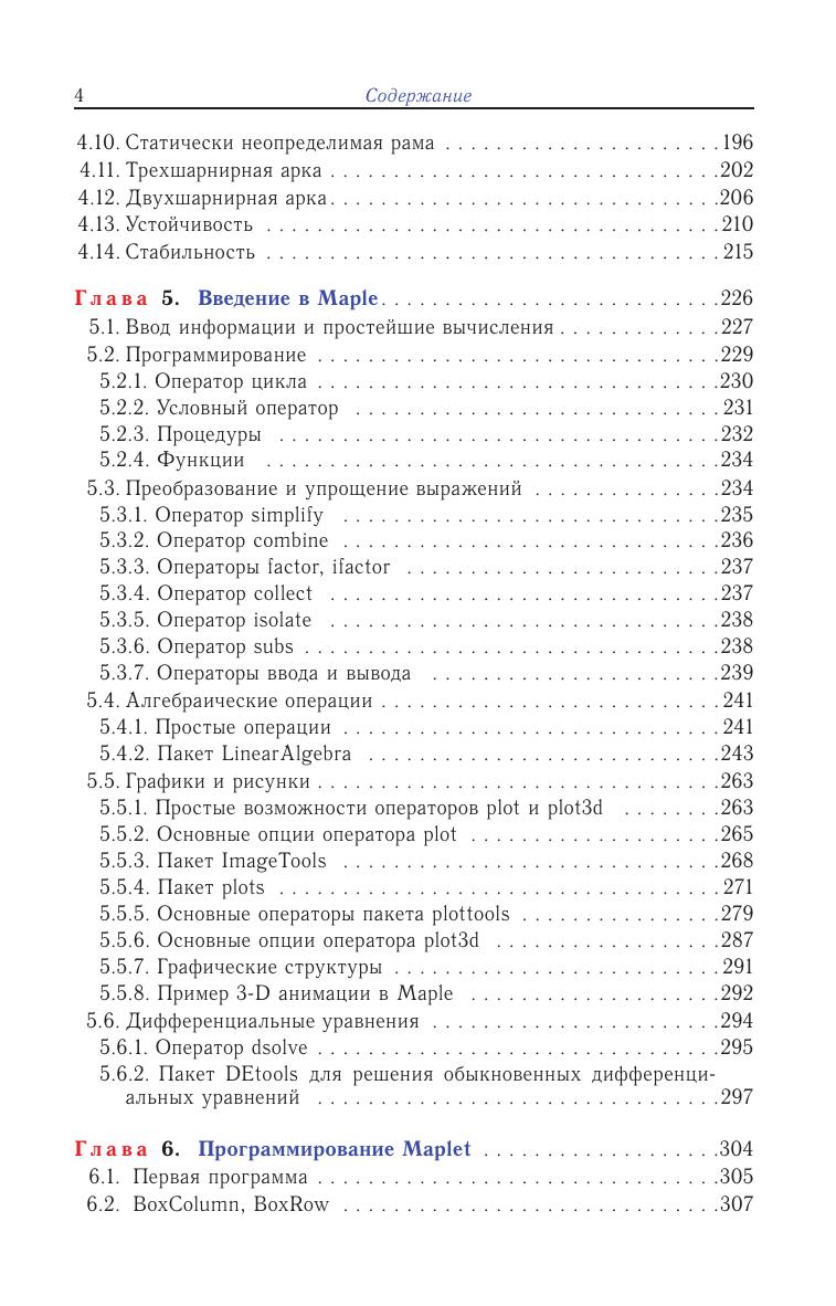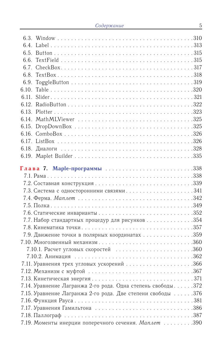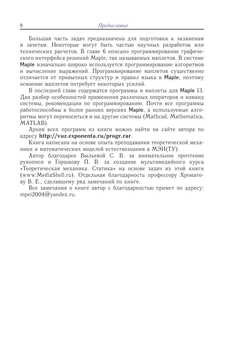 Изложены решения задач по теоретической механике и сопротивлению материалов: определение реакций опор составных конструкций, кинематический анализ многозвенных механизмов, составление уравнений движения в форме Лагранжа, расчет статически неопределимых рам и др. Даны тексты и пояснения к 55 вспомогательным и иллюстративным программам для решения задач в системе Maple, алфавитный предметный и именной указатель к командам и операторам этой системы, содержащий более 1600 имен и терминов. Описаны примеры программирования пользовательского интерфейса Maplet и основные пакеты библиотеки Maple. Программы написаны для Maple 13, но могут быть использованы во всех версиях, начиная с Maple 8. Книга может быть использована как при очной, так и при дистанционной формах обучения. Для студентов и преподавателей университетов и технических вузов.