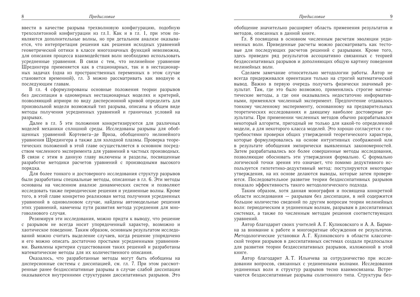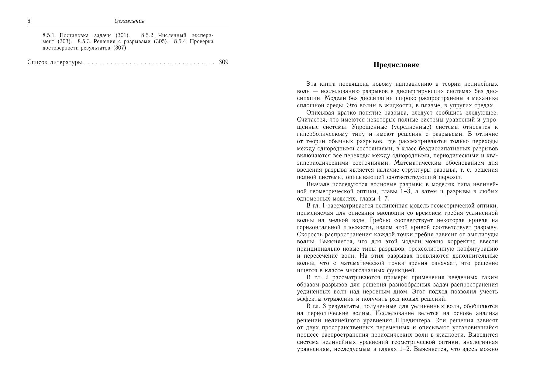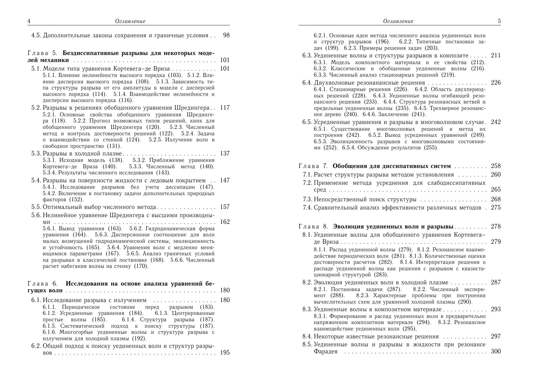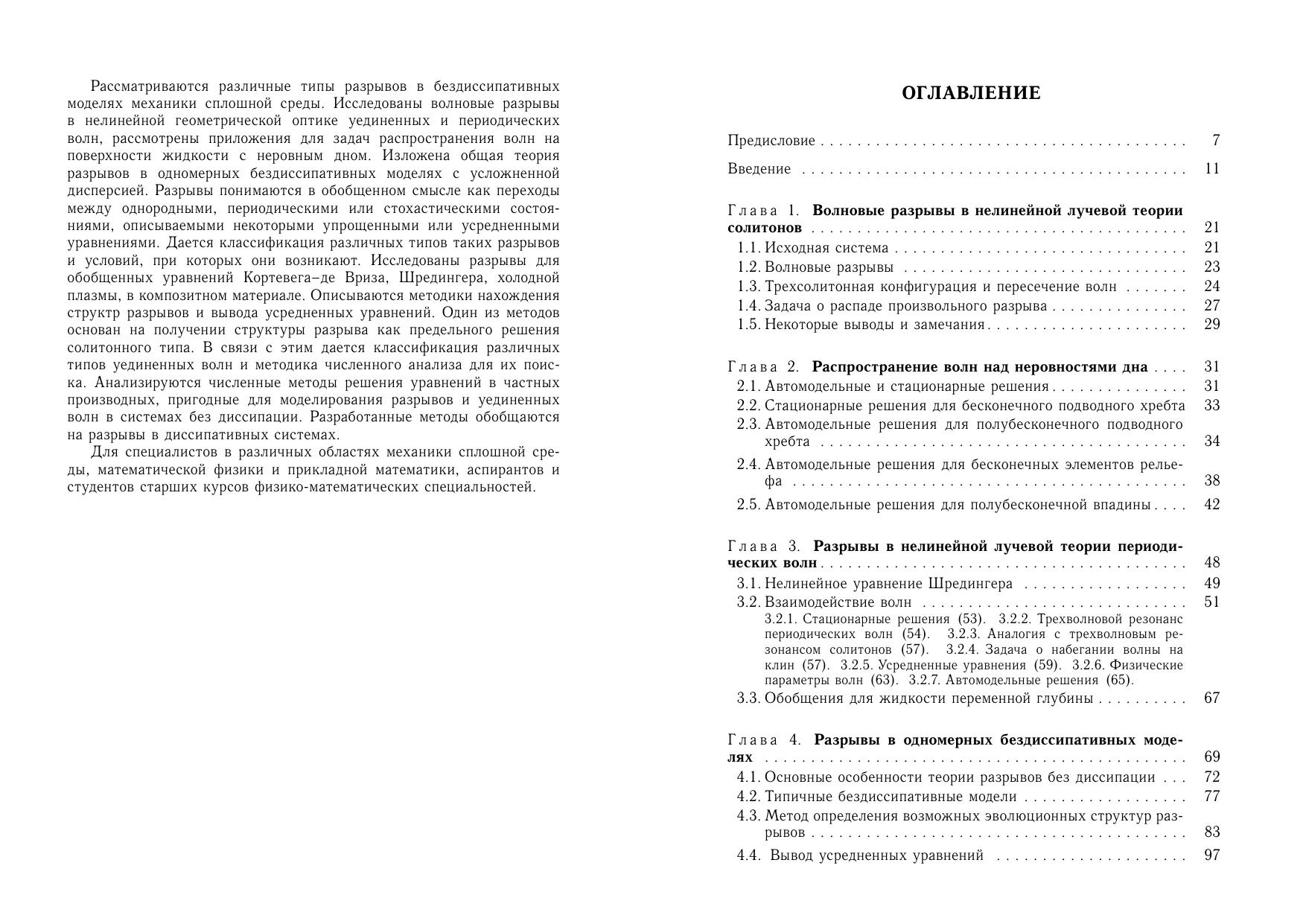 Рассматриваются различные типы разрывов в бездиссипативных моделях механики сплошной среды. Исследованы волновые разрывы в нелинейной геометрической оптике уединенных и периодических волн, рассмотрены приложения для задач распространения волн на поверхности жидкости с неровным дном. Изложена общая теория разрывов в одномерных бездиссипативных моделях с усложненной дисперсией. Разрывы понимаются в обобщенном смысле как переходы между однородными, периодическими или стохастическими состояниями, описываемыми некоторыми упрощенными или усредненными уравнениями. Дается классификация различных типов таких разрывов и условий, при которых они возникают. Исследованы разрывы для обобщенных уравнений Кортевега-де Вриза, Шредингера, холодной плазмы, в композитном материале. Описываются методики нахождения структр разрывов и вывода усредненных уравнений. Один из методов основан на получении структуры разрыва как предельного решения солитонного типа. В связи с этим дается классификация различных типов уединенных волн и методика численного анализа для их поиска. Анализируются численные методы решения уравнений в частных производных, пригодные для моделирования разрывов и уединенных волн в системах без диссипации. Разработанные методы обобщаются на разрывы в диссипативных системах. Для специалистов в различных областях механики сплошной среды, математической физики и прикладной математики, аспирантов и студентов старших курсов физико-математических специальностей.