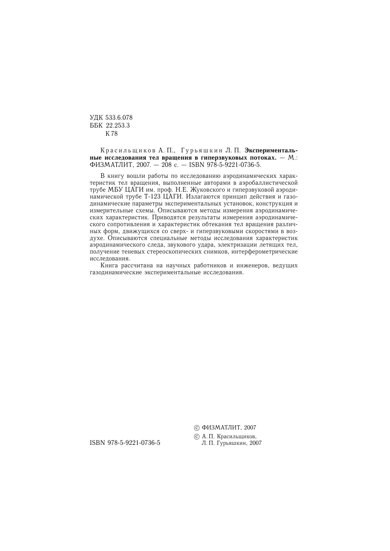 В книгу вошли работы по исследованию аэродинамических характеристик тел вращения, выполненные авторами в аэробаллистической трубе МБУ ЦАГИ им. проф. Н.Е. Жуковского и гиперзвуковой аэродинамической трубе Т-123 ЦАГИ. Излагаются принцип действия и газодинамические параметры экспериментальных установок, конструкция и измерительные схемы. Описываются методы измерения аэродинамических характеристик. Приводятся результаты измерения аэродинамического сопротивления и характеристик обтекания тел вращения различных форм, движущихся со сверх- и гиперзвуковыми скоростями в воздухе. Описываются специальные методы исследования характеристик аэродинамического следа, звукового удара, электризации летящих тел, получение теневых стереоскопических снимков, интерферометрические исследования. Книга рассчитана на научных работников и инженеров, ведущих газодинамические экспериментальные исследования.