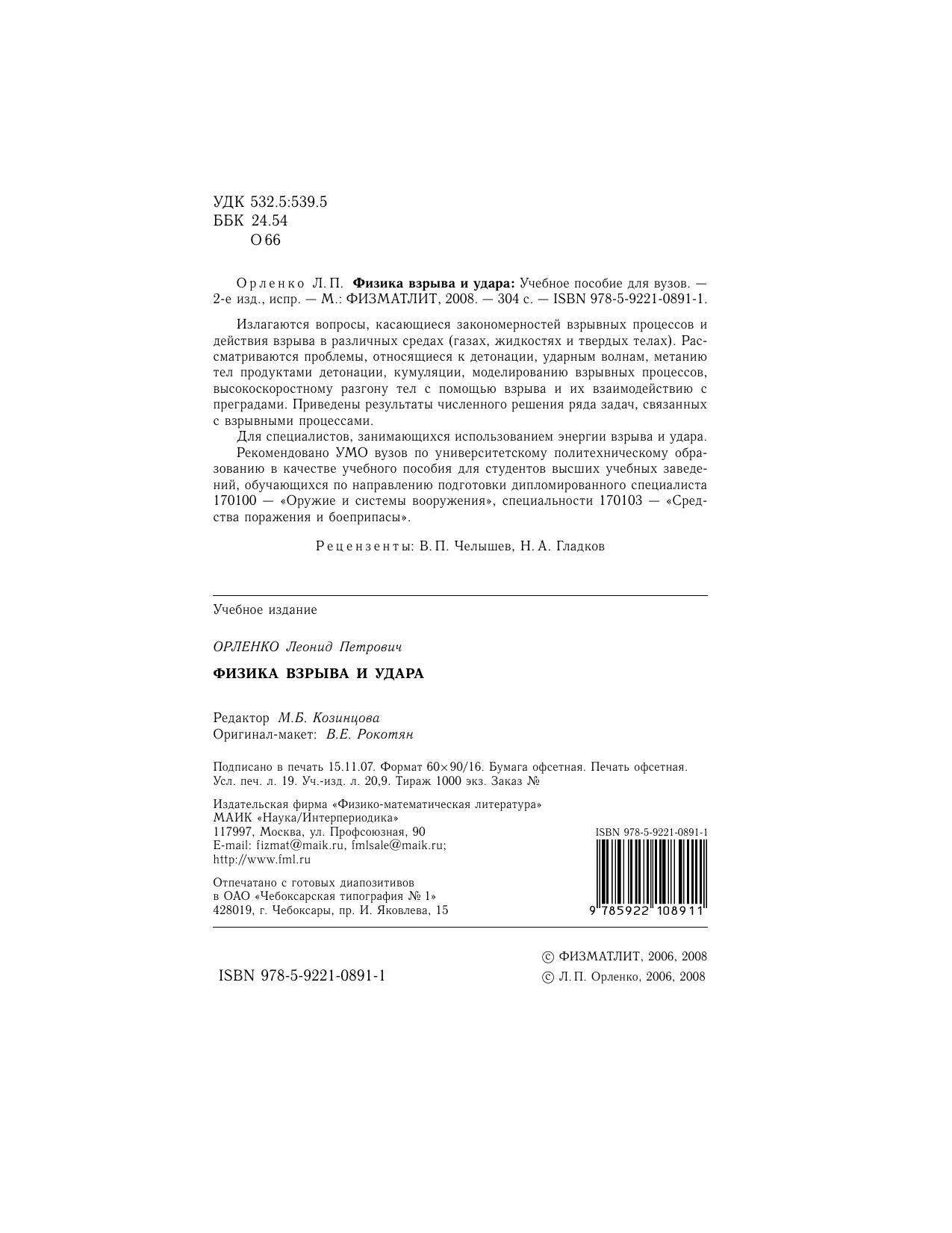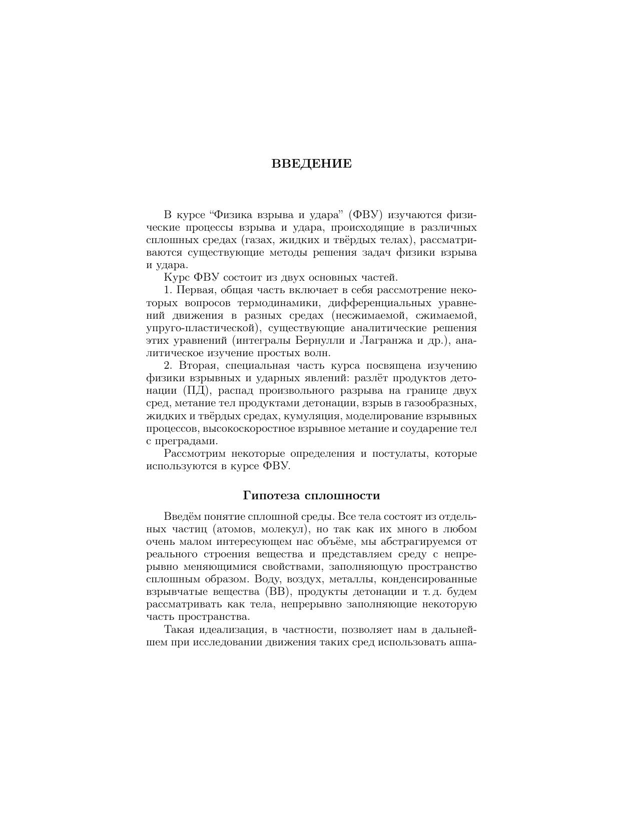 Излагаются вопросы, касающиеся закономерностей взрывных процессов и действия взрыва в различных средах (газах, жидкостях и твердых телах). Рассматриваются проблемы, относящиеся к детонации, ударным волнам, метанию тел продуктами детонации, кумуляции, моделированию взрывных процессов, высокоскоростному разгону тел с помощью взрыва и их взаимодействию с преградами. Приведены результаты численного решения ряда задач, связанных с взрывными процессами. Для специалистов, занимающихся использованием энергии взрыва и удара. Рекомендовано УМО вузов по университетскому политехническому образованию в качестве учебного пособия для студентов высших учебных заведений, обучающихся по направлению подготовки дипломированного специалиста 170100 - "Оружие и системы вооружения", специальности 170103 - Средства поражения и боеприпасы".