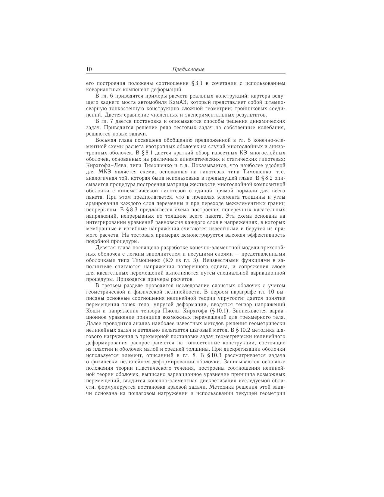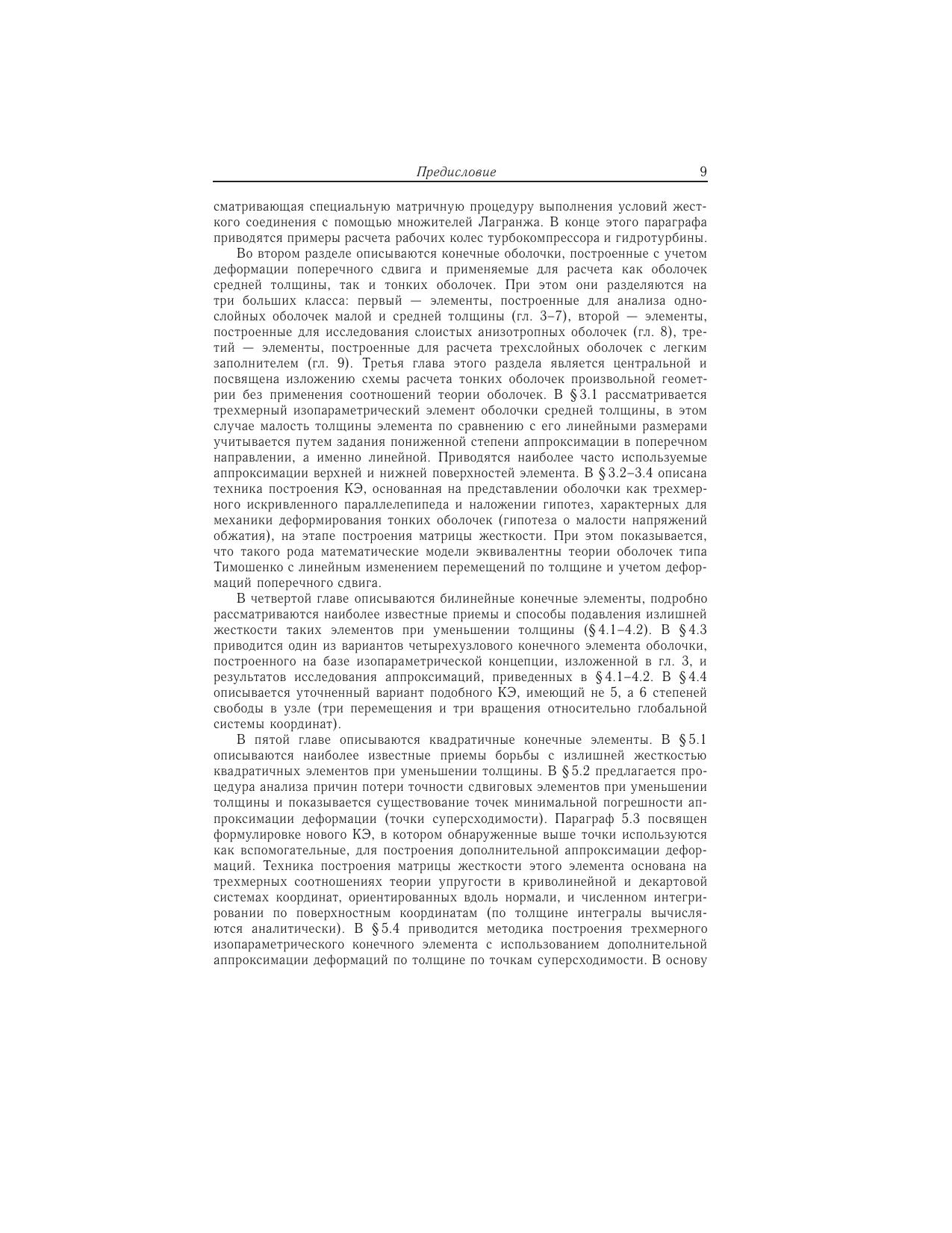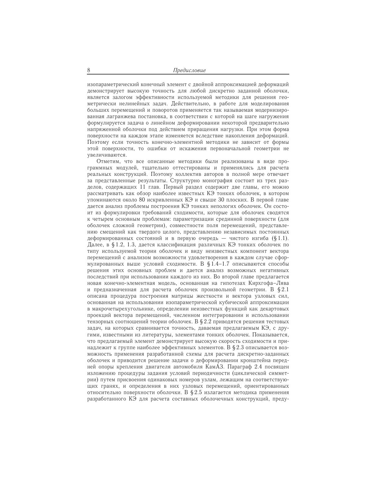 Книга посвящена проблеме построения конечно-элементных моделей оболочек малой и средней толщины. Структурно книга состоит из трех разделов. Первый раздел содержит анализ различных подходов построения конечных элементов тонких непологих оболочек с точки зрения выполнения требований сходимости (совместность, представление смещений как твердого целого и независимых деформируемых состояний). Второй раздел посвящен описанию и детальному анализу конечных элементов оболочек, построенных на основе уравнений трехмерной теории упругости. Предлагается оригинальная методика двойной аппроксимации деформаций по точкам суперсходимости и показывается ее эффективность на многочисленных тестовых примерах. Дается обобщение предложенного 9-узлового конечного элемента с биквадратической изопараметрической аппроксимацией на случай многослойных оболочек из композитных материалов. Приводятся примеры расчета задач статики и динамики реальных конструкций. В третьем разделе разработанный квадратичный конечный элемент распространяется на класс физически и геометрически нелинейных задач. Используется метод пошагового нагружения в форме модифицированной лагранжевой постановки. Для научных и инженерно-технических работников, аспирантов, магистров и студентов старших курсов, занимающихся вопросами применения метода конечных элементов при расчете оболочек малой и средней толщины.