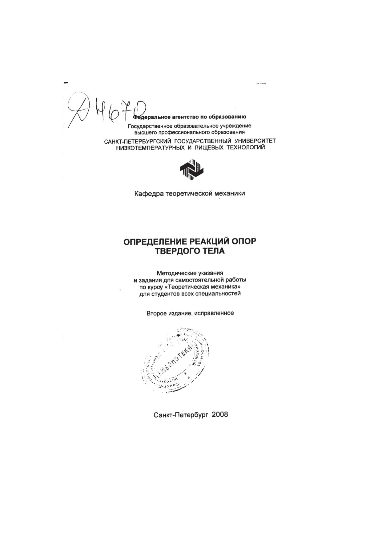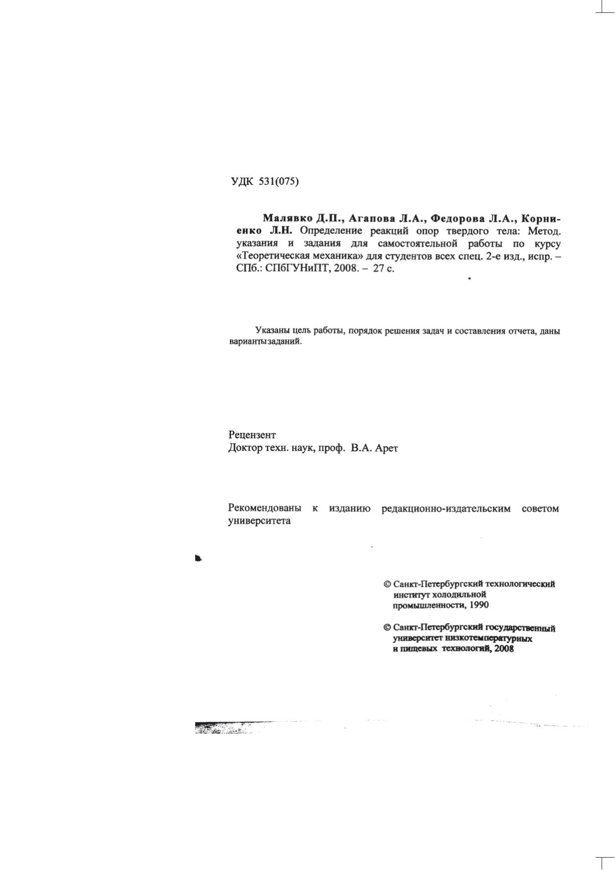 Определение реакций опор твердого тела: Методические указания и задания для самостоятельной работы по курсу «Теоретическая механика» для студентов всех специальностей