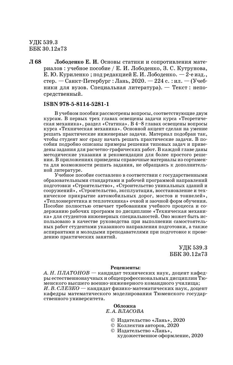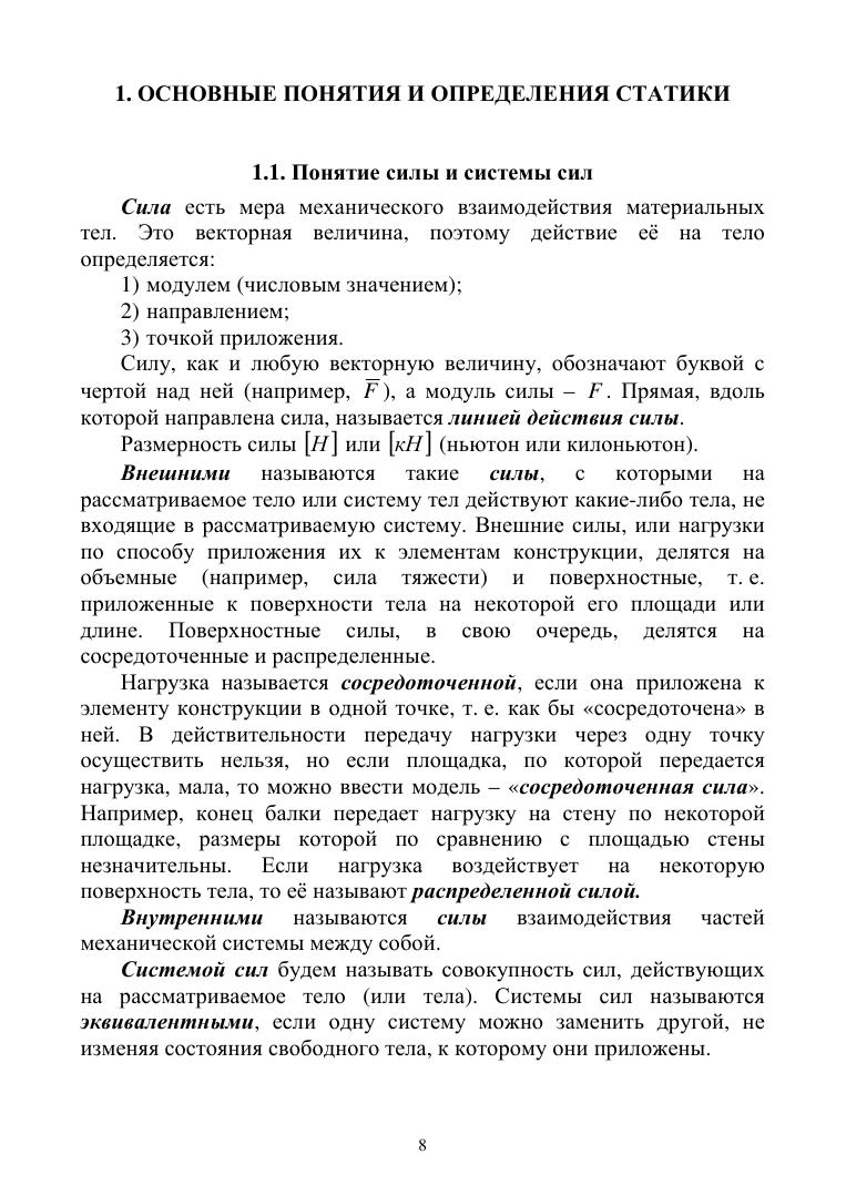 В учебном пособии рассмотрены вопросы, соответствующие двум курсам. В первых трех главах освещены задачи курса «Теоретиче-ская механика» раздел «Статика». В 4–8 главах — вопросы курса «Техническая механика». Основной акцент сделан на умение решать практические инженерные задачи. Материал подобран так, чтобы студент мог сразу начать решать практические задачи. В пособии подробно описаны примеры решения типовых задач и приведены задания для расчетно-графических работ. В каждой главе даны методические указания и рекомендации для более простого решения. В приложениях приведены справочные материалы из сортамента для возможности решать задания, не обращаясь к дополнительной литературе.