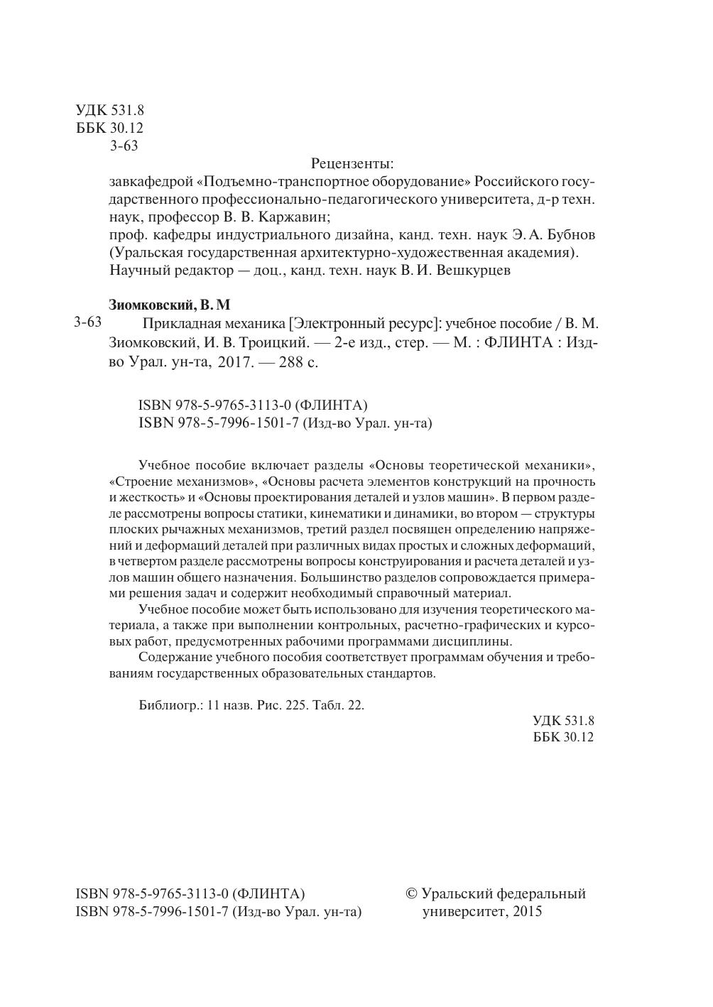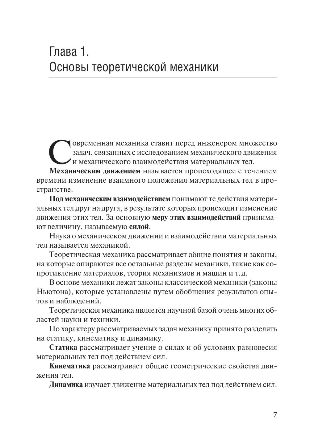 Учебное пособие включает разделы «Основы теоретической механики», «Строение механизмов», «Основы расчета элементов конструкций на прочность и жесткость» и «Основы проектирования деталей и узлов машин». В первом разделе рассмотрены вопросы статики, кинематики и динамики, во втором — структуры плоских рычажных механизмов, третий раздел посвящен определению напряжений и деформаций деталей при различных видах простых и сложных деформаций, в четвертом разделе рассмотрены вопросы конструирования и расчета деталей и узлов машин общего назначения. Большинство разделов сопровождается примерами решения задач и содержит необходимый справочный материал. Учебное пособие может быть использовано для изучения теоретического материала, а также при выполнении контрольных, расчетно-графических и курсовых работ, предусмотренных рабочими программами дисциплины. Содержание учебного пособия соответствует программам обучения и требованиям государственных образовательных стандартов.