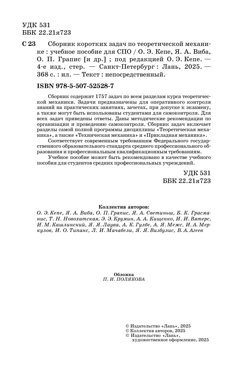 Сборник содержит 1757 задач по всем разделам курса теоретической механики. Задачи предназначены для оперативного контроля знаний на практических занятиях, зачетах, при допуске к экзамену, а также могут быть использованы студентами для самоконтроля. Для всех задач приведены ответы. Даны методические рекомендации по организации и проведению самоконтроля. Сборник задач включает разделы самой полной программы дисциплины «Теоретическая механика», а также «Техническая механика» и «Прикладная механика». Соответствует современным требованиям Федерального государственного образовательного стандарта среднего профессионального образования и профессиональным квалификационным требованиям. Учебное пособие может быть рекомендовано в качестве учебного пособия для студентов средних профессиональных учреждений.