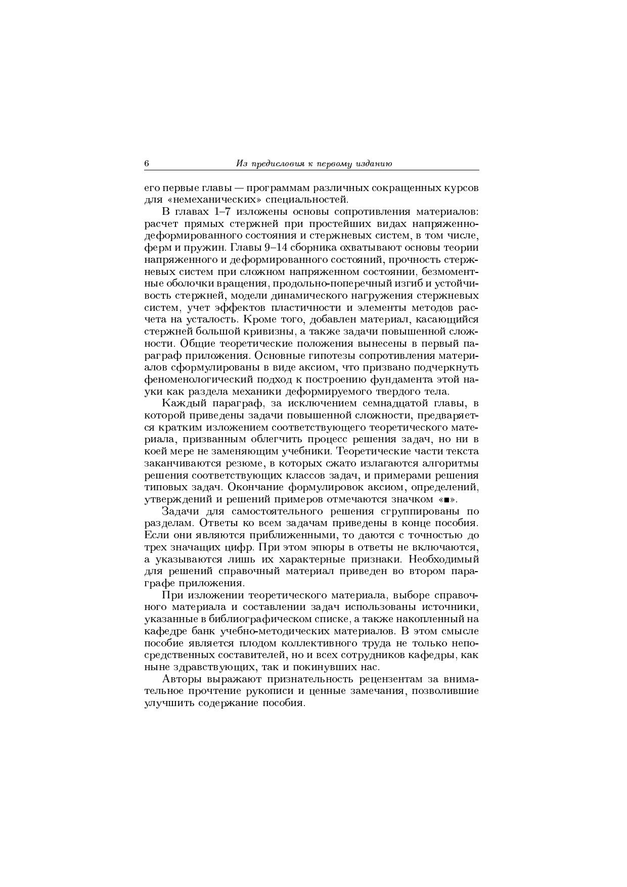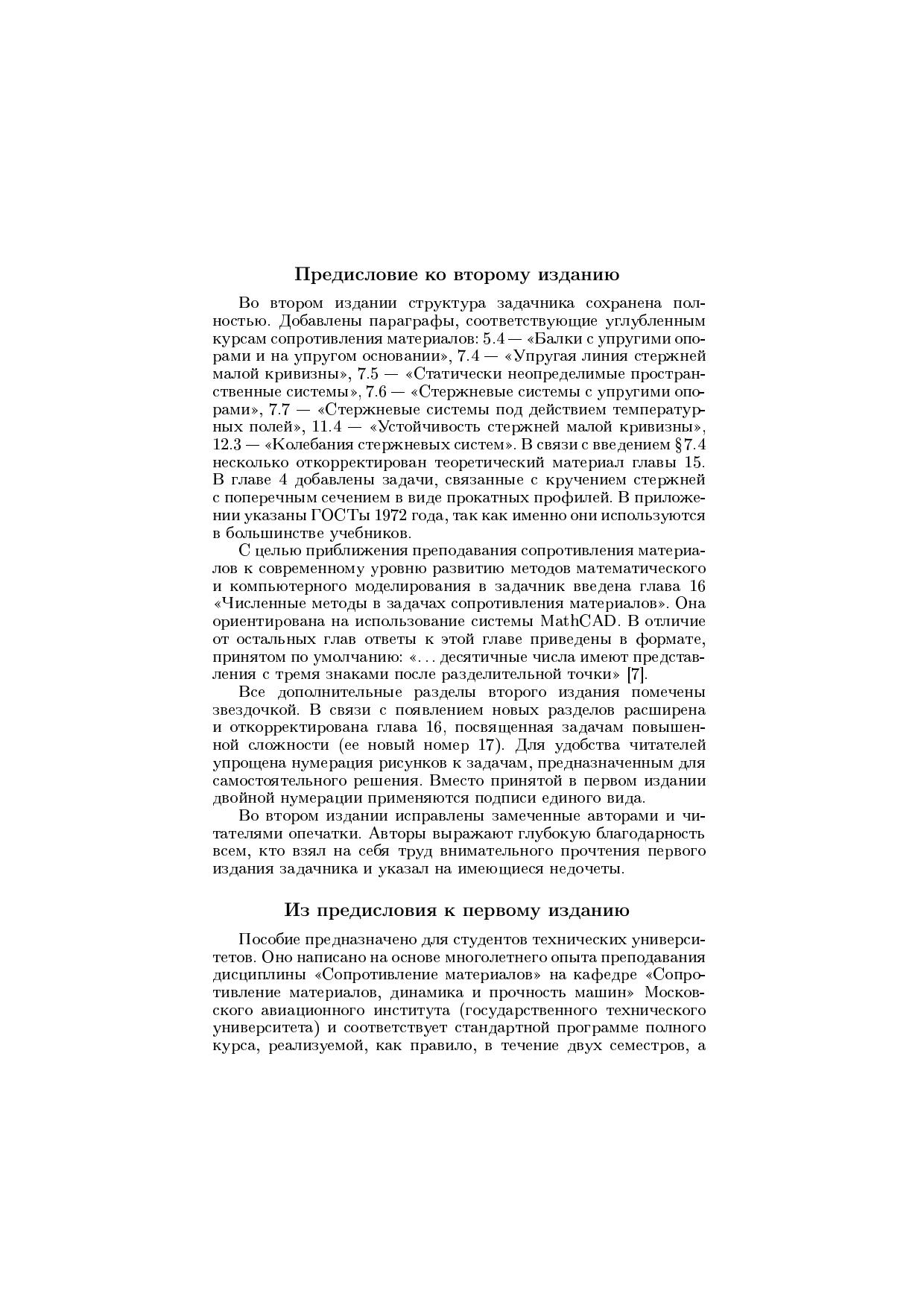 Сборник соответствует стандартной программе полного курса, а его первые главы - программам различных сокращенных курсов сопротивления материалов. Каждый раздел предваряется кратким изложением теоретического материала при этом общие положения вынесены в приложения. Теоретические части разделов заканчиваются резюме, в которых изложены алгоритмы решения соответствующих задач, и типовыми примерами. Задачи для самостоятельного решения сгруппированы по разделам. В заключительной главе приведены задачи повышенной сложности. Необходимый справочный материал указан в приложениях. В данное издание дополнительно включены разделы, посвященные перемещениям в стержнях большой кривизны и их устойчивости, учету упругих опор и оснований, расчету пространственных статически неопределимых рам, колебаниям стержневых систем, а также применению системы компьютерной математики MathCAD для решения задач сопротивления материалов. Кроме того, значительно расширен материал, связанный с температурными деформациями и напряжениями. Для студентов технических университетов.